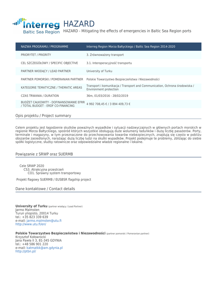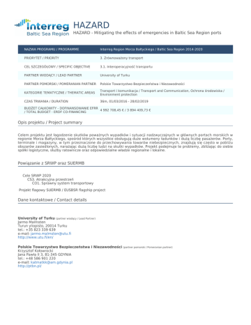 HAZARD HAZARD - Mitigating the effects of emergencies in Baltic Sea Region ports NAZWA PROGRAMU / PROGRAMME Interreg Region Morza Bałtyckiego / Baltic Sea Region 2014-2020 PRIORYTET / PRIORITY 3. Zrównoważony transport CEL SZCZEGÓŁOWY / SPECIFIC OBJECTIVE 3.1. Interoperacyjność transportu PARTNER WIODĄCY / LEAD PARTNER University of Turku PARTNER POMORSKI / POMERANIAN PARTNER Polskie Towarzystwo Bezpieczeństwa i Niezawodności KATEGORIE TEMATYCZNE / THEMATIC AREAS Transport i komunikacja / Transport and Communication, Ochrona środowiska / Environment protection CZAS TRWANIA / DURATION 36m, 01/03/2016 - 28/02/2019 BUDŻET CAŁKOWITY - DOFINANSOWANIE EFRR 4 992 708,45 € / 3 894 409,73 € / TOTAL BUDGET - ERDF CO-FINANCING Opis projektu / Project summary Celem projektu jest łagodzenie skutków poważnych wypadków i sytuacji nadzwyczajnych w głównych portach morskich w regionie Morza Bałtyckiego, spośród których wszystkie obsługują duże wolumeny ładunków i dużą liczbę pasażerów. Porty, terminale i magazyny, w tym przeznaczone do przechowywania towarów niebezpiecznych, znajdują się często w pobliżu obszarów zasiedlonych, narażając dużą liczbę ludzi na skutki wypadków. Projekt podejmuje te problemy, zbliżając do siebie spółki logistyczne, służby ratownicze oraz odpowiedzialne władze regionalne i lokalne. Powiązanie z SRWP oraz SUERMB Cele SRWP 2020 CS3. Atrakcyjna przestrzeń CO1. Sprawny system transportowy Projekt flagowy SUERMB / EUSBSR flagship project Dane kontaktowe / Contact details University of Turku (partner wiodący / Lead Partner) Jarmo Malmsten Turun yliopisto, 20014 Turku tel.: +35 823 339 639 e-mail: jarmo.malmsten@utu.fi http://www.utu.fi/en/ Polskie Towarzystwo Bezpieczeństwa i Niezawodności (partner pomorski / Pomeranian partner) Krzysztof Kołowrocki Jana Pawła II 3, 81-345 GDYNIA tel.: +48 586 901 220 e-mail: [email protected] http://ptbn.pl/