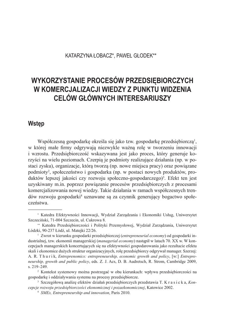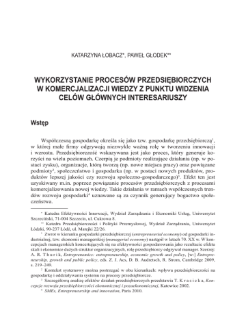KATARZYNA ŁOBACZ*, PAWEŁ GŁODEK** WYKORZYSTANIE PROCESÓW PRZEDSIĘBIORCZYCH W KOMERCJALIZACJI WIEDZY Z PUNKTU WIDZENIA CELÓW GŁÓWNYCH INTERESARIUSZY Wstęp Współczesną gospodarkę określa się jako tzw. gospodarkę przedsiębiorczą1, w której małe firmy odgrywają niezwykle ważną rolę w tworzeniu innowacji i wzrostu. Przedsiębiorczość wskazywana jest jako proces, który generuje korzyści na wielu poziomach. Czerpią je podmioty realizujące działania (np. w postaci zysku), organizacje, którą tworzą (np. nowe miejsca pracy) oraz powiązane podmioty2, społeczeństwo i gospodarka (np. w postaci nowych produktów, produktów lepszej jakości czy rozwoju społeczno-gospodarczego)3. Efekt ten jest uzyskiwany m.in. poprzez powiązanie procesów przedsiębiorczych z procesami komercjalizowania nowej wiedzy. Takie działania w ramach współczesnych trendów rozwoju gospodarki4 uznawane są za czynnik generujący bogactwo społeczeństwa. Katedra Efektywności Innowacji, Wydział Zarządzania i Ekonomiki Usług, Uniwersytet Szczeciński, 71-004 Szczecin, ul. Cukrowa 8. ∗∗ Katedra Przedsiębiorczości i Polityki Przemysłowej, Wydział Zarządzania, Uniwersytet Łódzki, 90-237 Łódź, ul. Matejki 22/26. 1 Zwrot w kierunku gospodarki przedsiębiorczej (entrepreneurial economy) od gospodarki industrialnej, tzw. ekonomii managerskiej (managerial economy) nastąpił w latach 70. XX w. W koncepcjach managerskich koncertujących się na efektywności gospodarowania jako rezultacie efektu skali i ekonomice dużych struktur organizacyjnych, rolę przedsiębiorcy odgrywał manager. Szerzej: A. R. T h u r i k, Entreprenomics: entrepreneurship, economic growth and policy, [w:] Entrepreneurship, growth and public policy, eds. Z. J. Acs, D. B. Audretsch, R. Strom, Cambridge 2009, s. 219–249. 2 Kontekst systemowy można postrzegać w obu kierunkach: wpływu przedsiębiorczości na gospodarkę i oddziaływania systemu na procesy przedsiębiorcze. 3 Szczegółową analizę efektów działań przedsiębiorczych przedstawia T. K r a s i c k a, Koncepcje rozwoju przedsiębiorczości ekonomicznej i pozaekonomicznej, Katowice 2002. 4 SMEs, Entrepreneurship and innovation, Paris 2010. ∗ CZĘŚĆ II. WSPÓŁPRACA UCZELNI WYŻSZEJ I PRZEDSIĘBIORSTW 142 Źródłem wiedzy, która może zostać skomercjalizowana są w głównej mierze uniwersytety1 i korporacje2, które poprzez swoje działania (m.in. w sferze badawczej) tworzą nową wiedzę i generują strumień źródeł okazji rynkowych. Procesy przedsiębiorcze stanowią jeden z głównych mechanizmów umożliwiających przekształcanie nowej wiedzy w wiedzę użyteczną ekonomicznie3. Należy jednak zauważyć znaczące różnice pomiędzy uwarunkowaniami strategicznymi, odnoszącymi się do funkcjonowania uczelni oraz uniwersytetów. Ponieważ stanowią one bezpośrednie otoczenie toczących się procesów przedsiębiorczych, mogą w różny sposób oddziaływać na ich przebieg, a co za tym idzie ‒ podejmować (świadomie lub nieświadomie) również działania nakierowane na ich wsparcie lub ograniczanie. Uzasadnia to znaczenie analizy odnoszącej się do celów organizacji obecnych w procesie, powstają bowiem pytania dotyczące powiązań między celami interesariuszy procesu (tymi tworzącymi okazje rynkowe oraz tymi angażującymi się w ich wykorzystanie) a efektami gospodarczymi. W jakim zakresie są one ze sobą zbieżne, a w jakim rozbieżne? Czy zależności te są takie same, czy różne w zależności od uniwersyteckiego i korporacyjnego kontekstu komercjalizacji? Pytania powyższe wyznaczają cele niniejszego opracowania4. 1. Przedsiębiorczość i proces komercjalizacji wiedzy W ujęciu Schumpeterowskim, przedsiębiorczość jest postrzegana jako aktywna postawa skierowana na wdrażanie nowych pomysłów, aby mogły zaistnieć na rynku i zastąpić dotychczasowe systemy biznesowe, mniej efektywne z punktu widzenia społeczno-gospodarczego. Schumpeter5 wiąże przedsiębiorczość bezpośrednio z nową wiedzą, która – umieszczona w kontekście biznesowym – staje się innowacją. Przedsiębiorczość ma zatem swoje odzwierciedlenie w aktywnym podejmowaniu przedsięwzięć o charakterze gospodarczym (business ventures) i w szczególności dotyczy wykorzystania w nich składników nowej wiedzy. W tym ujęciu przedsiębiorczość opiera się na trzech podstawowych elementach6: Zob. np. S. S h a n e, Academic entrepreneurship. University spin-offs and wealth creation, Cheltenham, UK, Northampton, MA 2004. 2 Zob. np. B. C l a r y s s e et al., Entrepreneurial Origin, Technological Knowledge, and the Growth of Spin-Off Companies, “Journal of Management Studies” 2011, Vol. 48, No. 6, s. 1420– 1442; M. H. M o r r i s et al., Corporate Entrepreneurship and Innovation, Cincinnati, OH 2007. 3 K. Ł o b a c z, Koncepcja oceny procesu komercjalizacji przedsięwzięć gospodarczych w akademickich inkubatorach przedsiębiorczości, rozprawa doktorska, maszynopis powielony, Szczecin 2012. 4 Analiza wykonana w ramach projektu, który został sfinansowany ze środków Narodowego Centrum Nauki przyznanych na podstawie decyzji numer DEC-2011/03/B/HS4/05890. 5 J. A. S c h u m p e t e r, The theory of economic development: an inquiry into profits, capital, credit, interest and the business cycle, London 1934. 6 K. Ł o b a c z, op. cit. 1 Wykorzystanie procesów przedsiębiorczych w komercjalizacji wiedzy 143 –– poszukiwaniu okazji rynkowych i wykorzystywaniu ich poprzez przygotowywanie i wdrażanie nowych ofert rynkowych; –– poszukiwaniu i konfiguracji zasobów7 umożliwiających realizację działań; –– komercjalizację wiedzy w formie nowych rozwiązań, wdrażanych na rynek. Biorąc pod uwagę cechy działań, zdefiniowanych jako przedsiębiorcze, ich wysoką dynamikę oraz definicje samej przedsiębiorczości i przedsiębiorcy, można ich przebieg w gospodarce postrzegać przez pryzmat ujęcia procesowego. M