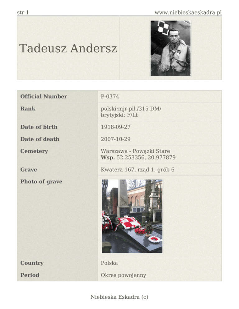 str.1 www.niebieskaeskadra.pl Tadeusz Andersz Official Number P-0374 Rank polski:mjr pil./315 DM/ brytyjski: F/Lt Date of birth 1918-09-27 Date of death 2007-10-29 Cemetery Warszawa - Powązki Stare Wsp. 52.253356, 20.977879 Grave Kwatera 167, rząd 1, grób 6 Photo of grave Country Polska Period Okres powojenny Niebieska Eskadra (c) str.2 www.niebieskaeskadra.pl Source "Polskie Siły Powietrzne..." T.J. i Anna Krzystek Tadeusz Andersz urodził się 27 września 1918 r. w Holandii. 11 listopada 1918 r. powrócił z rodziną do Polski. Uczył się początkowo prywatnie a następnie państwowo. Po zdanych egzaminach maturalnych ukończył kurs pilotów szybowcowych. Następnie zaciągnął się ił do wojska. Odbył kurs unitarny w pułku piechoty w Poznaniu. Aby na początku stycznia 1938 r. rozpocząć przygodę całego życia z lotnictwem w Dęblinie. Nie sądzone było mu walczyć we wrześniu 1939 r. Został ewakuowany jak większość rocznika XIII promocji do Rumunii. Po przekroczeniu granicy trafił do obozu internowania. Uciekł z tego. Przez Jugosławię dotarł do Grecji. Następnie na pokładzie statku dopłynął do Marsylii. We Francji przebywał w Lyon - Bron,. Z tego został przeniesiony do Rennes. Zdobył umiejętności pilotażu na samolotach francuskich. Niestety i tym razem się nie nawojował. Miał za sobą tylko jeden lot bojowy. Po kapitulacji Francji dotarł do Bordeaux. Z tego portu na pokładzie statku dopłynął do Wielkiej Brytanii. Na Wyspie Ostatniej Nadziei zapoznał się z samolotami jakimi dysponował RAF. Szkolenie myśliwskie ukończył w 56 OTU. Z początkiem czerwca 1941 r. został przydzielony do 315 Dywizjonu "Dęblińskiego". Mógł teraz latać bojowo razem z rodakami. 4 kwietnia 1943 r. zestrzelił wrogiego FW 190. Po śmierci dowódcy eskadry objął jej dowodzenie. Dowodził nią do połowy listopada 1943 r. Wtedy został przeniesiony do 61 OTU na stanowisko instruktora. 9 marca 1944 r. powrócił do latania bojowego. Aby przejść od tego do 61 Fighter Squadron w 56 Fighter Group 8 Armii Powietrznej Stanów Zjednoczonych,. Razem z Amerykanami rozpoczął loty bojowe na P - 47 Thunderbolt. Nie był jedynym Polakiem. Latał między innymi z Aleksandrem Gabszewiczem i Bolesławem Gładychem. 9 kwietnia 1944 r. poleciał w osłonie "Latających Fortec" nad Kilonię. Doszło do spotkania z wrogiem. W efekcie tego zestrzelił Bf 109. Po odejściu z 8 Armii został skierowany do 84 GSU. 19 sierpnia 1944 r. został pilotem 315 dywizjonu. Objął jego dowodzenie po poległym kapitanie Horbaczewskim. 21 lutego 1945 r. poprowadził dywizjon nad Osnabrück. Tu zwiększył swoje konto zestrzeleń. 5 kwietnia 1945 r. odszedł z dywizjonu do sztabu Fighter Command. Z tego został przydzielony do sztabu 12 Grupy Myśliwskiej. Od września 1945 r. studiował w Wyższej Szkole Lotniczej. Po jej skończeniu w kwietniu 1946 r. skierowany został do personelu bazy w Coltishall. 4 maja 1946 r. został ostatnim dowódcą 306 Dywizjonu Myśliwskiego "Toruńskiego". Do wyzwolonej Polski nie wrócił. W dwa lata po wojnie został pilotem RAF. Do przejścia w stan spoczynku w 1973 r. pracował jako pilot transportowy i kontroler naziemny. Mieszkał w Londynie. Działał społecznie w Stowarzyszeniu Lotników Polskich. Pełnił funkcję podsekretarza stanu w Ministerstwie Informacji RP. Po 1989 r. gościł często w nowej Polsce. 4 września 1992 r. był członkiem pocztu podczas przekazania sztandaru lotniczego do WLOP. 3 września 2004 r. odsłonił w Krakowie tablicę ku czci lotników poległych w lotach ze zrzutami do Polski. 7 maja 2005 r. otrzymał stopień generała brygady. W sierpniu 2007 r. był gościem Światowego Zjazdu Lotników Polskich w Warszawie. Zmarł w Londynie 29 października 2007 r.. Pochowany został w Warszawie na Cmentarzu Powązkowskim. Opracowanie: Konrad RYDOŁOWSKI Niebieska Eskadra (c)