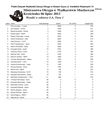 Mistrzostwa Okr gu w W dkarstwie Muchowym FINAL Kro cienko 06 lipiec 2013 Wyniki w sektorze I-A, Tura 1 * "! "# $%&' * 0 $&' % 0)*1 0 &'' % &&' + ",- .!/ 2 3"4156 37! & "8# & 0 & 9 : ,;# 36!=< >?< @ $ 0 & &&*)' 0 &)($ &A& 2 BCD 37 7#36!-FE8# $ &*0 ' 0 &%* &'0 ' 0 0-$ ( HG JIK 385L 8#"!-3M # + #;N? F! % % &''' 0 0 &D & *)$*)' A *0 %' ' #: 5. 7#! 2 FN?F ) 3?! * # O3 B 4= #8# + 36!-: 3 ' ***)' & &$% C G E#FNEG!- D 8*P2 E# L!- 38 *18*)' & &&' 8* %&' * &A' &RQ # 41) F!< >?< @ 70 CD # 2 8B 5?37! #)38 & %'' * &)($ 70 $0 ' * &%' $ N# 5 Q #E .! $ 70 &' %S+ E#UT. 7#36! #)3VB (XW 3 2 #! * % 700 ' ( 700 ' &Y2 W ! *)Z 3 ARQ 5[1 > # G# F! * 8% A 4= #8# ;T" 5L 8#! * #)38 & (%' &** A (*)' &D' A (*)' *1\Q 5]T" # 8#36! ( 3 ** CD # 7#36!-3 *1 %%' &' ' ' ' ** &' ' ' ' **^Q 5[>_ ):"!B G ** 4= #8# ;`" )36!D : &' ' ' &' ' ' ' **P2 baD E8#!;#8# **P2 3 F! * &' ' ' ' &' ' ' ** &' ' ' &' ' % & A 4= #8# Q #8# 36! #)38 4 F F!< >?< @ 1 **P9 c )!=< >?< @ ( 0 *)%& & * 0)*)' &D& * &0 $ * &*0 &D' * ($ ' ' d ' ' '