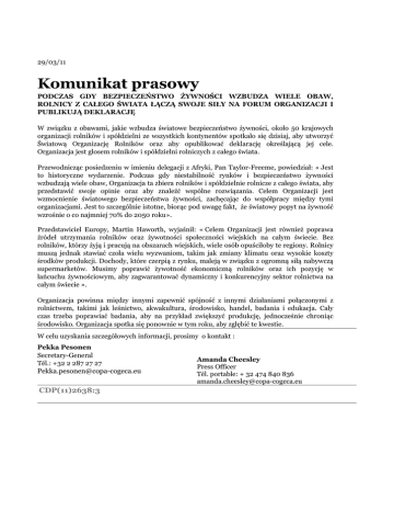 29/03/11 Komunikat prasowy PODCZAS GDY BEZPIECZEŃSTWO ŻYWN OŚCI WZBUDZA WIELE OBAW, ROLN ICY Z CAŁEGO ŚWIATA ŁĄCZĄ SWOJE SIŁY N A FORUM ORGAN IZACJI I PUBLIKUJĄ DEKLARACJĘ W związku z obawami, jakie wzbudza światowe bezpieczeństwo ży wności, około 50 krajowy ch organizacji rolników i spółdzielni ze wszystkich kontynentów spotkało się dzisiaj, aby utworzyć Światową Organizację Rolników oraz aby opublikować deklarację określającą jej cele. Organizacja jest głosem rolników i spółdzielni rolniczych z całego świata. Przewodnicząc posiedzeniu w imieniu delegacji z Afryki, Pan Taylor-Freeme, powiedział: « Jest to history czne wy darzenie. Podczas gdy niestabilność ry nków i bezpieczeństwo ży wności wzbudzają wiele obaw, Organizacja ta zbiera rolników i spółdzielnie rolnicze z całego świata, aby przedstawić swoje opinie oraz aby znaleźć wspólne rozwiązania. Celem Organizacji jest wzmocnienie światowego bezpieczeństwa ży wności, zachęcając do współpracy między ty mi organizacjami. Jest to szczególnie istotne, biorąc pod uwagę fakt, że światowy popyt na żywność wzrośnie o co najmniej 70% do 2050 roku». Przedstawiciel Europy , Martin Haworth, wy jaśnił: « Celem Organizacji jest również poprawa źródeł utrzy mania rolników oraz ży wotności społeczności wiejskich na cały m świecie. Bez rolników, którzy żyją i pracują na obszarach wiejskich, wiele osób opuściłoby te regiony. Rolnicy muszą jednak stawiać czoła wielu wy zwaniom, takim jak zmiany klimatu oraz wy sokie koszty środków produkcji. Dochody, które czerpią z rynku, maleją w związku z ogromną siłą nabywczą supermarketów. Musimy poprawić ży wotność ekonomiczną rolników oraz ich pozy cję w łańcuchu ży wnościowy m, aby zagwarantować dy namiczny i konkurency jny sektor rolnictwa na całym świecie ». Organizacja powinna między inny mi zapewnić spójność z inny mi działaniami połączony mi z rolnictwem, takimi jak leśnictwo, akwakultura, środowisko, handel, badania i edukacja. Cały czas trzeba poprawiać badania, aby na przy kład zwiększy ć produkcję, jednocześnie chroniąc środowisko. Organizacja spotka się ponownie w tym roku, aby zgłębić te kwestie. W celu uzyskania szczegółowych informacji, prosimy o kontakt : Pekka Pesonen Secretary-General Tél.: +32 2 287 27 27 [email protected] CDP(11)2638:3 Amanda Cheesley Press Officer Tél. portable: + 32 474 840 836 [email protected]