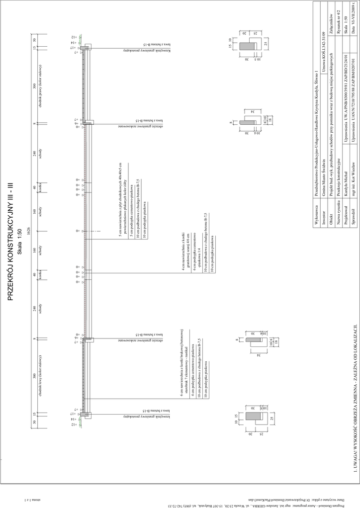 20 Program Domino4 - Autor programu: mgr inŜ. Jarosław GIERBA , ul. Wesoła 23/20, 15-307 Białystok, tel. (085) 742-72-33 25 10 15 +12 strona 1 z 1 Dane wczytano z pliku: D:\Projektowanie\Domino4\PlacKonst3.dan +14 krawęŜnik granitowy prostokątny +17 +7 8 10 cm podsypka piaskowa 10 8 18 8 10 cm podbudowa z chudego betonu B-7,5 4 cm podsypka cementowo-piaskowa 6 cm nawierzchnia z kostki brukowej betonowej starobruk 7 elementowy - rustikal chodnik lewy (kolor stalowy) 300 schody 240 kostka 40 +0 schody 160 1626 schody 160 kostka 40 +0 +0 +0 10 cm podsypka piaskowa 10 cm podbudowa z chudego betonu B-7,5 5 cm podsypka cementowo-piaskowa 5 cm nawierzchnia z płyt chodnikowych 40x40x5 cm powierzchniowo płukanych kolor Ŝółty 10 cm podsypka piaskowa 8 15 50 Projekt bud.-wyk. przebudowy schodów przy pomniku wraz z budową miejsc parkingowych Przekroje konstrukcyjne Kurdyła Michał mgr inŜ. Kot Wiesław Obiekt Nazwa rysunku Projektował Sprawdził 25 15 10 Uprawnienia UAN/N/7210/795/88 ZAP/BM/0207/01 Uprawnienia UW.A/PNB/8300/39/81 ZAP/BD/2124/01 Data VI-VII.2009 r. Skala 1:50 Rysunek nr 4/2 Załączników Umowa KOŚ.I.342-31/09 Gmina Miasto Świdwin Inwestor 8 10 18 8 chodnik prawy (kolor stalowy) 300 Przedsiębiorstwo Produkcyjno-Usługowo-Handlowe Krystyna Kurdyła, Śliwno 1 schody 240 34 Wykonawca 10 cm podbudowa z chudego betonu B-7,5 6 cm podsypka cementowo -piaskowa 1:4 4 cm nawierzchnia z kostki granitowej szarej 4/6 cm +0 +0 15 34 +0 +0 50 obrzeŜe granitowe zeskosowane +0 +6 +7 ława z betonu B-15 +0 Skala 1:50 +12 PRZEKRÓJ KONSTRUKCYJNY III - III KrawęŜnik granitowy prostokątny +7 +17 +14 ława z betonu B-15 +7 +6 +0 obrzeŜe granitowe zeskosowane 1. UWAGA! WYSOKOŚĆ OBRZEśA ZMIENNA - ZALEśNA OD LOKALIZACJI. 25 30 10 4 ława z betonu B-15 30 10 5 30 10 5 ława z betonu B-15 30 10 4 20 25
