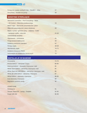 WSTĘP Pompy do masaży wodnych Cala – NewBCC – Atlas 57 Dmuchawy , Dodatki do pomp 58 SKRZYNKI STERUJĄCE Sterownik CosmoDos – Pool Consulting – Tebas – AS Control – Zbiornika przelewowego 59 BADU Logic – Sterowniki pneumatyczne i piezo Włączniki pneumatyczne i piezo dotykowe 60 Basen z rynną – gotowe rynny – odpływy – kratki - kamienie i grille – zbiorniki 61-64 OGRZEWANIE BASENU Ogrzewanie – omówienie 65 Podgrzewacze elektryczne 66 Kolektory słoneczne standard 67 Pompy ciepła 68-69 Wymienniki ciepła 70-71 Kolektory słoneczne PROFI 72 Automatyka do kolektorów słonecznych 73 INSTALACJE W BASENIE Omówienie 74-79 Bronze Edition – elementy z brązu 80-84 Diamond Edition - elementy z tworzywa i stali 85 White-Steel Edition – elementy z tworzywa i stali 85 White-Steel de LUXE Edition – elementy z tworzywa i stali 86 White de LUXE Edition – elementy z tworzywa 87 White Edition – elementy z tworzywa 88-89 Inne elementy z tworzywa 89 Regulatory poziomu wody 90 OŚWIETLENIE 4 Omówienie 91 Żarówki TebasLED - Lampy – Dodatki 92-95 Power LED 24V 96-99