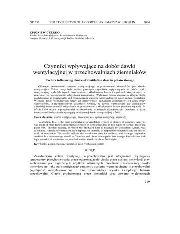NR 232 BIULETYN INSTYTUTU HODOWLI I AKLIMATYZACJI ROŚLIN 2004 ZBIGNIEW CZERKO Zakład Przechowalnictwa i Przetwórstwa Ziemniaka Instytut Hodowli i Aklimatyzacji Roślin, Oddział Jadwisin Czynniki wpływające na dobór dawki wentylacyjnej w przechowalniach ziemniaków Factors influencing choice of ventilation dose in potato storage Głównym parametrem systemu wentylacyjnego w przechowalni ziemniaków jest dawka wentylacyjna. Celem pracy była analiza głównych czynników wpływających na dobór dawki wentylacyjnej w dwóch typach przechowalni o składowaniu luzem i w paletach skrzyniowych w zależności od intensywności oddychania ziemniaków. Wyliczono bilans cieplny, w którym ciepło produkowane w przechowalni jest równoważone ciepłem odprowadzanym przez system wentylacji. Wielkość dawki wentylacyjnej zależy od intensywności oddychania ziemniaków i od czasu pracy wentylatorów. Z przedstawionych zależności wynika, że dawka wentylacyjna dla ziemniaków o średniej intensywności oddychania w przechowalni o składowaniu luzem powinna wynosić 78 m3/t⋅h i 116 m3/t⋅h w przechowalni o składowaniu w paletach skrzyniowych. Odmiany o dużej intensywności oddychania wymagają zwiększonej dawki wentylacyjnej o 20%. Słowa kluczowe: dawka wentylacyjna, przechowalnia, system wentylacji, ziemniak Ventilation dose is the main parameter of a ventilation system in storage of potatoes. Analysis was made of main factors influencing selection of ventilation dose in two types of storage: loose and pallet box. Thermal balance, in which the produced heat is balanced by ventilation system, was calculated. Amount of ventilation dose depends on intensity of respiration of potatoes and on time of work of ventilation. The results indicate that ventilation dose for cultivars with average respiration cultivars in a loose storage should be 78 m3/t⋅h and 116 m3/t⋅h in pallet box storage. For cultivars with high intensity of respiration the ventilation dose should be about 20% higher. Key words: potato, storage, ventilation dose, ventilation system WSTĘP Zasadniczym celem wentylacji w przechowalni jest utrzymanie wymaganej temperatury przechowywania przez odprowadzenie ciepła przez system wentylacji przy zachowaniu jak najniższych ubytków naturalnych. Wielkość zastosowanej dawki wentylacyjnej jako najistotniejszego parametru systemu wentylacyjnego w przechowalni (wydajność wentylatorów na 1 tonę ziemniaków), wynika z cieplnego bilansu przechowalni. Ciepło produkowane przez ziemniaki oraz zawarte w elementach 219 Zbigniew Czerko przechowalni musi być odprowadzone przez system wentylacji. Najwięcej ciepła powstaje w ziemniakach podczas oddychania, które zależy głównie od odmiany, temperatury ziemniaków, fazy przechowywania (Frydecka-Mazurczyk, 1982; Burton, 1987). Inne elementy biorące udział w przepływie ciepła to wymiana ciepła przez przegrody, pojemność cieplna wyposażenia przechowalni i ziemniaków, ciepło produkowane przez wentylatory. Ilość ciepła odprowadzana przez system wentylacji zależy od dawki wentylacyjnej i czasu pracy wentylatorów oraz parametrów wentylowanego powietrza. W całym sezonie przechowalniczym okres schładzania wymaga największej intensywności wietrzenia, gdyż występuje potrzeba odprowadzenia największego ciepła oddychania ziemniaków oraz wychłodzenia ziemniaków i obiektu wraz z wyposażeniem (Czerko, 1993). Schładzanie zachodzi najczęściej od temperatury około 15°C do temperatury długotrwałego przechowywania 3–8°C (zależnie od kierunku użytkowania ziemniaków). Przy doborze dawki wentylacyjnej istnieje możliwość wyboru między dużą wydajnością i krótkim czasem wietrzenia a mniejszą wydajnością i długim czasem wietrzenia. Wysoka dawka wentylacyjna i krótki czas wentylacji umożliwiają lepsze wykorzystanie warunków zewnętrznych (atmosferycznych) do wentylacji przechowalni. W Polsce zalecana dawka wentylacyjna wynosi średnio 90 m3/t⋅h. Jednak budowane w ostatnich latach przechowalnie mają system wentylacyjny, w których dawka wynosi od 18 m3/t⋅h do 120 m3/t⋅h. Podczas projektowania nowych przechowalni problem dawki wentylacyjnej jest najgoręcej dyskutowany, gdyż brakuje pełnych danych a nadmierne zwiększenie dawki wentylacyjnej wymaga większych przekrojów kanałów wentylacyjnych oraz klap, które znacznie podnoszą koszty budowy. Z drugiej strony zastosowanie niższych dawek wymaga wydłużenia czasu wietrzenia wpływającego na wzrost ubytków naturalnych. Celem pracy była analiza głównych czynników wpływających na dobór dawki wentylacyjnej w dwóch typach przechowalni o składowaniu luzem i w paletach skrzyniowych. METODYKA Wyliczenie dawki wentylacyjnej oparto na bilansie przechowalni (Rostovski, 1981). Q pr = Qz + Q f + Q p + Qw Q pr = Qod przy czym: Qpr — ciepło produkowane w przechowalni, Qz — ciepło produkowane przez ziemniaki w wyniku oddychania przyjęto dzieląc ziemniaki na 3 grupy pod względem intensywności oddychania w okresie schładzania (Kubiki, 1988): — Qz śr = 1050 kJ/t⋅doba dla odmian o średniej intensywności oddychania, — Qz min = 678 kJ/t⋅doba dla odmian o niskiej intensywności oddychania, — Qz max = 1428 kJ/t⋅doba dla odmian o wysokiej intensywności oddychania. 220 Zbigniew Czerko Q f = mz × cz × ∆t gdzie: Qf — ciepło fizyczne odprowadzone z ziemniaków (uwzględniono palety), kJ/t⋅dobę mz — masa ziemniaków (t) cz — ciepło właściwe ziemniaków, 3.600 kJ/t.К, ∆t — dobowy założony spadek temperatury; 0,25°C (wynika z tempa spadku temperatury zewnętrznej w okresie schładzania przechowalni) Q p = F × ∆t × K Qp — ciepło przenikające przez przegrody F — powierzchnia przegród (m2) ∆t — różnica temperatury wewnętrznej i zewnętrznej ∆t = 0,25°C, К — współczynnik przenikania ciepła dla ścian К = 0,35 (W/m2⋅К), dla sufitu К = 0,30, dla podłogi I strefa К = 1,28 W/m2 K, II st