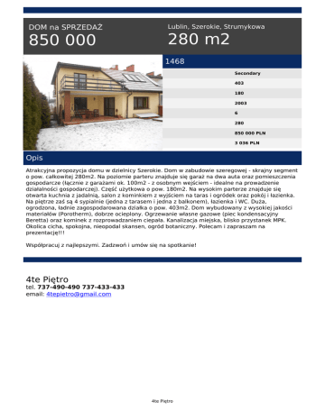 DOM na SPRZEDAŻ 850 000 Lublin, Szerokie, Strumykowa 280 m2 1468 Secondary 403 180 2003 6 280 850 000 PLN 3 036 PLN Opis Atrakcyjna propozycja domu w dzielnicy Szerokie. Dom w zabudowie szeregowej - skrajny segment o pow. całkowitej 280m2. Na poziomie parteru znajduje się garaż na dwa auta oraz pomieszczenia gospodarcze (łącznie z garażami ok. 100m2 - z osobnym wejściem - idealne na prowadzenie działalności gospodarczej). Część użytkowa o pow. 180m2. Na wysokim parterze znajduje się otwarta kuchnia z jadalnią, salon z kominkiem z wyjściem na taras i ogródek oraz pokój i łazienka. Na piętrze zaś są 4 sypialnie (jedna z tarasem i jedna z balkonem), łazienka i WC. Duża, ogrodzona, ładnie zagospodarowana działka o pow. 403m2. Dom wybudowany z wysokiej jakości materiałów (Porotherm), dobrze ocieplony. Ogrzewanie własne gazowe (piec kondensacyjny Beretta) oraz kominek z rozprowadzaniem ciepała. Kanalizacja miejska, blisko przystanek MPK. Okolica cicha, spokojna, nieopodal skansen, ogród botaniczny. Polecam i zapraszam na prezentację!!! Współpracuj z najlepszymi. Zadzwoń i umów się na spotkanie! 4te Piętro tel. 737-490-490 737-433-433 email: [email protected] 4te Piętro Powered by TCPDF (www.tcpdf.org)