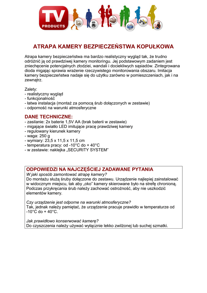 ATRAPA KAMERY BEZPIECZEŃSTWA KOPUŁKOWA Atrapa kamery bezpieczeństwa ma bardzo realistyczny wygląd tak, że trudno odróżnić ją od prawdziwej kamery monitoringu. Jej podstawowym zadaniem jest zniechęcenie potencjalnych złodziei, wandali i dociekliwych sąsiadów. Zintegrowana dioda migając sprawia wrażenie rzeczywistego monitorowania obszaru. Imitacja kamery bezpieczeństwa nadaje się do użytku zarówno w pomieszczeniach, jak i na zewnątrz. Zalety: - realistyczny wygląd - funkcjonalność - łatwa instalacja (montaż za pomocą śrub dołączonych w zestawie) - odporność na warunki atmosferyczne DANE TECHNICZNE: - zasilanie: 2x baterie 1,5V AA (brak baterii w zestawie) - migające światło LED imitujące pracę prawdziwej kamery - regulowany kierunek kamery - waga: 250 g - wymiary: 23,5 x 11,5 x 11,5 cm - temperatura pracy: od -10°C do + 40°C - w zestawie: naklejka „SECURITY SYSTEM” ODPOWIEDZI NA NAJCZĘŚCIEJ ZADAWANE PYTANIA W jaki sposób zamontować atrapę kamery? Do montażu służą śruby dołączone do zestawu. Urządzenie najlepiej zainstalować w widocznym miejscu, tak aby „oko” kamery skierowane było na strefę chronioną. Podczas przykręcania śrub należy zachować ostrożność, aby nie uszkodzić elementów kamery. Czy urządzenie jest odporne na warunki atmosferyczne? Tak, jednak należy pamiętać, że urządzenie pracuje prawidło w temperaturze od -10°C do + 40°C. Jak prawidłowo konserwować kamerę? Do czyszczenia należy używać wyłącznie lekko zwilżonej lub suchej szmatki.