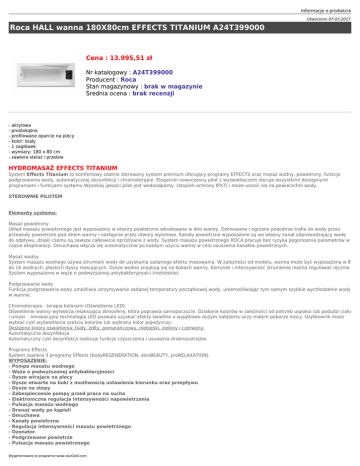 Informacje o produkcie Utworzono 07-03-2017 Roca HALL wanna 180X80cm EFFECTS TITANIUM A24T399000 Cena : 13.995,51 zł Nr katalogowy : A24T399000 Producent : Roca Stan magazynowy : brak w magazynie Średnia ocena : brak recenzji - akrylowa - prostokątna - profilowane oparcie na plecy - kolor: biały - 1 zagłówek - wymiary: 180 x 80 cm - zawiera stelaż i przelew HYDROMASAŻ EFFECTS TITANIUM System Effects Titanium to komfortowy zdalnie sterowany system premium oferujący programy EFFECTS oraz masaż wodny, powietrzny, funkcje podgrzewania wody, automatycznej dezynfekcji i chromoterapie. Elegancki nowoczesny pilot z wyświetlaczem steruje wszystkimi dostępnymi programami i funkcjami systemu Wysokiej jakości pilot jest wodoodporny. (stopień ochrony IPX7) i może unosić się na powierzchni wody. STEROWNIE PILOTEM Elementy systemu: Masaż powietrzny Układ masażu powietrznego jest wyposażony w otwory powietrzne wbudowane w dno wanny. Ozonowane i ogrzane powietrze trafia do wody przez przewody powietrzne pod dnem wanny i następnie przez otwory wylotowe. Kanały powietrzne wyposażone są we własny kanał odprowadzający wodę do odpływu, dzięki czemu są zawsze całkowicie opróżniane z wody. System masażu powietrznego ROCA pracuje bez ryzyka pogorszenia parametrów w czasie eksploatacji. Dmuchawa włącza się automatycznie po każdym użyciu wanny w celu osuszenia kanałów powietrznych. Masaż wodny System masażu wodnego używa strumieni wody do uzyskania zadanego efektu masowania. W zależności od modelu, wanna może być wyposażona w 8 do 16 wodnych, płaskich dyszy masujących. Dysze wodne znajdują się na bokach wanny. Kierunek i intensywność strumienia można regulować ręcznie. System wyposażono w węże o podwyższonej antybakteryjności (niebieskie). Podgrzewanie wody Funkcja podgrzewania wody umożliwia utrzymywanie zadanej temperatury początkowej wody, uniemożliwiając tym samym szybkie wychłodzenie wody w wannie. Chromoterapia - terapia kolorami (Oświetlenie LED) Oświetlenie wanny wytwarza relaksująca atmosferę, która poprawia samopoczucie. Działanie kolorów w zależności od potrzeb uspokoi lub podudzi ciało i umysł. . Innowacyjna technologia LED pozwala uzyskać efekty świetlne o wyjątkowo dużym natężeniu przy małym poborze mocy. Użytkownik może wybrać cykl wyświetlania sześciu kolorów lub wybrany kolor pojedynczy. Dostępne kolory oświetlenia: biały, żółty, pomarańczowy, niebieski, zielony i czerwony. Automatyczna dezynfekcja Automatyczny cykl dezynfekcji realizuje funkcje czyszczenia i usuwania drobnoustrojów. Programy Effects System zawiera 3 programy Effects (bodyREGENERATION, skinBEAUTY, proRELAXATION). WYPOSAŻENIE: - Pompa masażu wodnego - Węże o podwyższonej antybakteryjności - Dysze wirujące na plecy - Dysze otwarte na boki z możliwością ustawienia kierunku oraz przepływu - Dysze na stopy - Zabezpieczenie pompy przed praca na sucho - Elektroniczna regulacja intensywności napowietrzania - Pulsacja masażu wodnego - Drenaż wody po kąpieli - Dmuchawa - Kanały powietrzne - Regulacja intensywności masażu powietrznego - Ozonator - Podgrzewane powietrze - Pulsacja masażu powietrznego Wygenerowano w programie www.oscGold.com - Automatyczne osuszanie kanałów po kąpieli Drenaż wanny po kąpieli Wielopunktowa Chromoterapia Sterowanie za pomocą pilota z ekranem dotykowym Wyłącznik czasowy masażu Podgrzewacz wody Automatyczna dezynfekcja 3 programy Effects 2 programy użytkownika Napełnianie przez dysze Tryb STAND-BY (oszczędność energii, wyłączenie podświetlenia czujników) Funkcja włączania i wyłączania podgrzewacza wody