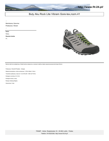 http://www.fit-24.pl/ Buty Aku Rock Lite Vibram Gore-tex,rozm.41 Membrana; Gore-tex Podeszwa; Vibram Kolor Szary, Rozmiar butów 41, Bardzo lekki but podejściowy. Model bardzo elastyczny a zarazem stabilny dzięki zaawansowanej technologi Vibram. Podeszwa: Vibram® Predator - Idrogrip Materiał zewnętrzny: skóra zamszowa + 3D Air Mesh 1.6mm; Twardość podeszwy: duża (2-1 mm NYLON + DIE CUT EVA) Dostępne rozmiary; 8; 9; 9,5; Dostępne kolory: szary Rodzaj: Kolekcja Męska Gwarancja: 2 lata TRAMP - Adres: Świętoduska 18, 20-082 Lublin, Polska Telefon: 81/5323336, http://www.fit-24.pl/
