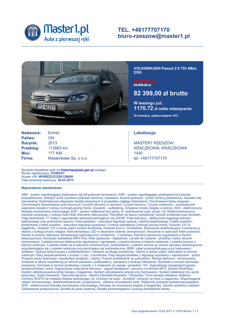 TEL. +48177707170 [email protected] VOLKSWAGEN Passat 2.0 TDI 4Mot. DSG PROMOCJA 89 999,00 zł 82 399,00 zł brutto W leasingu już: 1170.72 zł netto miesięcznie 36 miesięcy, opłata wstępna 10% Nadwozie: Paliwo: Rocznik: Przebieg: Moc: Firma: Kombi ON 2013 112663 km 177 KM Masterlease Sp. z o.o. Lokalizacja: MASTER1 RZESZÓW KRACZKOWA, KRACZKOWA 1440 tel. +48177707170 Sprawdź bezpłatnie auto na historiapojazdu.gov.pl podając: Numer rejestracyjny: PO462VY Numer VIN: WVWZZZ3CZDE129009 Datę pierwszej rejestracji: 20.03.2013 Wyposażenie standardowe: ABS - system zapobiegający blokowaniu się kół podczas hamowania, ASR - system zapobiegający poślizgowi kół podczas przyspieszania, Airbag 6 sztuk (czołowe poduszki kierowcy i pasażera, boczne poduszki - przód, kurtyny powietrzne), Asystent siły hamowania, Automatyczne włączanie świateł awaryjnych w przypadku nagłego hamowania, Chromowane listwy progowe, Chromowane obramowania szyb bocznych, Czujnik ciśnienia w oponach, Czujnik deszczu, Czujnik zmierzchu - automatyczne włączanie świateł z funkcją Coming/Leaving Home, Dywaniki - wykładzina, Dźwignia zmiany biegów w skórze, EDS - elektroniczna blokada mechanizmu różnicowego, ESP - system stabilizacji toru jazdy, El. podnoszenie szyb, przód i tył, Elektromechaniczny hamulec postojowy z funkcją Auto-Hold, Elementy dekoracyjne Titansilber na desce rozdzielczej, konsoli środkowej oraz drzwiach, Felgi aluminiowe 17 Valley z ogumieniem samouszczelniającym się 225/50, Fotel kierowcy - elektryczna regulacją odcinka lędźwiowego oraz pochylenia oparcia, Fotel pasażera - manualna regulacja oparcia i odcinka lędźwiowego, Fotele przednie komfortowe, Fotele przednie - manualna regulacja wysokości, Funkcja oświetlania Coming/Leaving Home, Gniazdo 12V w bagażniku, Gniazdo 12V w tylnej części konsoli środkowej, Gniazdo Aux-in, Immobilizer, Kierownica wielofunkcyjna 3-ramienna w skórze z funkcją zmiany biegów, Kierunkowskazy LED w obudowie lusterek zewnętrznych, Kieszenie w oparciach foteli przednich, Klamki w kolorze nadwozia, Klimatyzacja automatyczna Climatronic - 2 strefowa, Kolumna kierownicy regulowana w dwóch płaszczyznach, Komputer pokładowy MFA Plus, Koło zapasowe - dojazdowe, Lampki do czytania - przód/tył, Listwy boczne chromowane, Lusterka boczne elektrycznie regulowane i ogrzewane, Lusterka boczne w kolorze nadwozia, Lusterka boczne w kolorze srebrnym, Lusterka make-up w osłonach p/słonecznych, podświetlane, Lusterko boczne po stronie kierowcy automatycznie przyciemniające się, Lusterko wsteczne przyciemniające się automatycznie, MSR- układ przeciwblokujący przy hamowaniu silnikiem, Oparcie tylnej kanapy z podłokietnikiem i otworem na długie przedmioty, Osłony w dolnej części zderzaków w kolorze srebrnym, Pasy bezpieczeństwa z przodu i z tyłu, 3-punktowe, Pasy bezpieczeństwa z regulacją wysokości i napinaczami - przód, Program jazdy terenowej z asystentem podjazdu i zjazdu, Przedni podłokietnik ze schowkiem, Relingi dachowe - chromowane, Schowek w desce rozdzielczej po stronie pasażera, podświetlany, zamykany z funkcją chłodzenia, Schowek w konsoli dachowej zamykany, Schowek w konsoli środkowej z przodu z 2 miejscami na napoje i gniazdem 12V, Sygnalizacja niezapiętych pasów bezpieczeństwa, przód, Sygnalizacja zmęczenia kierowcy - sygnał dźwiękowy i wizualny na ekranie MFA, System Strat/Stop, System odblokowywania tylnej kanapy z bagażnika, System odzyskiwania energii przy hamowaniu, System stabilizacji toru jazdy przyczepy, Szyby barwione, Tapicerka łączona - tkanina Zabriskie/Alcantara, Tempomat, Tylna kanapa składana, dzielona, Uchwyty ISOFIX do instalacji fotelika dziecięcego, tył, Uchwyty na kubki - przód/tył, Uchwyty na torby w bagażniku, Wspomaganie układu kierowniczego, elektromechaniczne, progresywne - zależne od prędkości auta, Wyłącznik poduszki powietrznej pasażera, XDS - elektroniczna blokada mechanizmu różnicowego, Zaczepy do mocowania bagażu w bagażniku, Zamek centralny z pilotem, Zawieszenie podwyższone, Światła do jazdy dziennej, Światła przeciwmgielne z funkcją doświetlania skrętu Opis wygenerowano 14.02.2017 o 10:05 Strona 1 z 2 Wyposażenie dealerskie: Alarm z niezależnym zasilaniem, f. dozoru wnętrza i czujnikiem przechyłu, Lakier metalik, Lampy Bi-ksenonowe z funkcją dośw. zakrętów i spryskiwaczami + światła dzienne LED + tylne lampy LED, Pakiet Business, Pakiet Lusterka, Pakiet zimowy 1, System nawigacji satelitarnej RNS 510 , pakiet Master1 to punkt sprzedaży samochodów Masterlease, pierwszego właściciela. Wszystkie auta zostały zakupione w polskim salonie, posiadają wycenę rzeczoznawcy, były regularnie serwisowane podczas użytkowania i posiadają udokumentowaną historię zdarzeń serwisowych. W Master1.pl znajdziecie Państwo szeroki wachlarz ubezpieczeń komunikacyjnych. Nasza oferta skierowana jest zarówno do klientów indywidualnych jak i firm. Wszelkich formalności można dokonać na miejscu. Opis wygenerowano 14.02.2017 o 10:05 Strona 2 z 2