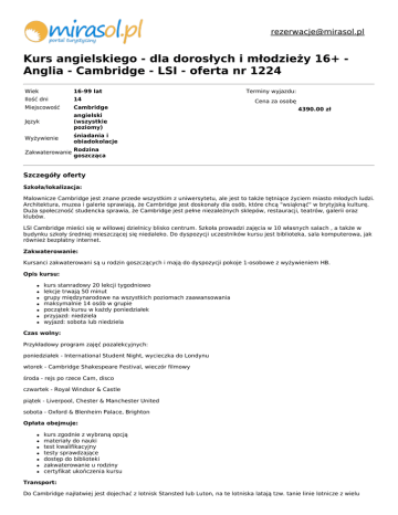 [email protected] Kurs angielskiego - dla dorosłych i młodzieży 16+ Anglia - Cambridge - LSI - oferta nr 1224 Wiek 16-99 lat Ilość dni 14 Miejscowość Cambridge Język angielski (wszystkie poziomy) Wyżywienie śniadania i obiadokolacje Zakwaterowanie Rodzina goszcząca Terminy wyjazdu: Cena za osobę 4390.00 zł Szczegóły oferty Szkoła/lokalizacja: Malownicze Cambridge jest znane przede wszystkim z uniwersytetu, ale jest to także tętniące życiem miasto młodych ludzi. Architektura, muzea i galerie sprawiają, że Cambridge jest doskonały dla osób, które chcą "wsiąknąć" w brytyjską kulturę. Duża społeczność studencka sprawia, że Cambridge jest pełne niezależnych sklepów, restauracji, teatrów, galerii oraz klubów. LSI Cambridge mieści się w willowej dzielnicy blisko centrum. Szkoła prowadzi zajęcia w 10 własnych salach , a także w budynku szkoły średniej mieszczącej się niedaleko. Do dyspozycji uczestników kursu jest biblioteka, sala komputerowa, jak również bezpłatny internet. Zakwaterowanie: Kursanci zakwaterowani są u rodzin goszczących i mają do dyspozycji pokoje 1-osobowe z wyżywieniem HB. Opis kursu: kurs stanradowy 20 lekcji tygodniowo lekcje trwają 50 minut grupy międzynarodowe na wszystkich poziomach zaawansowania maksymalnie 14 osób w grupie początek kursu w każdy poniedziałek przyjazd: niedziela wyjazd: sobota lub niedziela Czas wolny: Przykładowy program zajęć pozalekcyjnych: poniedziałek - International Student Night, wycieczka do Londynu wtorek - Cambridge Shakespeare Festival, wieczór filmowy środa - rejs po rzece Cam, disco czwartek - Royal Windsor & Castle piątek - Liverpool, Chester & Manchester United sobota - Oxford & Blenheim Palace, Brighton Opłata obejmuje: kurs zgodnie z wybraną opcją materiały do nauki test kwalifikacyjny testy sprawdzające dostęp do biblioteki zakwaterowanie u rodziny certyfikat ukończenia kursu Transport: Do Cambridge najłatwiej jest dojechać z lotnisk Stansted lub Luton, na te lotniska latają tzw. tanie linie lotnicze z wielu miast w Polsce. Ceny lotów są już od 300 zł. Dodatkowo: dopłata do zakwaterowania w wakacje (21.06.-30.08.2014) - £ 35 tygodniowo transfer z/na lotnisko Stansted - £ 170 transfer z/na lotnisko Luton - £ 190 ubezpieczenie ok. 30 zł / tydzień opłata administracyjna 300 zł przelot od 300 zł Jak rezerwować Aby wstępnie zarezerwować wyjazd, Klient powinien: -podać w wyszukiwarce parametry obozu/kolonii , którymi jest zainteresowany . (np. kraj, miasto, tematykę wyjazdu, wiek itp.) i kliknąć Wyszukaj oferty -po wyświetleniu wyników wyszukiwania przeczytać opisy wyjazdów, wybrać jeden z nich i kliknąć Przejdź do rezerwacji , gdzie znajduje się Formularz rezerwacyjny -wypełnić Formularz rezerwacyjny, w którym należy podać prawidłowe dane osobowe uczestników wyjazdu, niezbędne do dokonania rezerwacji -po wprowadzeniu danych zaakceptować Regulamin i Warunki uczestnictwa Organizatora imprezy turystycznej (znajdujące się przy opisie oferty) i kliknąć Wyślij Kolejne kroki: - po potwierdzeniu telefonicznym i mailowym przezKonsultanta mirasol.pl dostępności miejsc i otrzymaniu mailem Potwierdzenia rezerwacji, należy wpłacić wymaganą zaliczkę lub całą kwotę za wyjazd - w momencie dokonania wpłaty zawarta zostaje Umowa pomiędzy Klientem a Organizatorem imprezy za pośrednictwem Agenta (mirasol.pl) i jest to równoznaczne z akceptacją przez KlientaUmowy i Warunków Uczestnictwa Organizatora. - w ustalonym przez Organizatora terminie Klient zobowiązany jest dowpłacenia pełnej opłaty za wyjazd oraz do dostarczenia wymaganych przez Organizatora dokumentów -po przesłaniu pełnej wpłaty i dokumentów Klient otrzyma drogą mailową dokumenty podróżne (skierowanie), które zawierają wszystkie niezbędne informacje na temat imprezy turystycznej oraz dojazdu i są podstawą przyjęcia uczestnika na obóz / kolonię.
