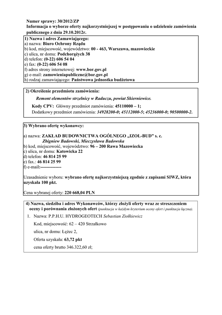 Numer sprawy: 30/2012/ZP Informacja o wyborze oferty najkorzystniejszej w postępowaniu o udzielenie zamówienia publicznego z dnia 29.10.2012r. 1) Nazwa i adres Zamawiającego: a) nazwa: Biuro Ochrony Rządu b) kod, miejscowość, województwo: 00 - 463, Warszawa, mazowieckie c) ulica, nr domu: Podchorążych 38 d) telefon: (0-22) 606 54 04 e) fax: (0-22) 606 54 08 f) adres strony internetowej: www.bor.gov.pl g) e-mail: [email protected] h) rodzaj zamawiającego: Państwowa jednostka budżetowa 2) Określenie przedmiotu zamówienia: Remont elementów strzelnicy w Raduczu, powiat Skierniewice. Kody CPV: Główny przedmiot zamówienia: 45110000 – 1; Dodatkowy przedmiot zamówienia: 34928200-0; 45112000-5; 45236000-0; 90500000-2. 3) Wybrano ofertę wykonawcy: a) nazwa: ZAKŁAD BUDOWNICTWA OGÓLNEGO „IZOL-BUD” s. c. Zbigniew Badowski, Mieczysława Badowska b) kod, miejscowość, województwo: 96 – 200 Rawa Mazowiecka c) ulica, nr domu: Katowicka 22 d) telefon: 46 814 25 99 e) fax.: 46 814 25 99 f) e-mail:-------------Uzasadnienie wyboru: wybrano ofertę najkorzystniejszą zgodnie z zapisami SIWZ, która uzyskała 100 pkt. Cena wybranej oferty: 220 668,04 PLN 4) Nazwa, siedziba i adres Wykonawców, którzy złożyli oferty wraz ze streszczeniem oceny i porównania złożonych ofert (punktacja w każdym kryterium oceny ofert i punktacja łączna). 1. Nazwa: P.P.H.U. HYDROGEOTECH Sebastian Ziołkiewicz Kod, miejscowość: 62 – 420 Strzałkowo ulica, nr domu: Łężec 2, Oferta uzyskała: 63,72 pkt cena oferty brutto 346.322,60 zł;