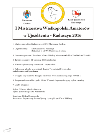 1. Miejsce zawodów: Raduszyn 4, 62-095 Murowana Goślina 2. Organizatorzy: Klub Jeździecki Raduszyn Raduszyn 4, 62-095 Murowana Goślina 3. Honorowy patronat: Burmistrz Miasta i Gminy Murowana Goślina Pan Dariusz Urbański 4. Termin zawodów: 11 września 2016 (niedziela) 5. Warunki: piaszczysty czworobok i rozprężalnia 6. Zgłoszenia udziału w zawodach do dnia 7 września 2016 na adres [email protected] 7. Wstępne listy startowe dostępne na stronie www.kosakowscy.pl po 7.09.16 r. 8. Rozpoczęcie zawodów: godz. 10:00. W czasie imprezy dostępny będzie catering 9. Osoby oficjalne: Sędzia Główny: Monika Warych Sędzia pomocniczy: Ewa Niestrawska Komisarz: Halina Kosakowska Sekretarze: Zapraszamy do współpracy i praktyki sędziów z III klasą Regulamin Rozgrywania Mistrzostw Wielkopolski Amatorów w Ujeżdżeniu 1. W Mistrzostwach Wielkopolski Amatorów w Ujeżdżeniu, może startować osoba nie posiadająca obecnie ani w przeszłości trzeciej i wyższej klasy sportowej w Ujeżdżeniu i WKKW oraz drugiej i wyższej klasy sportowej w Skokach. Każdy zawodnik ma prawo do udziału w dwóch konkursach. 2. W konkursach o tytuł Mistrza Wielkopolski we wszystkich kategoriach do klasyfikacji liczyć się będą tylko mieszkańcy Województwa Wielkopolskiego. 3. Konie 5-letnie i starsze. Każdy koń ma prawo do maksymalnie dwóch przejazdów. 4. Zawodnicy są klasyfikowani odrębnie w swoich grupach wiekowych. Jeden koń może startować dwa razy pod dwoma różnymi jeźdźcami w dowolnej kategorii wiekowej. Zawodnik ma prawo startu tylko w jednej kategorii wiekowej i tylko na jednym koniu/kucu (dotyczy konkursów Mistrzowskich). W konkursach innych niż Mistrzowskie jeden zawodnik może startować dwa razy. Liczy się wynik lepszego przejazdu. Zawodnik startujący w Mistrzostwach nie będzie klasyfikowany w innych konkursach (ma prawo do startu w innych programach, ale poza konkursem). 4. Wymagana dokumentacja: - ważne badania lekarskie lub zaświadczenie od lekarza o braku przeciwwskazań do uprawiania jeździectwa, - aktualne ubezpieczenie NW - w przypadku osób niepełnoletnich zgoda rodziców na start - w celu potwierdzenia wieku i miejsca zamieszkania zawodnika prosimy o okazanie legitymacji / dowodu osobistego (dotyczy tylko udziału w konkursach o Mistrzostwo). Wiek określany jest na podstawie roku urodzenia - oświadczenie o nieposiadaniu obecnie ani w przeszłości trzeciej i wyższej klasy sportowej w Ujeżdżeniu i WKKW oraz drugiej i wyższej klasy sportowej w Skokach (dostępne i wypełniane na miejscu, dotyczy tylko udziału w konkursach o Mistrzostwo) 5. Mistrzostwa rozgrywane będą w kategoriach: Kuce - Dzieci i Juniorzy młodsi od 9 do 15 roku życia, Konie - Junior od 12 do 18 roku życia, - Senior powyżej 18 roku życia 6. Ubiór: zgodnie z przepisami PZJ 7. Na terenie zawodów będzie obecny lekarz medycyny/ratownik medyczny 8. Opłaty: Startowe w konkursach Mistrzostw 60 zł, w pozostałych konkursach 40 zł. Zawodnicy startujący w konkursach Mistrzowskich bez udziału w klasyfikacji - 40 zł Opłaty należy wnieść najpóźniej na godzinę przed startem 9. Istnieje możliwość wynajęcia boksów na dzień zawodów, rezerwacje pod numerem tel.: 516 178 532 - Halina Kosakowska - boksy w dniu zawodów 50 zł, ilość boksów ograniczona 10. Program zawodów : Konkurs nr 1 Klasy L-1 (20 m x 40 m) konkurs Mistrzowski dla Dzieci na Kucach Konkurs nr 2 Klasy L-3 (20 m x 60 m) konkurs Mistrzowski dla Juniorów Konkurs nr 3 Klasy P-2 (20 m x 60 m) Konkurs nr 4 Klasy P-4 (20 m x 60 m) konkurs Mistrzowski dla Seniorów Konkursem o tytuł Mistrza Wielkopolski Amatorów w kategorii Dzieci na Kucach jest konkurs nr 1/ program L-1. Każdy ma prawo startu w tym konkursie, ale sklasyfikowani ostatecznie będą tylko zawodnicy w tej kategorii wiekowej na kucach do wysokości 149 cm wzrostu Konkursem o tytuł Mistrza Wielkopolski Amatorów w kategorii Junior jest konkurs nr 2/ program L-3. Każdy ma prawo startu w tym konkursie, ale sklasyfikowani ostatecznie będą tylko zawodnicy w tej kategorii wiekowej Konkursem o tytuł Mistrza Wielkopolski Amatorów w kategorii Senior jest konkurs nr 4/ program P-4. Każdy ma prawo startu w tym konkursie, ale sklasyfikowani ostatecznie będą tylko zawodnicy w tej kategorii wiekowej 11. Nagrody: Dla pierwszych trzech miejsc w każdej kategorii zostaną wręczone: medale, puchary oraz nagrody rzeczowe.. Mistrzowie w kategoriach Juniorzy i Seniorzy nagrodzeni będą okolicznościową derką. Dla wszystkich par biorących udział w zawodach organizator przewiduje rozety. Minimalna wartość nagród rzeczowych Im II m III m Konkurs nr 1 MD i JM 100 zł 70 zł 50 zł Konkurs nr 2 MJ 250 zł 150 zł 100 zł Konkurs nr 3 150 zł 100 zł 70 zł Konkurs nr 4 MS 400 zł 250 zł 150 zł Łączna pula nagród rzeczowych: minimalnie 1840 zł. Wartość wszystkich nagród łącznie ponad 3000 zł 12. Organizator zastrzega sobie prawo do zmian w programie 13. Organizator nie odpowiada za wypadki, kradzieże i inne zdarzenia losowe mogące mieć miejsce podczas trwania zawodów oraz podczas transportu koni, zawodników oraz osób trzecich 14. Uwaga: na rozprężalni obowiązuje ochronne nakrycie głowy, zarówno dla zawodnika jak i luzaka. Nie zastosowanie się do tego punktu regulaminu może skutkować nie dopuszczeniem do startu lub dyskwalifikacją zawodnika Propozycje zatwierdzone przez WZJ w dniu 27.04.2016 – Ryszard Szymoniak Serdecznie zapraszamy Klub Jeździecki Raduszyn Kodeks postępowania z koniem. 1. Koń jest najwyższym dobrem we wszystkich dyscyplinach jeździeckich. 2. Dobro konia jest ważniejsze od interesów hodowców, właścicieli, trenerów, jeźdźców, organizatorów i sponsorów zawodów oraz innych osób oficjalnych. 3. Wszystkie czynności pielęgnacyjne i zabiegi weterynaryjne muszą mieć na celu zdrowie i dobro konia. 4. Dbałość o zdrowie, higienę, odpowiednie żywienie i bezpieczeństwo konia powinna mieć miej