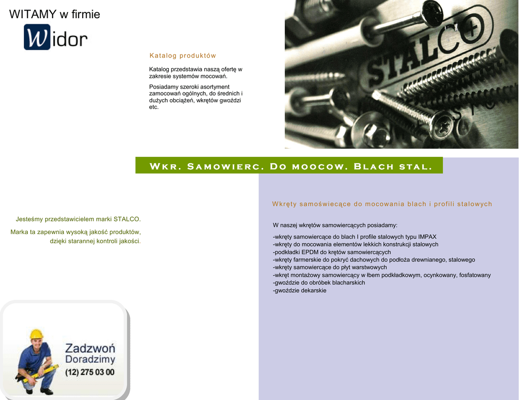WITAMY w firmie Katalog produktów Katalog przedstawia naszą ofertę w zakresie systemów mocowań. Posiadamy szeroki asortyment zamocowań ogólnych, do średnich i dużych obciążeń, wkrętów gwoździ etc. W k r . S a m ow i e r c . D o m o o c ow. B l a ch s ta l . W k r ę t y s a m o ś w i e c ą c e d o m o c o w a n i a b l a c h i p r o f i l i s t a l o w yc h Jesteśmy przedstawicielem marki STALCO. W naszej wkrętów samowiercących posiadamy: Marka ta zapewnia wysoką jakość produktów, dzięki starannej kontroli jakości. -wkręty samowiercące do blach I profile stalowych typu IMPAX -wkręty do mocowania elementów lekkich konstrukcji stalowych -podkładki EPDM do krętów samowiercących -wkręty farmerskie do pokryć dachowych do podłoża drewnianego, stalowego -wkręty samowiercące do płyt warstwowych -wkręt montażowy samowiercący w łbem podkładkowym, ocynkowany, fosfatowany -gwoździe do obróbek blacharskich -gwoździe dekarskie