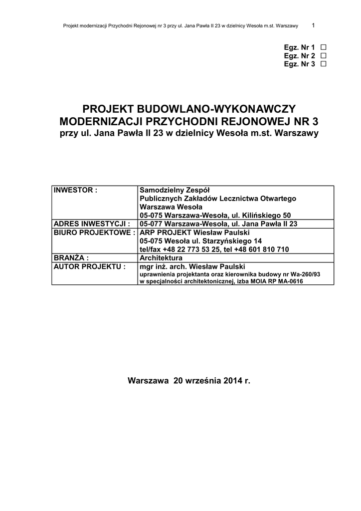 Projekt modernizacji Przychodni Rejonowej nr 3 przy ul. Jana Pawła II 23 w dzielnicy Wesoła m.st. Warszawy 1 Egz. Nr 1 Egz. Nr 2 Egz. Nr 3 PROJEKT BUDOWLANO-WYKONAWCZY MODERNIZACJI PRZYCHODNI REJONOWEJ NR 3 przy ul. Jana Pawła II 23 w dzielnicy Wesoła m.st. Warszawy INWESTOR : Samodzielny Zespół Publicznych Zakładów Lecznictwa Otwartego Warszawa Wesoła 05-075 Warszawa-Wesoła, ul. Kilińskiego 50 ADRES INWESTYCJI : 05-077 Warszawa-Wesoła, ul. Jana Pawła II 23 BIURO PROJEKTOWE : ARP PROJEKT Wiesław Paulski 05-075 Wesoła ul. Starzyńskiego 14 tel/fax +48 22 773 53 25, tel +48 601 810 710 BRANŻA : Architektura AUTOR PROJEKTU : mgr inż. arch. Wiesław Paulski uprawnienia projektanta oraz kierownika budowy nr Wa-260/93 w specjalności architektonicznej, izba MOIA RP MA-0616 Warszawa 20 września 2014 r. Projekt modernizacji Przychodni Rejonowej nr 3 przy ul. Jana Pawła II 23 w dzielnicy Wesoła m.st. Warszawy ZAWARTOŚĆ OPRACOWANIA Opis techniczny Dokumenty formalno-prawne – – – Oświadczenie projektanta, Uprawnienia budowlane projektanta, Zaświadczenia potwierdzające przynależność do izby samorządu zawodowego projektantów. Plan sytuacyjny Rysunki A-01 Technologia - Rzut parteru A-02 Technologia - Rzut piętra A-03 Inwentaryzacja – Rzut parteru A-04 Inwentaryzacja – Rzut piętra A-05 Przebudowa – Rzut parteru A-06 Przebudowa – Rzut piętra A-07 Rzut dachu A-08 Elewacja północna A-09 Modernizacja fasady aluminiowej A-10 Przekroje budynku Legenda 1:50 1:50 1:50 1:50 1:50 1:50 1:100 1:100 1:100/1:10 1:100 2 Projekt modernizacji Przychodni Rejonowej nr 3 przy ul. Jana Pawła II 23 w dzielnicy Wesoła m.st. Warszawy 3 OPIS TECHNICZNY 1. DANE FORMALNE 1.1. Przedmiot opracowania: Przedmiotem opracowania jest projekt budowlano-wykonawczy architektoniczny modernizacji Przychodni Rejonowej nr 3 przy ul. Jana Pawła II 23 w dzielnicy Wesoła m.st. Warszawy. Niniejszy projekt został skoordynowany z projektami branżowymi: – projektem instalacji sanitarnych (autor: mgr inż. Maciej Saczuk) – projektem instalacji elektrycznych (autor: tech, Jerzy Gałecki) 1.2. Podstawa opracowania: Umowa nr 42/2014 z dnia 31-07-2014 r., Koncepcja architektoniczna modernizacji wykonana przez autora niniejszego opracowania, uzgodniona z Zamawiającym, Projekt architektoniczno – budowlany adaptacji lokalu usługowego w „Centrum Pogodna” na Przychodnię Rejonową nr 3 w Wesołej – Starej Miłośnie przy ulicy Jana Pawła II 23, wykonany w lipcu 2002 r., Inwentaryzacja budowlana wykonana przez autora niniejszego opracowania, Rozporządzenie Ministra Zdrowia z dnia 2 lutego 2011 r. w sprawie wymagań, jakim powinny odpowiadać pod względem fachowym i sanitarnym pomieszczenia i urządzenia zakładu opieki zdrowotnej, (Dz. U. z dnia 11 lutego 2011 r.) Przepisy prawa budowlanego. 2. LOKALIZACJA I STAN ISTNIEJĄCY Centrum Pogodna – obiekt o charakterze handlowo-usługowym oraz mieszkalnym wielorodzinnym - zlokalizowane jest w centralnej części osiedla Stara Miłosna w dzielnicy Wesołej m.st. Warszawy, w sąsiedztwie innych obiektów użyteczności publicznej, jak poczta, zespół szkolny i kościół. Lokal Przychodni usytuowany jest w wyodrębnionej z bryły głównej Centrum oficynie, przy ciągu pieszym, dostępnym również dla niepełnosprawnych, z dogodnym dojazdem. Lokal składa się z powierzchni na parterze (ok. 160 m2) i na piętrze (ok. 140 m2) – razem ok. 300 m2. W poziomie piwnic Centrum zlokalizowano garaż podziemny. Lokal przychodni nie ma bezpośredniego połączenia z poziomem garażu podziemnego. Miejsca parkingowe dla lokali usługowych zaprojektowane zostały wzdłuż ulic przyległych do Centrum Pogodna. Charakterystyka konstrukcyjno-materiałowa obiektu : • fundamenty żelbetowe monolityczne • konstrukcja budynku szkieletowa żelbetowa: słupy o przekroju 30x30 cm, stropy żelbetowe płytowe krzyżowo zbrojone o grubości 20 cm • ściany wypełniające murowane, ściany zewnętrzne ocieplane metodą lekką mokrą; • stropodach - „odwrócony” systemu DOW wg. technologii firmy UNITREND • elewacje – tynk cienkowarstowy strukturalny „kornik” na warstwie docieplającej ze styropianu; kolor tynku: jasnoszary; • fasada przy pasażu – szklana, o konstrukcji aluminiowej słupowo-ryglowej, szklona zestawami jednokomorowymi; zawiera troje drzwi wejściowych otwieranych na zewnątrz i trzy segmenty okienne uchylne; kolor profili aluminiowych: RAL 7037; • okna – aluminiowe szklone zestawami jednokomorowymi, uchylne; kolor profili aluminiowych: RAL 7037; • świetliki – konstrukcja metalowa, „szklenie” płytami poliwęglanowymi; Istniejące elementy stanu wykończeniowego wewnątrz lokalu: • wykończenie ścian zewnętrznych i sufitu na piętrze - tynk cementowo-wapienny, • posadzki w całym lokalu: płytki ceramiczne gresowe 30x30 cm, w 3 kolorach – beżowym, różowym i pomarańczowym; • ścianki działowe: z płyt gipsowo-kartonowych na stelażu metalowym, o grubości 10 cm, o wysokości – do stropu konstrukcyjnego, malowane farbą zmywalną; • okładziny ścian w sanitariatach do wysokości 2,0 m: płytki ceramiczne glazurowane; • okładziny ścian w gabinetach, przy umywalkach i zlewozmywakach do wysokości 1,6 m, o szerokości średnio 1,0 m: płytki ceramiczne glazurowane; Projekt modernizacji Przychodni Rejonowej nr 3 przy ul. Jana Pawła II 23 w dzielnicy Wesoła m.st. Warszawy 4 • zabezpieczenie ścian w przedsionkach, poczekalniach, korytarzach i gabinetach: 2 listwy z laminatu mocowane mechanicznie (miejscami 1 listwa); • ścianki działowe rejestracji: szklane (szkło pojedyńcze, bezpieczne), o konstrukcji aluminiowej; • sufit na parterze: podwieszony, modułowy 60x60 cm na stelażu metalowym. • obudowa kanałów wentylacyjnych: z płyt gipsowo-kartonowych na ruszcie metalowym. • parapety okienne: z płyt laminowanych; • lady rejestracji: z płyt laminowanych; • drzwi wewnętrzne : pełn