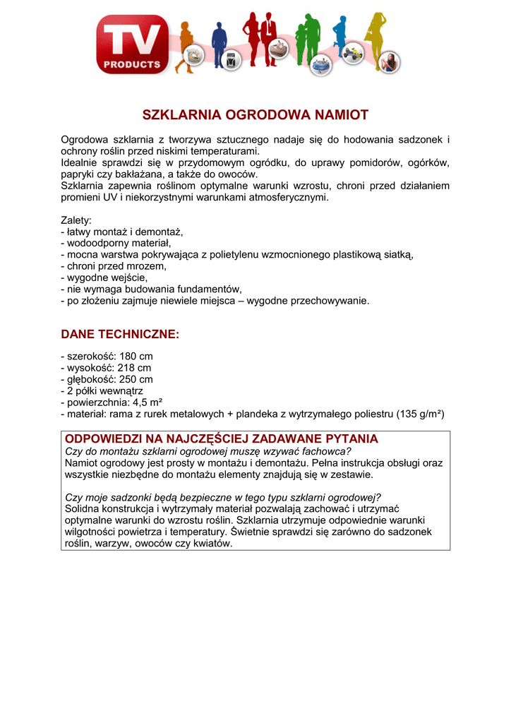 SZKLARNIA OGRODOWA NAMIOT Ogrodowa szklarnia z tworzywa sztucznego nadaje się do hodowania sadzonek i ochrony roślin przed niskimi temperaturami. Idealnie sprawdzi się w przydomowym ogródku, do uprawy pomidorów, ogórków, papryki czy bakłażana, a także do owoców. Szklarnia zapewnia roślinom optymalne warunki wzrostu, chroni przed działaniem promieni UV i niekorzystnymi warunkami atmosferycznymi. Zalety: - łatwy montaż i demontaż, - wodoodporny materiał, - mocna warstwa pokrywająca z polietylenu wzmocnionego plastikową siatką, - chroni przed mrozem, - wygodne wejście, - nie wymaga budowania fundamentów, - po złożeniu zajmuje niewiele miejsca – wygodne przechowywanie. DANE TECHNICZNE: - szerokość: 180 cm - wysokość: 218 cm - głębokość: 250 cm - 2 półki wewnątrz - powierzchnia: 4,5 m² - materiał: rama z rurek metalowych + plandeka z wytrzymałego poliestru (135 g/m²) ODPOWIEDZI NA NAJCZĘŚCIEJ ZADAWANE PYTANIA Czy do montażu szklarni ogrodowej muszę wzywać fachowca? Namiot ogrodowy jest prosty w montażu i demontażu. Pełna instrukcja obsługi oraz wszystkie niezbędne do montażu elementy znajdują się w zestawie. Czy moje sadzonki będą bezpieczne w tego typu szklarni ogrodowej? Solidna konstrukcja i wytrzymały materiał pozwalają zachować i utrzymać optymalne warunki do wzrostu roślin. Szklarnia utrzymuje odpowiednie warunki wilgotności powietrza i temperatury. Świetnie sprawdzi się zarówno do sadzonek roślin, warzyw, owoców czy kwiatów.