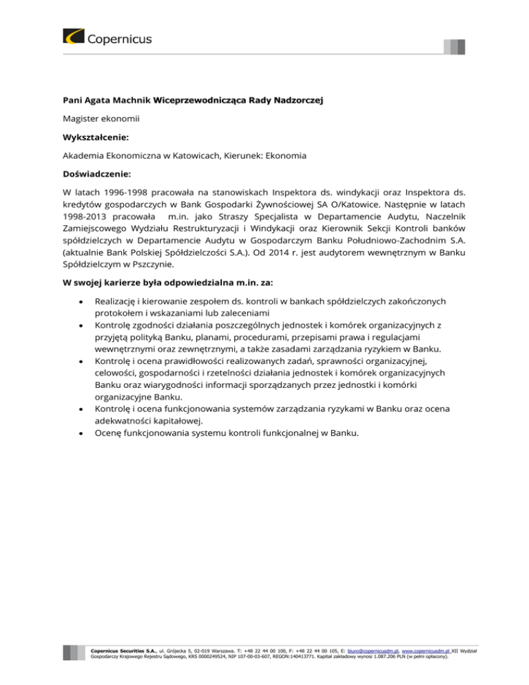 Pani Agata Machnik Wiceprzewodnicząca Rady Nadzorczej Magister ekonomii Wykształcenie: Akademia Ekonomiczna w Katowicach, Kierunek: Ekonomia Doświadczenie: W latach 1996-1998 pracowała na stanowiskach Inspektora ds. windykacji oraz Inspektora ds. kredytów gospodarczych w Bank Gospodarki Żywnościowej SA O/Katowice. Następnie w latach 1998-2013 pracowała m.in. jako Straszy Specjalista w Departamencie Audytu, Naczelnik Zamiejscowego Wydziału Restrukturyzacji i Windykacji oraz Kierownik Sekcji Kontroli banków spółdzielczych w Departamencie Audytu w Gospodarczym Banku Południowo-Zachodnim S.A. (aktualnie Bank Polskiej Spółdzielczości S.A.). Od 2014 r. jest audytorem wewnętrznym w Banku Spółdzielczym w Pszczynie. W swojej karierze była odpowiedzialna m.in. za: Realizację i kierowanie zespołem ds. kontroli w bankach spółdzielczych zakończonych protokołem i wskazaniami lub zaleceniami Kontrolę zgodności działania poszczególnych jednostek i komórek organizacyjnych z przyjętą polityką Banku, planami, procedurami, przepisami prawa i regulacjami wewnętrznymi oraz zewnętrznymi, a także zasadami zarządzania ryzykiem w Banku. Kontrolę i ocena prawidłowości realizowanych zadań, sprawności organizacyjnej, celowości, gospodarności i rzetelności działania jednostek i komórek organizacyjnych Banku oraz wiarygodności informacji sporządzanych przez jednostki i komórki organizacyjne Banku. Kontrolę i ocena funkcjonowania systemów zarządzania ryzykami w Banku oraz ocena adekwatności kapitałowej. Ocenę funkcjonowania systemu kontroli funkcjonalnej w Banku. Copernicus Securities S.A., ul. Grójecka 5, 02-019 Warszawa. T: +48 22 44 00 100, F: +48 22 44 00 105, E: [email protected], www.copernicusdm.pl XII Wydział Gospodarczy Krajowego Rejestru Sądowego, KRS 0000249524, NIP 107-00-03-607, REGON:140413771. Kapitał zakładowy wynosi 1.087.206 PLN (w pełni opłacony).