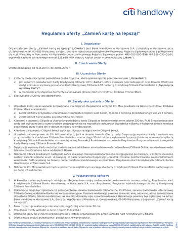 Regulamin oferty „Zamień kartę na lepszą!” I. Organizator Organizatorem oferty „Zamień kartę na lepszą!” („Oferta”) jest Bank Handlowy w Warszawie S.A. z siedzibą w Warszawie, przy ul. Senatorskiej 16, 00–923 Warszawa, zarejestrowany w rejestrze przedsiębiorców Krajowego Rejestru Sądowego przez Sąd Rejonowy dla m.st. Warszawy w Warszawie, XII Wydział Gospodarczy Krajowego Rejestru Sądowego, pod nr KRS 000 000 1538; NIP 526–030–02–91, wysokość kapitału zakładowego wynosi 522.638.400 złotych; kapitał został w pełni opłacony („Bank”). II. Czas trwania Oferty Oferta obowiązuje od 15.12.2014 r. do 30.06.2015 r III. Uczestnicy Oferty 1. Z Oferty może skorzystać pełnoletnia osoba fizyczna , która spełnia łącznie poniższe warunki („Uczestnik”): a) jest głównym posiadaczem Karty Kredytowej Citibank–LOT („Karta”), który w okresie poprzedzającym czas trwania Oferty nie złożył wniosku o wymianę posiadanej Karty Kredytowej Citibank–LOT na Kartę Kredytową Citibank PremierMiles ( „Dyspozycja wymiany Karty”) b) w momencie przystąpienia do Oferty nie posiadała głównej Karty Kredytowej Citibank PremierMiles. 2. Skorzystanie z Oferty jest dobrowolne. IV. Zasady skorzystania z Oferty 1. Uczestnik, który spełni warunki przewidziane w niniejszym Regulaminie otrzyma Citi Mile powitalne na Karcie Kredytowej Citibank PremierMiles w wysokości: a) 6000 Citi Mil w przypadku Uczestników z segmentu Citigold i Gold Select, zgodnie z definicją przedstawioną w ust. 2 i 3 poniżej. b) 2000 Citi Mil w przypadku pozostałych Uczestników. 2. Klientami z segmentu Citigold są Uczestnicy posiadający konto Citigold ze średniomiesięcznym saldem 200 tys. PLN. Średniomiesięczne saldo jest wyliczane jest z sumy środków znajdujących się na wszystkich rachunkach Uczestnika w Banku w kolejnych dniach miesiąca podzielonej przez liczbę dni w danym miesiącu kalendarzowym. 3. Klientami z segmentu Citigold Select są Uczestnicy posiadający konto Citigold Select. 4. Uczestnik nabywa prawo do Citi Mil powitalnych, jeśli w okresie trwania Oferty złoży Dyspozycję wymiany Karty i zostanie mu przyznana Karta Kredytowa Citibank PremierMiles, oraz w ciągu 30 dni od daty wykonania Dyspozycji dokona nowo wydaną Kartą Kredytową Citibank PremierMiles co najmniej jednej Transakcji Punktowej w rozumieniu Regulaminu Programu lojalnościowego dla Karty Kredytowej Citibank PremierMiles . 5. Dyspozycja wymiany Karty może być złożona za pośrednictwem serwisu bankowości internetowej Citibank Online, serwisu bankowości telefonicznej Citiphone lub w oddziałach Banku. 6. Naliczenie Citi Mil powitalnych nastąpi do końca kolejnego miesiąca kalendarzowego następującego po miesiącu, w którym spełnione zostały warunki opisane w ust. 4 powyżej . O dacie wykonania Dyspozycji Uczestnik zostanie poinformowany za pośrednictwem wiadomości SMS wysłanej na Główny numer telefonu komórkowego w rozumieniu Regulaminu Kart Kredytowych Citibank Banku Handlowego w Warszawie S.A. 7. Naliczenie Citi Mil powitalnych będzie widoczne na najbliższym wyciągu dla Karty Kredytowej Citibank PremierMiles następującym po dacie ich naliczenia. V. Postanowienia końcowe 1. W kwestiach nieuregulowanych niniejszym Regulaminem mają zastosowanie postanowienia umowy o Kartę, Regulaminu Kart Kredytowych Citibank Banku Handlowego w Warszawie S.A. oraz Regulaminu Programu lojalnościowego dla Karty Kredytowej Citibank PremierMiles. 2. Reklamacje mogą być zgłaszane za pośrednictwem serwisu bankowości telefonicznej CitiPhone, serwisu bankowości internetowej Citibank Online, oddziałów Banku lub korespondencyjnie. Pisemna reklamacja powinna zawierać: imię, nazwisko, adres zamieszkania Uczestnika Oferty, telefon kontaktowy, jak również dokładny opis i powód reklamacji. Reklamacje powinny być zgłaszane na adres: Bank Handlowy w Warszawie S.A., Biuro ds. Współpracy z Klientem, ul. Goleszowska 6, 01–249 Warszawa, z dopiskiem „Zamień kartę na lepszą!”. 3. Bank rozpatruje reklamacje niezwłocznie, najpóźniej w terminie 30 dni. 4. Regulamin Oferty wchodzi w życie z dniem 15.12.2014 r. 5. Oferta nie łączy się z innymi promocjami lub ofertami organizowanymi przez Bank dla Kart Kredytowych Citibank. Bank Handlowy w Warszawie S.A. z siedzibą w Warszawie, ul. Senatorska 16, 00-923 Warszawa, zarejestrowany w rejestrze przedsiębiorców Krajowego Rejestru Sądowego przez Sąd Rejonowy dla m. st. Warszawy w Warszawie, XII Wydział Gospodarczy Krajowego Rejestru Sądowego, pod nr KRS 000 0001538; NIP: 526-030-02-91; wysokość kapitału zakładowego wynosi 522.638.400 złotych; kapitał został w pełni opłacony. Znaki Citi oraz Citi Handlowy stanowią zarejestrowane znaki towarowe Citigroup Inc., używane na podstawie licencji. Spółce Citigroup Inc. oraz jej spółkom zależnym przysługują również prawa do niektórych innych znaków towarowych tu użytych. 03/2015 6. Oferta może zostać przedłużona i powtarzać się w przyszłości.