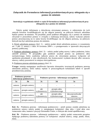Załącznik do Formularza informacji przedstawianych przy ubieganiu się o pomoc de minimis Instrukcja wypełnienia tabeli w części D formularza informacji przedstawianych przy ubieganiu się o pomoc de minimis Należy podać informacje o dotychczas otrzymanej pomocy, w odniesieniu do tych samych kosztów kwalifikujących się do objęcia pomocą, na pokrycie których udzielana będzie pomoc de minimis. Na przykład, jeżeli podmiot ubiegający się o pomoc de minimis otrzymał w przeszłości pomoc w związku z realizacją inwestycji, należy wykazać jedynie pomoc przeznaczoną na te same koszty kwalifikujące się do objęcia pomocą, na pokrycie których ma być udzielona pomoc de minimis. 1. Dzień udzielenia pomocy (kol. 1) – należy podać dzień udzielenia pomocy w rozumieniu art. 2 pkt 11 ustawy z dnia 30 kwietnia 2004 r. o postępowaniu w sprawach dotyczących pomocy publicznej. 2. Podmiot udzielający pomocy (kol. 2) – należy podać pełną nazwę i adres podmiotu, który udzielił pomocy. W przypadku gdy podmiot uzyskał pomoc na podstawie aktu normatywnego, który uzależnia nabycie prawa do otrzymania pomocy wyłącznie od spełnienia przesłanek w nim określonych, bez konieczności wydania decyzji albo zawarcia umowy, należy pozostawić to miejsce niewypełnione. 3. Podstawa prawna udzielenia pomocy (kol. 3) Uwaga: istnieją następujące możliwości łączenia elementów tworzących podstawę prawną udzielenia pomocy, które należy wpisać w poszczególnych kolumnach tabeli w sposób przedstawiony poniżej. Podstawa prawna informacje podstawowe 3a 3b ustawa przepis ustawy ustawa przepis ustawy ustawa ustawa Podstawa prawna - informacje szczegółowe 3c 3d 3e - - - akt wykonawczy akt przepis ustawy wykonawczy przepis ustawy - przepis aktu wykonawczego przepis aktu wykonawczego - decyzja/uchwała/ umowa decyzja/uchwała/ umowa Kol. 3a - Podstawa prawna - informacje podstawowe - jeżeli pomoc została udzielona na podstawie ustawy należy podać w następującej kolejności: datę aktu i tytuł aktu oraz oznaczenie roku, numeru i pozycji Dziennika Ustaw, w którym akt został opublikowany. Kol. 3b - Podstawa prawna - informacje podstawowe - należy podać oznaczenie przepisu będącego podstawą udzielenia pomocy (w kolejności: artykuł ustawy, ustęp, punkt, litera, tiret). Kol. 3c - Podstawa prawna - informacje szczegółowe - jeżeli podstawą udzielenia pomocy był akt wykonawczy do ustawy, należy podać w następującej kolejności: nazwę organu wydającego akt, datę aktu i tytuł aktu oraz oznaczenie roku, numeru i pozycji Dziennika Ustaw, w którym akt został opublikowany. Kol. 3d - Podstawa prawna - informacje szczegółowe - należy podać oznaczenie przepisu aktu wykonawczego będącego podstawą udzielenia pomocy (w kolejności: paragraf, ustęp, punkt, litera, tiret). Kol. 3e - Podstawa prawna - informacje szczegółowe - jeżeli podstawą udzielenia pomocy była decyzja, uchwała lub umowa, należy podać symbol określający ten akt; w przypadku decyzji - numer decyzji, w przypadku uchwały - numer uchwały, w przypadku umowy – numer, przedmiot oraz strony umowy. 4. Numer programu pomocowego/pomocy indywidualnej (kol. 4) - w przypadku gdy pomoc publiczna była udzielona w ramach programu pomocowego, należy podać numer programu pomocowego nadany przez Komisję Europejską, a w przypadku pomocy indywidualnej należy podać numer pomocy indywidualnej nadany przez Komisję Europejską (numery programów pomocowych oraz pomocy indywidualnej zamieszczone są na stronie internetowej Urzędu Ochrony Konkurencji i Konsumentów). W przypadku pomocy de minimis kolumny nr 4 nie wypełnia się. 5. Forma pomocy (kol. 5) - należy podać formę otrzymanej pomocy (np. dotacja, refundacja, ulga podatkowa). 6. Wartość otrzymanej pomocy (kol. 6) - należy podać: a) wartość nominalną pomocy (jako całkowitą wielkość środków finansowych będących podstawą do obliczania wielkości udzielonej pomocy, np. kwota udzielonej pożyczki lub kwota odroczonego podatku) oraz b) wartość brutto (jako ekwiwalent dotacji brutto obliczony zgodnie z rozporządzeniem Rady Ministrów z dnia 11 sierpnia 2004 r. w sprawie szczegółowego sposobu obliczania wartości pomocy publicznej udzielanej w różnych formach (Dz. U. Nr 194, poz. 1983, z późn. zm.)). 7. Przeznaczenie pomocy (kol. 7) – należy podać kod wskazujący przeznaczenie otrzymanej pomocy według poniższej tabeli. Wyszczególnienie 1 A. POMOC HORYZONTALNA Pomoc na działalność badawczą, rozwojową i innowacyjną pomoc na projekty badawczo-rozwojowe pomoc dla młodych innowacyjnych przedsiębiorstw pomoc na techniczne studia wykonalności pomoc na innowacje w obrębie procesów i innowacje organizacyjne w sektorze usług pomoc na usługi doradcze w zakresie innowacji i usługi wsparcia innowacji pomoc na tymczasowe zatrudnienie wysoko wykwalifikowanego personelu pomoc na klastry innowacyjne pomoc na pokrycie kosztów praw własności przemysłowej dla małych i średnich przedsiębiorstw Kod 2 a1.1 a1.2 a1.3 a1.4 a1.5 a1.6 a1.7 a1.8 Pomoc na ochronę środowiska pomoc inwestycyjna umożliwiająca przedsiębiorstwom dostosowanie do norm wspólnotowych (zgodnie z załącznikiem XII Traktatu o przystąpieniu Rzeczpospolitej Polskiej do Unii Europejskiej), zastosowanie norm surowszych niż normy a2.1 wspólnotowe w zakresie ochrony środowiska lub podniesienie poziomu ochrony środowiska w przypadku braku norm wspólnotowych pomoc na nabycie nowych środków transportu spełniających normy surowsze niż normy wspólnotowe lub podnoszących poziom ochrony środowiska w przypadku a2.2 braku norm wspólnotowych pomoc na szybkie przystosowanie małych i średnich przedsiębiorstw do przyszłych a2.3 norm wspólnotowych pomoc w obszarze ochrony środowiska na inwestycje zwiększające oszczędność a2.4 energii pomoc inwestycyjna w obszarze ochrony środowiska na układy kogeneracji o a2.5 wysokiej spraw