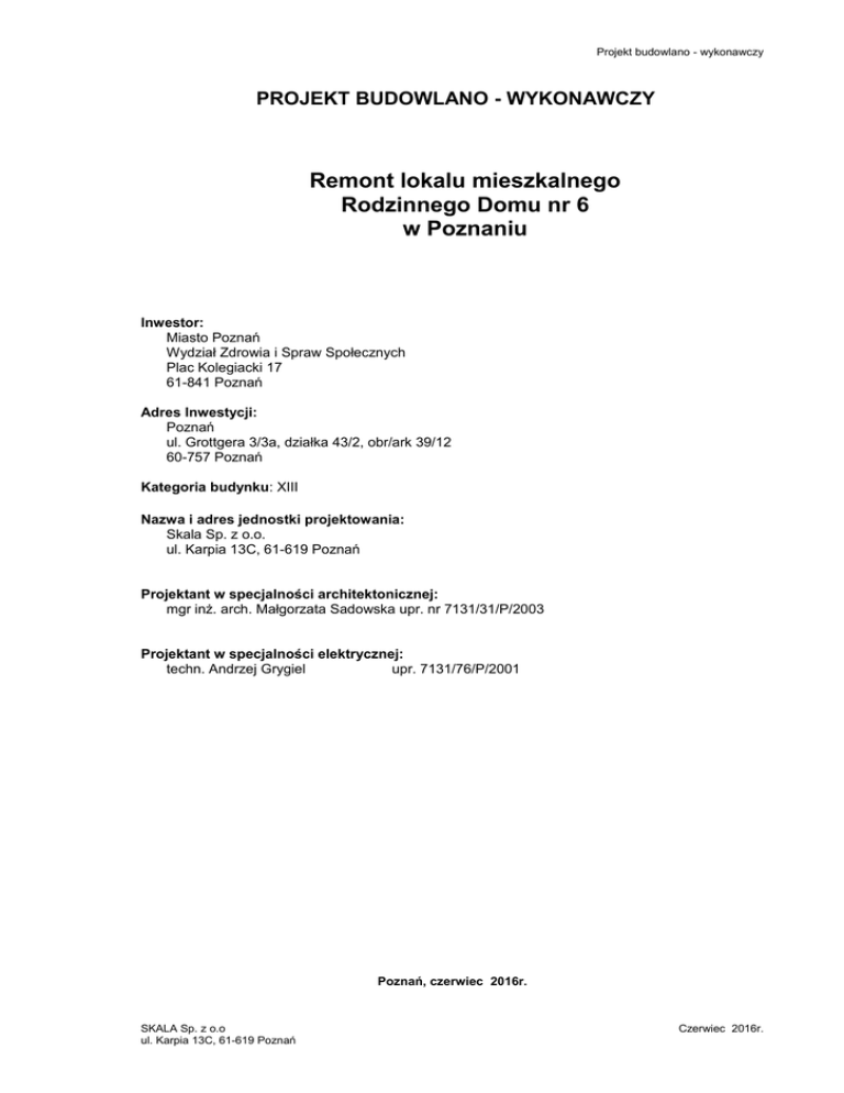 Projekt budowlano - wykonawczy PROJEKT BUDOWLANO - WYKONAWCZY Remont lokalu mieszkalnego Rodzinnego Domu nr 6 w Poznaniu Inwestor: Miasto Poznań Wydział Zdrowia i Spraw Społecznych Plac Kolegiacki 17 61-841 Poznań Adres Inwestycji: Poznań ul. Grottgera 3/3a, działka 43/2, obr/ark 39/12 60-757 Poznań Kategoria budynku: XIII Nazwa i adres jednostki projektowania: Skala Sp. z o.o. ul. Karpia 13C, 61-619 Poznań Projektant w specjalności architektonicznej: mgr inż. arch. Małgorzata Sadowska upr. nr 7131/31/P/2003 Projektant w specjalności elektrycznej: techn. Andrzej Grygiel upr. 7131/76/P/2001 Poznań, czerwiec 2016r. SKALA Sp. z o.o ul. Karpia 13C, 61-619 Poznań Czerwiec 2016r. Projekt budowlano - wykonawczy OŚWIADCZENIE PROJEKTANTÓW Oświadczamy, że projekt remontu lokalu mieszkalnego Rodzinnego Domu nr 6 w Poznaniu przy ul. Grottgera 3/3a w branży budowlanej i elektrycznej, został sporządzony zgodnie z obowiązującymi przepisami oraz zasadami wiedzy technicznej. Projektant w specjalności architektonicznej: mgr inż. arch. Małgorzata Sadowska upr. nr 7131/31/P/2003 Projektant w specjalności elektrycznej: techn. Andrzej Grygiel upr. 7131/76/P/2001 SKALA Sp. z o.o ul. Karpia 13C, 61-619 Poznań Czerwiec 2016r. Projekt budowlano - wykonawczy SPIS ZAWARTOŚCI PROJEKTU BUDOWLANO – WYKONAWCZEGO: Projekt architektoniczno – budowlany: 1.Opis techniczny 2.Część rysunkowa: A/00 A/01 A/02 A/03 A04 Plan sytuacyjny Rzut lokalu mieszkalnego – 1 piętro Przekrój A-A Zestawienie stolarki Zestawienie mebli 1:1000 1:100 1:100 1:50 1:50 3. Informacja dotycząca bezpieczeństwa i ochrony zdrowia. OPIS TECHNICZNY DO PROJEKTU BUDOWLANO – WYKONAWCZEGO W BRANŻY ARCHITEKTONICZNEJ I.PROJEKT ZAGOSPODAROWANIA TERENU. 1. PRZEDMIOT INWESTYCJI Przedmiotem inwestycji jest remont pomieszczeń lokalu mieszkalnego nr 3a, mieszczącego Rodzinny Dom nr 6 w Poznaniu, zlokalizowanych na 1 piętrze budynku wielorodzinnego przy ul. Grottgera 3. Podstawą opracowania są: -umowa o prace projektowe zawarta w dniu 11.04.2016r. pomiędzy Miastem Poznań a Biurem Projektów Skala, -wizja lokalna, -uzgodnienia z Inwestorem, -aktualne normy i przepisy. 2.ISTNIEJĄCY STAN ZAGOSPODAROWANIA TERENU Obecnie teren przy ul. Grottgera 3 jest zabudowany wielokondygnacyjnym budynkiem mieszkalnym oraz obiektami zagospodarowania terenu typu drogi, chodniki, parkingi. 3.PROJEKTOWANE ZAGOSPODAROWANIE TERENU Nie przewiduje się zmian w zagospodarowaniu terenu. 4.ZESTAWIENIE POWIERZCHNI Powierzchnia działki nr 43/2 – 888,00m2 Powierzchnia zabudowy istniejącego budynku :888,00m2 5.INFORMACJA O WPISIE DO REJESTRU ZABYTKÓW Obiekt znajduje się w strefie ochrony konserwatorskiej, nie jest wpisany do rejestru zabytków. Budynek wchodzi w skład założenia urbanistyczno-architektonicznego Maxa Johowa. Numer decyzji A368 z dnia 29 listopada 1991r. oraz A239 z dnia 6 października 1982r. dla najstarszych dzielnic Poznania. Prace remontowe powinny zatem zostać poprzedzone decyzją Miejskiego Konserwatora Zabytków. 6.INFORMACJA O WPŁYWIE EKSPLOATACJI ZAMIERZENIA BUDOWLANEGO. Teren nie znajduje się w granicach terenu górniczego. GÓRNICZEJ NA TEREN 7.INFORMACJA O ZAGROŻENIACH DLA ŚRODOWISKA ORAZ HIGIENY I ZDROWIA. Planowana inwestycja nie spowoduje uciążliwości dla środowiska naturalnego. Obszar oddziaływania inwestycji nie wykracza poza granice działki. SKALA Sp. z o.o ul. Karpia 13C, 61-619 Poznań Czerwiec 2016r. Projekt budowlano - wykonawczy II. PROJEKT ARCHITEKTONICZNO – BUDOWLANY 1.PRZEZNACZENIE I PROGRAM UŻYTKOWY Remont pomieszczeń ma na celu poprawę warunków funkcjonującego w lokalu Rodzinnego domu dziecka. Lokal będzie przeznaczony docelowo dla rodziny złożonej z rodziców oraz dziesięciorga dzieci. 2. CHARAKTERYSTYCZNE PARAMETRY TECHNICZNE. Kubatura – 724,10m3 Powierzchnia użytkowa – 212,97m2 Wysokość pomieszczeń – 3,40m 3.FORMA ARCHITEKTONICZNA, FUNKCJA ORAZ SPOSÓB DOSTOSOWANIA DO OTACZAJĄCEJ ZABUDOWY. Budynek wielorodzinny stanowi dwuczłonową kubaturę na rzucie litery L. Budynek posiada jedną kondygnację podziemną oraz cztery kondygnacje użytkowe o funkcji mieszkalnej. Pokrycie stanowi dach wielospadowy pokryty dachówką karpiówką. W ramach przebudowy nie przewiduje się ingerencji w elewację oraz formę architektoniczną obiektu. 4.DANE KONSTRUKCYJNO – BUDOWLANE Budynek wykonano w konstrukcji murowej ze stropami gęstożebrowymi oraz drewnianymi. Konstrukcja dachu drewniana. Klatki schodowe żelbetowe oraz drewniane. Nie przewiduje się zmian konstrukcyjnych. Schody a). wewnętrzne –istniejące. b). zewnętrzne – istniejące, betonowe na gruncie. Kominy Kominy istniejące murowane. Pomieszczenia są podłączone do kominów grawitacyjnych. Należy sprawdzić drożność przewodów, dokonać ewentualnych napraw i uszczelnień. WYKOŃCZENIE ZEWNĘTRZNE BUDYNKU Elewacje Projekt nie wprowadza zmian w istniejących elewacjach. Kolorystyka oraz podziały – istniejące. Przy robotach remontowych na balkonach należy odtworzyć istniejące tynki w partii cokołowej za pomocą specjalistycznych materiałów przeznaczonych do prac modernizacyjnych. Płytki wymienić, wykonując uszczelnienia z blachy oraz mas typu Sika. Okna Pomieszczenia w granicach opracowania są wyposażone w nową stolarkę okienną PVC, nie podlegającą wymianie. Drzwi Drzwi zewnętrzne – wejściowe posiadają szerokość 150cm. Nie przewiduje się wymiany drzwi. Istniające drzwi wewnętrzbe w lokalu należy oczyścić z warstw farby olejnej, wyprawić i uszczelnić, ewentualnie wymienić wypaczone elementy. Następnie drzwi zaimpregnować lakierobejcą na kolor uzgodniony z Użytkownikiem. Wymienić okucia , zamki drzwiowe i listwy wyłogowe w drewna. Dach Istniejący dach wielospadowy – nie przewiduje się zmian w obrębie dachu. Obróbki blacharskie. Obróbka blacharska dachu oraz rynny i rury spustowe - istniejące. SKALA Sp. z o.o ul. Karpia 13C, 61-619 Poznań Czerwiec 2016r. Pro