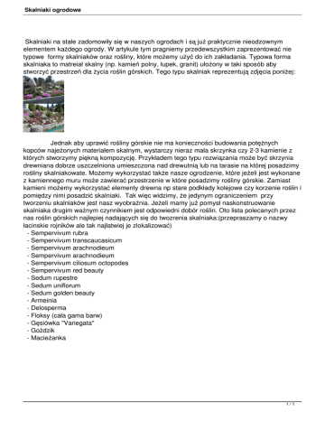 Skalniaki ogrodowe Skalniaki na stałe zadomowiły się w naszych ogrodach i są już praktycznie nieodzownym elementem każdego ogrody. W artykule tym pragniemy przedewszystkim zaprezentować nie typowe formy skalniaków oraz rośliny, które możemy użyć do ich zakładania. Typowa forma skalniaka to matreiał skalny (np. kamień polny, łupek, granit) ułożony w taki sposób aby stworzyć przestrzeń dla życia roślin górskich. Tego typu skalniak reprezentują zdjęcia poniżej: Jednak aby uprawić rośliny górskie nie ma konieczności budowania potężnych kopców najeżonych materiałem skalnym, wystarczy nieraz mała skrzynka czy 2-3 kamienie z których stworzymy piękną kompozycję. Przykładem tego typu rozwiązania może być skrzynia drewniana dobrze uszczelniona umieszczona nad drewutnią lub na tarasie na której posadzimy rośliny skalniakowate. Możemy wykorzystać także nasze ogrodzenie, które jeżeli jest wykonane z kamiennego muru może zawierać przestrzenie w które posadzimy rośliny górskie. Zamiast kamieni możemy wykorzystać elementy drewna np stare podkłady kolejowe czy korzenie roślin i pomiędzy nimi posadzić skalniaki. Tak więc widzimy, że jedynym ograniczeniem przy tworzeniu skalniaków jest nasz wyobraźnia. Jeżeli mamy już pomysł naskonstruowanie skalniaka drugim ważnym czynnikiem jest odpowiedni dobór roślin. Oto lista polecanych przez nas roślin górskich najlepiej nadających się do twozrenia skalniaka:(przepraszamy o nazwy łacinskie rojników ale tak najłatwiej je zlokalizować) - Sempervivum rubra - Sempervivum transcaucasicum - Sempervivum arachnodieum - Sempervivum arachnodieum - Sempervivum ciliosum octopodes - Sempervivum red beauty - Sedum rupestre - Sedum uniflorum - Sedum golden beauty - Armeinia - Delosperma - Floksy (cała gama barw) - Gęsiówka "Variegata" - Gożdzik - Macieżanka 1/1
