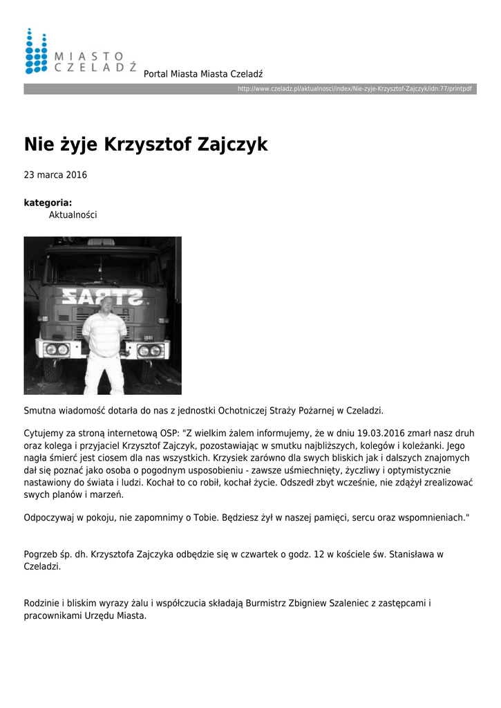 Portal Miasta Miasta Czeladź http://www.czeladz.pl/aktualnosci/index/Nie-zyje-Krzysztof-Zajczyk/idn:77/printpdf Nie żyje Krzysztof Zajczyk 23 marca 2016 kategoria: Aktualności Smutna wiadomość dotarła do nas z jednostki Ochotniczej Straży Pożarnej w Czeladzi. Cytujemy za stroną internetową OSP: "Z wielkim żalem informujemy, że w dniu 19.03.2016 zmarł nasz druh oraz kolega i przyjaciel Krzysztof Zajczyk, pozostawiając w smutku najbliższych, kolegów i koleżanki. Jego nagła śmierć jest ciosem dla nas wszystkich. Krzysiek zarówno dla swych bliskich jak i dalszych znajomych dał się poznać jako osoba o pogodnym usposobieniu - zawsze uśmiechnięty, życzliwy i optymistycznie nastawiony do świata i ludzi. Kochał to co robił, kochał życie. Odszedł zbyt wcześnie, nie zdążył zrealizować swych planów i marzeń. Odpoczywaj w pokoju, nie zapomnimy o Tobie. Będziesz żył w naszej pamięci, sercu oraz wspomnieniach." Pogrzeb śp. dh. Krzysztofa Zajczyka odbędzie się w czwartek o godz. 12 w kościele św. Stanisława w Czeladzi. Rodzinie i bliskim wyrazy żalu i współczucia składają Burmistrz Zbigniew Szaleniec z zastępcami i pracownikami Urzędu Miasta.
