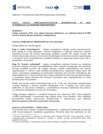 Załącznik nr 1 do Standardu usługi informacyjnej opieka nad klientem LISTA USŁUG SPECJALISTYCZNYCH W PODZIALE NA POZIOMY DOSTĘPNOŚCI DOSTĘPNYCH W KSU POZIOM I Usługi systemowe KSU oraz usługi testowane pilotażowo, na realizację których PARP zawiera umowę lub porozumienie z usługodawcą. USŁUGA DORADCZA PROINNOWACYJNA KSI KSU Usługa składa się z dwóch etapów. Etap I: Audyt technologiczny1 – będący szczególnym rodzajem audytu innowacyjności, który polega na ocenie potencjału i potrzeb usługobiorcy w zakresie możliwości i potrzeb wdrożenia nowego lub istotnie ulepszonego produktu (wyrobu lub usługi), nowego lub istotnie ulepszonego procesu, nowej metody marketingowej lub nowej metody organizacyjnej w przyjętych przez przedsiębiorstwo zasadach działania, w organizacji miejsca pracy lub w stosunkach z otoczeniem. Etap II: Transfer technologii2 – będący szczególnym rodzajem doradza we wdrożeniu innowacji służącej rozwojowi przedsiębiorstwa przez poprawę istniejącego lub wdrożenie nowego produktu (wyrobu lub usługi), procesu, metody marketingowej lub metody organizacyjnej w zakresie zasad działania przedsiębiorstwa, organizacji miejsca pracy lub relacji z otoczeniem, polegającej na przekazaniu informacji oraz procedur niezbędnych, aby jeden podmiot był w stanie powielać pracę innego podmiotu lub stosować rozwiązania będące w posiadaniu innego podmiotu lub stosować rozwiązania nowe zaprojektowane na swoje potrzeby przez inny podmiot. Średni czas trwania audytu technologicznego to ok. 3 dni, czas aktywnego zaangażowania w pomoc doradczą w procesie transferu technologii to ok. 6 tygodni, przy czym należy podkreślić, że cały proces współpracy z przedsiębiorcą dotyczący znalezienia oraz pomocy we wdrożeniu technologii trwa nawet do 24 miesięcy. Usługa dostępna odpłatnie w ośrodkach Krajowej Sieci Innowacji KSU, które podpisały z PARP porozumienie o świadczeniu tego rodzaju usług. Lista ośrodków, które podpisały porozumienie będzie sukcesywnie aktualizowana i zamieszczona pod adresem: http://ksu.parp.gov.pl/pl/oferta_ksu/porady_innowacyjne. USŁUGA FINANSOWA – POŻYCZKA Pożyczki dla mikro, małych i średnich przedsiębiorstw, w niektórych Funduszach również dla osób rozpoczynających działalność gospodarczą. Pożyczka może być udzielona na cele 1 Powinien doprowadzić, co najmniej do dokonania przez Ośrodek KSI KSU oceny potencjału i potrzeb technologicznych przedsiębiorcy, możliwości i potrzeb w zakresie rozwoju wytwarzanych przez niego produktów lub usług. 2 Powinien doprowadzić, co najmniej do zawarcia umowy pomiędzy usługobiorcą a dostawcą technologii. 1 inwestycyjne, obrotowe lub inwestycyjno-obrotowe.Niekiedy wymagany jest od klienta wkład własny. . Spłata pożyczki musi być zabezpieczona obligatoryjnie w postaci weksla in blanco oraz często dodatkowo w innej indywidualnie ustalanej formie, np.: poręczenie funduszu poręczeniowego, poręczenie przez osoby trzecie, hipoteka, przewłaszczenie, cesja wierzytelności z umów. Rodzaje zabezpieczeń mogą być łączone. Kwota pożyczki ustalana jest indywidualnie. W niektórych funduszach może ona wynosić nawet 500 tys. zł na jeden cel. Maksymalny okres spłaty pożyczki mieści się w przedziale 36 – 60 miesięcy. . Dopuszczalny jest 6 miesięczny okres karencji w spłacie rat kapitału. Koszt oprocentowania pożyczek wynosi średnio 5,5% i jest uzależniony od stóp rynkowych- oprocentowanie ustalane jest nie niżej niż stopa referencyjna wynosząca obecnie 4,91% (http://www.uokik.gov.pl/stopa_referencyjna_i_archiwum.php). Niektóre fundusze udzielają pożyczek niżej oprocentowanych, na zasadach pomocy de minimis. Od przyznanej pożyczki pobierana jest opłata manipulacyjna ustalana indywidualnie przez poszczególne fundusze. Usługa realizowana jest przez Fundusze Pożyczkowe (FP). Lista FP KSU znajduje się w niezbędniku w SIKSU. USŁUGA FINANSOWA – PORĘCZENIE Poręczenia kredytów, pożyczek oraz wadiów przetargowych. Poręczenia udzielane są mikro, małym i średnim przedsiębiorstwom, które mogą uzyskać kredyt lub pożyczkę, jednak nie posiadają wystarczającego zabezpieczenia spłaty. Zabezpieczeniem na wypadek roszczeń wynikających z tytułu wykonania obowiązków poręczyciela jest weksel własny in blanco przedsiębiorcy wraz z deklaracją wekslową oraz ewentualnie zabezpieczenia dodatkowe. Udzielone poręczenie jest terminowe i udzielane na okres zgodny z okresem kredytowania. Okres poręczenia może zostać przedłużony o maksymalnie 3 miesiące i trwa do momentu spłaty zobowiązania. Opłaty i prowizje pobierane są jedynie za okres od daty zawarcia umowy poręczenia do terminu ważności poręczenia. Wysokość prowizji najczęściej uzależniona jest od okresu, na jaki zawarta została umowa kredytu / pożyczki. Wartość poręczenia indywidualnego wynosi maksymalnie 80% kwoty udzielonego kapitału kredytu lub pożyczki (bez odsetek i opłat dodatkowych). Za udzielone poręczone FPK pobierają opłaty manipulacyjne, w zależności od funduszu sięgające maksymalnie 3% wartości poręczenia. Usługa realizowana jest przez Fundusze Poręczeniowe (FPK). Lista FPK współpracujących w KSU znajduje się w niezbędniku w SI KSU. DORADZTWO W OPTYMALIZACJI KOSZTÓW porozumienia). Usługa optymalizacji kosztów składa się z trzech etapów: I. (Aktywna po podpisaniu Etap I – wstępne rozpoznanie potrzeb przedsiębiorstwa w zakresie finansowych, 2 II. III. rachunkowych, podatkowych i prawnych aspektów jego funkcjonowania; Etap II – przeprowadzenie audytu zarządzania finansami w przedsiębiorstwie oraz opracowanie Strategii Optymalizacji Kosztów Prowadzenia Działalności Gospodarczej, na które może składać się, m.in.: a) Audyt finansowy (analiza modelu biznesowego): analiza przychodów i kosztów, analiza rynku, analiza wskaźnikowa, analiza struktury kapitału obrotowego i przepływ