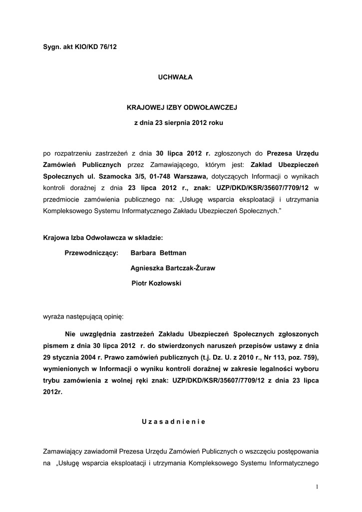 Sygn. akt KIO/KD 76/12 UCHWAŁA KRAJOWEJ IZBY ODWOŁAWCZEJ z dnia 23 sierpnia 2012 roku po rozpatrzeniu zastrzeŜeń z dnia 30 lipca 2012 r. zgłoszonych do Prezesa Urzędu Zamówień Publicznych przez Zamawiającego, którym jest: Zakład Ubezpieczeń Społecznych ul. Szamocka 3/5, 01-748 Warszawa, dotyczących Informacji o wynikach kontroli doraźnej z dnia 23 lipca 2012 r., znak: UZP/DKD/KSR/35607/7709/12 w przedmiocie zamówienia publicznego na: „Usługę wsparcia eksploatacji i utrzymania Kompleksowego Systemu Informatycznego Zakładu Ubezpieczeń Społecznych.” Krajowa Izba Odwoławcza w składzie: Przewodniczący: Barbara Bettman Agnieszka Bartczak-śuraw Piotr Kozłowski wyraŜa następującą opinię: Nie uwzględnia zastrzeŜeń Zakładu Ubezpieczeń Społecznych zgłoszonych pismem z dnia 30 lipca 2012 r. do stwierdzonych naruszeń przepisów ustawy z dnia 29 stycznia 2004 r. Prawo zamówień publicznych (t.j. Dz. U. z 2010 r., Nr 113, poz. 759), wymienionych w Informacji o wyniku kontroli doraźnej w zakresie legalności wyboru trybu zamówienia z wolnej ręki znak: UZP/DKD/KSR/35607/7709/12 z dnia 23 lipca 2012r. Uzasadnienie Zamawiający zawiadomił Prezesa Urzędu Zamówień Publicznych o wszczęciu postępowania na „Usługę wsparcia eksploatacji i utrzymania Kompleksowego Systemu Informatycznego 1 Zakładu Ubezpieczeń Społecznych" (dalej KSI) w trybie zamówienia z wolnej ręki na podstawie art. 67 ust. 1 pkt. 1 lit a) i b) ustawy z dnia 29 stycznia 2004r. Prawo zamówień publicznych (Dz. U. z 2007 r. Nr 233, poz. 1655 z późn. zm.). Przedmiot zamówienia obejmował świadczenie usługi wsparcia, eksploatacji i utrzymania tego systemu oraz wykonanie dokumentacji projektowej w oznaczonym zakresie w czasie od 11.10.2010 r. do 10.10.2013 r. W przebiegu kontroli przedmiotowego postępowania przeprowadzonej w okresie od 8 marca 2012 r. do 23 lipca 2012 r. w Informacji o jej wyniku, Prezes Urzędu na podstawie udostępnionej dokumentacji przedstawił następujący stan faktyczny. W wyniku przeprowadzonego postępowania w trybie negocjacji z zachowaniem konkurencji, w dniu 10.10.1997 r. zawarta została z firmą Prokom Software S. A. (obecnie Asseco Poland S.A. (dalej „Wykonawca”), umowa o zaprojektowanie i wykonanie KSI ZUS oraz o przekazanie do eksploatacji oprogramowania uŜytkowego w ZUS (dalej „umowa podstawowa"). Następnie w latach 2000-2008 Zamawiający udzielił Wykonawcy kolejnych zamówień publicznych obejmujących modyfikację, rozbudowę oraz konserwację KSI. W dniu wszczęcia postępowania będącego przedmiotem kontroli, oprócz umowy podstawowej, w zakresie rozwoju i utrzymania KSI, Zamawiający był związany z Wykonawcą Umową uzupełniającą 7 nr TZ/370/97/08 oraz Umową nr TZ/370/105/08 na świadczenie usług administrowania i eksploatowania wydzielonymi obszarami KSI w Zakładzie Ubezpieczeń Społecznych (obie umowy z dnia 16.12.2008 r.). Termin obowiązywania wszystkich trzech umów upływał dnia 10.10.2010 roku. Wygaśnięcie wszystkich trzech umów w tym samym terminie oznaczało zaprzestanie przez dotychczasowego Wykonawcę realizacji prac rozwojowych nad systemem (w szczególności dostarczania zmian wynikających ze zmian w otoczeniu prawnym) oraz zaprzestanie świadczenia usług (w szczególności w zakresie administrowania i eksploatowania systemu). Jednocześnie, w przekonaniu ZUS, z przyczyn technicznych o obiektywnym charakterze oraz z przyczyn związanych z ochroną praw wyłącznych nie było moŜliwe powierzenie od dnia 11.10.2010 r. realizacji prac rozwojowych i świadczenia usług utrzymaniowych w zakresie zbliŜonym do dotychczas realizowanego Ŝadnemu innemu podmiotowi niŜ Wykonawca Asseco Poland S. A., a z przyczyn organizacyjnych i merytorycznych nie było moŜliwe przejęcie tych wysoko specjalistycznych zadań do samodzielnego wykonania przez Zamawiającego, zaś wybór i wdroŜenie wykonawcy wybranego w procedurze otwartej wymaga czasu. Za konieczne przyjął więc Zamawiający udzielenie zamówienia na świadczenie usług utrzymaniowych KSI w trybie z wolnej ręki dotychczasowemu Wykonawcy na okres 36 miesięcy. Zamawiający w uzasadnieniu wyboru trybu zamówienia podniósł, iŜ KSI jest systemem 2 unikalnym w skali kraju, a takŜe Europy i świata, który jest definiowany przez niezakończone procesy legislacyjne - polskie oraz europejskie. System został opracowany od podstaw i odznacza się unikalnymi rozwiązaniami technicznymi i technologicznymi, sposobem i zasadami działania oraz został wykonany na podstawie indywidualnie definiowanych parametrów i standardów (system dedykowany). Zamawiający wskazał, iŜ KSI wspomaga działania w obszarach ubezpieczeń, świadczeń oraz ekonomiki, i tylko w zakresie dwóch pierwszych celów - załoŜenia i wymagania dla systemu sformułowano na bazie 19 ustaw i 48 aktów wykonawczych. Podkreślając skalę oraz stopień skomplikowania KSI, Zamawiający przedstawił zakres zadań tego systemu. Podnosił równieŜ, Ŝe ze względu na unikalny i niepowtarzalny charakter KSl zarówno w obszarze wymagań biznesowych, jak równieŜ częstotliwość wprowadzania zmian przy jednoczesnym wymaganiu zachowania ciągłości eksploatacji i wysokiej dostępności systemu, wytworzone zostały dedykowane narzędzia i procedury pozwalające administrować systemem w sposób gwarantujący jego wymaganą dostępność dla uŜytkowników. Na bazie standardów zapewnienia jakości (ISO) oraz najlepszych praktyk dotyczących eksploatacji i utrzymania systemów informatycznych (ITIL) został przygotowany zbiór norm, parametrów i standardów, stanowiący unikalną metodykę utrzymaniową KSl, niezbędną dla terminowej implementacji zmian przy jednoczesnym zapewnieniu sprawnej bieŜącej eksploatacji systemu. Ponadto, zróŜnicowanych dla zapewnienia procesów wsparcia biznesowych, informatycznego realizowanych znaczącej przez liczbie Zamawiającego, wykorzystywany jest złoŜony zesta