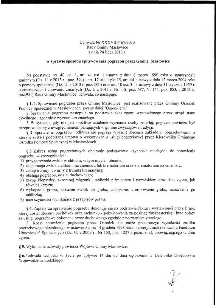 U chwała N r XXXVIII/! 67/2013 Rady Gminy Masłowice z dnia 24 lipca 2013 r. w sprawie sposobu sprawowania pogrzebu przez Gminę Masłowice Na podstawie art. 40 ust. 1, art. 41 ust. 1 ustawy z dnia 8 marca 1990 roku o samorządzie gminnym (Dz. U. z 2013 r. poz. 5 9 4 ), art. 17 ust. 1 pkt 15, art. 44 ustawy z dnia 12 marca 2004 roku o pomocy społecznej (Dz. U. z 2013 r. poz. 182 ) oraz art. 10 ust. 3 i 4 ustawy z dnia 31 stycznia 1959 r. o cmentarzach i chowaniu zmarłych (Dz. U z 2011 r. Nr 118, poz. 687, N r 144, poz. 853, z 2012 r., poz.951) Rada Gminy M asłow ice uchwala, co następuje: § 1. 1. Sprawienie pogrzebu przez Gminę Masłowice jest realizowane przez Gminny Ośrodek Pomocy Społecznej w M asłowicach, zwany dalej "Ośrodkiem." 2. Sprawienie pogrzebu następuje na podstawie aktu zgonu wystawionego przez urząd stanu cywilnego , zgodnie z wyznaniem zmarłego. 3. W sytuacji, gdy nie je st możliwe ustalenie wyznania osoby zmarłej, pogrzeb powinien być przeprowadzony z uwzględnieniem panujących w gminie zwyczajów i tradycji. § 2. Sprawienie pogrzebu odbywa się poprzez wydanie zlecenia zakładowi pogrzebowemu, z którym została podpisana um owa o wykonywaniu usługi pogrzebowej przez Kierownika Gminnego Ośrodka Pomocy Społecznej w M asłowicach . § 3 . Zakres usług pogrzebowych obejmuje podstawowe czynności niezbędne do sprawienia pogrzebu, w szczególności: 1) przygotowanie zwłok w chłodni, w tym mycie i ubranie; 2) eksportacja zwłok z chłodni na cm entarz lub krematorium oraz z krematorium na cmentarz; 3) zakup trumny lub urny z trum ną kremacyjną; 4) obsługa pogrzebu, udział duchownego; 5) zakup klepsydry, skromnej wiązanki, tabliczki z imieniem i nazwiskiem oraz datą zgonu, jak również krzyża; 6) wykopanie grobu, złożenie zwłok do grobu, zakopanie, uformowanie grobu, oznaczenie go tabliczką; 7) inne czynności wynikające z przepisów prawa. § 4 . Zapłaty za sprawienie pogrzebu dokonuje się na podstawie faktury wystawionej przez firmę, której został zlecony pochów ek oraz rachunku - pokwitowania za posługę duszpasterską i inne opłaty za usługi pogrzebowe dokonane przez duchownego zgodnie z wyznaniem zmarłego. 2. Koszt sprawienia pogrzebu przez Ośrodek nie może przekroczyć wysokości zasiłku pogrzebowego określonego w ustawie z dnia 14 grudnia 1998 roku o emeryturach i rentach z Funduszu Ubezpieczeń Społecznych (Dz. U. z 2009 r., Nr 153, poz. 1227 z późn. zm.), obowiązującego w dniu zgonu. § 5 . Wykonanie uchwały powierza W ójtowi Gminy Masłowice. § 6. Uchwała wchodzi w życie po upływie 14 dni od dnia ogłoszenia w Dzienniku Urzędowym W ojewództwa Łódzkiego. .'N Ir"' W- ,