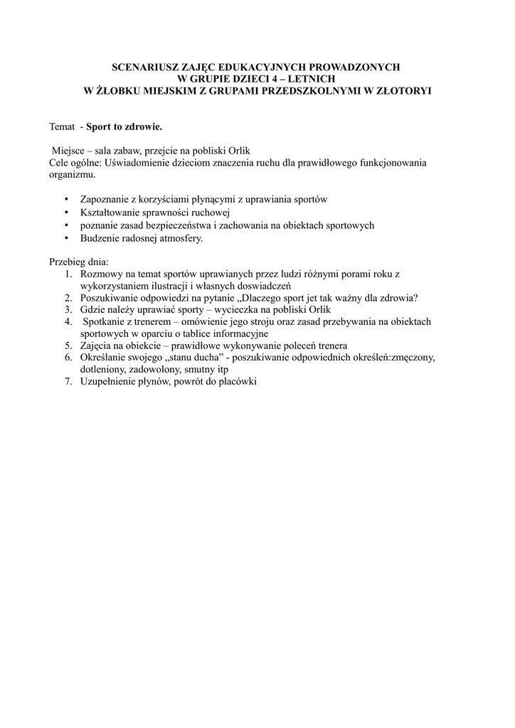 SCENARIUSZ ZAJĘC EDUKACYJNYCH PROWADZONYCH W GRUPIE DZIECI 4 – LETNICH W ŻŁOBKU MIEJSKIM Z GRUPAMI PRZEDSZKOLNYMI W ZŁOTORYI Temat - Sport to zdrowie. Miejsce – sala zabaw, przejcie na pobliski Orlik Cele ogólne: Uświadomienie dzieciom znaczenia ruchu dla prawidłowego funkcjonowania organizmu. • • • • Zapoznanie z korzyściami płynącymi z uprawiania sportów Kształtowanie sprawności ruchowej poznanie zasad bezpieczeństwa i zachowania na obiektach sportowych Budzenie radosnej atmosfery. Przebieg dnia: 1. Rozmowy na temat sportów uprawianych przez ludzi różnymi porami roku z wykorzystaniem ilustracji i własnych doswiadczeń 2. Poszukiwanie odpowiedzi na pytanie „Dlaczego sport jet tak ważny dla zdrowia? 3. Gdzie należy uprawiać sporty – wycieczka na pobliski Orlik 4. Spotkanie z trenerem – omówienie jego stroju oraz zasad przebywania na obiektach sportowych w oparciu o tablice informacyjne 5. Zajęcia na obiekcie – prawidłowe wykonywanie poleceń trenera 6. Określanie swojego „stanu ducha” - poszukiwanie odpowiednich określeń:zmęczony, dotleniony, zadowolony, smutny itp 7. Uzupełnienie płynów, powrót do placówki