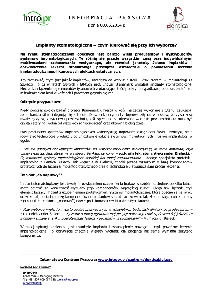 INFORMACJA PRASOWA z dnia 03.06.2014 r. Implanty stomatologiczne – czym kierować się przy ich wyborze? Na rynku stomatologicznym obecnych jest bardzo wielu producentów i dystrybutorów systemów implantologicznych. Te różnią się przede wszystkim ceną oraz indywidualnymi możliwościami zastosowania medycznego, ale również jakością. Jakość implantów i doświadczenie lekarza stomatologa przesądza ostatecznie o powodzeniu leczenia implantologicznego i końcowych efektach estetycznych. Aby zrozumieć, czym jest jakość implantów, zacznijmy od krótkiej historii... Prekursorami w implantologii są Szwedzi. To tu w latach 50-tych i 60-tych prof. Ingvar Branemark wynalazł implanty stomatologiczne. Mechanizm łączenia się elementów tytanowych z otaczającą kością odkrył przypadkowo, podczas badań nad mikrokrążeniem krwi w kościach i procesem gojenia się ran. Odkrycie przypadkowe Kiedy podczas swoich badań profesor Branemark umieścił w kości narzędzia wykonane z tytanu, zauważył, że te bardzo silnie integrują się z kością. Dalsze eksperymenty doprowadziły do wniosków, że żywa kość trwale łączy się z tytanową powierzchnią, jeśli spełnione są określone warunki: powierzchnia ta musi być czysta i sterylna, wolna od wszelkich zanieczyszczeń oraz aktywna biologicznie. Dziś producenci systemów implantologicznych wykorzystują najnowsze osiągnięcia fizyki i biofizyki, stale rozwijając technologię produkcji, co umożliwia ewolucję systemów implantacyjnych i rozwój implantologii w ogóle. - Nie ma gorszych czy lepszych implantów, bo wszyscy producenci wykorzystują te same materiały, czyli czysty tytan lub jego stopy, na przykład z tlenkiem cyrkonu – podkreśla lek. stom. Aleksander Bielecki. Są natomiast systemy implantologiczne bardziej lub mniej zaawansowane – dodaje specjalista protetyk i implantolog z Dentica Bieleccy. Jak wyjaśnia dr Bielecki, chodzi przede wszystkim o bazę komponentów protetycznych do leczenia implantoprotetycznego oraz o technologie ułatwiające sam proces leczenia. Implant „do naprawy”? Implant stomatologiczny jest trwałym rozwiązaniem uzupełnienia braków w uzębieniu. Jednak po kilku latach może pojawić się konieczność wymiany jego komponentów. Najczęściej zużyciu ulega tzw. łącznik, czyli element łączący implant z uzupełnieniem protetycznym. Systemy implantologiczne, które obecne są na rynku od wielu lat, posiadają bazę komponentów do implantów sprzed bardzo wielu lat. Nie ma więc problemu, aby ząb na takim implancie „naprawić”, nawet po kilkunastu czy kilkudziesięciu latach! - Przy wyborze implantów warto zaufać sprawdzonym w wieloletnich badaniach klinicznych producentom – zaleca Aleksander Bielecki. - Systemy o mniej ugruntowanej pozycji rynkowej, choć są doskonałej jakości, to z czasem znikają z rynku, pozostawiając lekarzy i pacjentów „z problemami” – tłumaczy dr Bielecki. W takiej sytuacji konieczne jest usunięcie implantu i wszczepienie nowego – czyli powtórne leczenie implantologiczne. To oczywiście znacznie większy wydatek dla pacjenta niż sama wymiana zużytego komponentu. Internetowe Centrum Prasowe: www.intropr.pl/centrum/denticabieleccy KONTAKT DLA MEDIÓW: INTRO PR Adam Misa – Managing Director T: (+48) 507 099 957 | E: [email protected] WWW.intropr.pl Szybsze gojenie Obok dostępności komponentów, bardzo istotne znaczenie mają również technologie ułatwiające i przyśpieszające samo leczenie. Producenci implantów nieustannie doskonalą ich powierzchnie, aby proces łączenia tytanowej śruby z kością (osteointegracja) przebiegał szybciej i z jak największą gwarancją powodzenia przyjęcia się wszczepu. Powierzchnie implantów są specjalnie piaskowane, a niektóre są dodatkowo kondycjonowane chemicznie, co znacznie przyśpiesza proces osteointegracji. Dla pacjenta oznacza to szybsze leczenie implantologiczne, bo taki implant jest stabilny nawet już po 4 tygodniach od zabiegu implantacji i może być obciążony właściwym rozwiązaniem protetycznym. Ocena właściwej osteointegracji implantu i rozpoczęcia etapu protetycznego leczenia powinna być efektem obiektywnego badania poziomu osteointegracji i stabilizacji implantu za pomocą specjalnego czujnika elektronicznego, a nie subiektywnej oceny lekarza. - Głównym i podstawowym czynnikiem decydującym o trwałości implantu jest jego zintegrowanie się z kością. Z wielu badań oraz z mojego osobistego doświadczenia mogę stwierdzić, że rodzaj powierzchni implantu ma bardzo duży wpływ na poziom i szybkość osteointegracji implantu z kością – mówi dr Aleksander Bielecki. - Implanty ze specjalnymi powierzchniami ułatwiającymi adhezję białek znacznie szybciej łączą się z kością i są bardziej stabilne – dodaje specjalista. Dożywotnia gwarancja Jak już wcześniej wspomniano, uzupełnienie brakującego zęba w oparciu o implant stomatologiczny jest rozwiązaniem trwałym. Ale zdarzają się sytuacje, gdy implant ulega uszkodzeniu i konieczna jest jego wymiana na nowy. Tu ważna rolę odgrywa gwarancja producenta. Większość systemów implantologicznych objęta jest dożywotnią gwarancją. To oznacza, że w przypadku konieczności wymiany implantu, producent gwarantuje pacjentowi nowy implant i to za darmo. - I znowu, warto wybierać producentów z długoletnią obecnością na rynku. Nic nam bowiem po takiej dożywotniej gwarancji, jeśli producent po prostu zniknie z rynku – zwraca uwagę implantolog i protetyk z Dentica Bieleccy. Poza jakością implantów istotną rolę odgrywa również (a nawet przede wszystkim!) sam lekarz. Warto wiedzieć, że nie każdy stomatolog może wykonywać zabiegi implantologiczne. Rekomendowanymi specjalizacjami do tego rodzaju zabiegów w zakresie stomatologii są periodontologia, chirurgia i protetyka. Tylko lekarz specjalista Warto wybierać gabinety, w których stale pracują lekarze impl