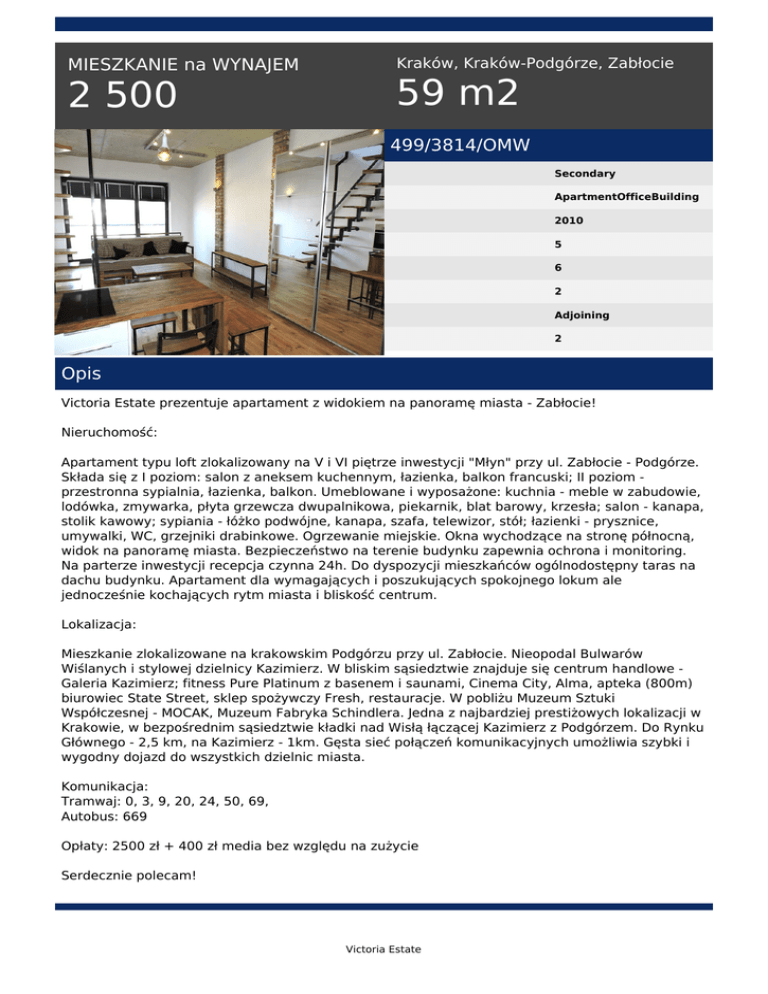 MIESZKANIE na WYNAJEM 2 500 Kraków, Kraków-Podgórze, Zabłocie 59 m2 499/3814/OMW Secondary ApartmentOfficeBuilding 2010 5 6 2 Adjoining 2 Opis Victoria Estate prezentuje apartament z widokiem na panoramę miasta - Zabłocie! Nieruchomość: Apartament typu loft zlokalizowany na V i VI piętrze inwestycji "Młyn" przy ul. Zabłocie - Podgórze. Składa się z I poziom: salon z aneksem kuchennym, łazienka, balkon francuski; II poziom przestronna sypialnia, łazienka, balkon. Umeblowane i wyposażone: kuchnia - meble w zabudowie, lodówka, zmywarka, płyta grzewcza dwupalnikowa, piekarnik, blat barowy, krzesła; salon - kanapa, stolik kawowy; sypiania - łóżko podwójne, kanapa, szafa, telewizor, stół; łazienki - prysznice, umywalki, WC, grzejniki drabinkowe. Ogrzewanie miejskie. Okna wychodzące na stronę północną, widok na panoramę miasta. Bezpieczeństwo na terenie budynku zapewnia ochrona i monitoring. Na parterze inwestycji recepcja czynna 24h. Do dyspozycji mieszkańców ogólnodostępny taras na dachu budynku. Apartament dla wymagających i poszukujących spokojnego lokum ale jednocześnie kochających rytm miasta i bliskość centrum. Lokalizacja: Mieszkanie zlokalizowane na krakowskim Podgórzu przy ul. Zabłocie. Nieopodal Bulwarów Wiślanych i stylowej dzielnicy Kazimierz. W bliskim sąsiedztwie znajduje się centrum handlowe Galeria Kazimierz; fitness Pure Platinum z basenem i saunami, Cinema City, Alma, apteka (800m) biurowiec State Street, sklep spożywczy Fresh, restauracje. W pobliżu Muzeum Sztuki Współczesnej - MOCAK, Muzeum Fabryka Schindlera. Jedna z najbardziej prestiżowych lokalizacji w Krakowie, w bezpośrednim sąsiedztwie kładki nad Wisłą łączącej Kazimierz z Podgórzem. Do Rynku Głównego - 2,5 km, na Kazimierz - 1km. Gęsta sieć połączeń komunikacyjnych umożliwia szybki i wygodny dojazd do wszystkich dzielnic miasta. Komunikacja: Tramwaj: 0, 3, 9, 20, 24, 50, 69, Autobus: 669 Opłaty: 2500 zł + 400 zł media bez względu na zużycie Serdecznie polecam! Victoria Estate Małgorzata Wicha tel. +48 511 560 721 email: [email protected] Victoria Estate Powered by TCPDF (www.tcpdf.org)