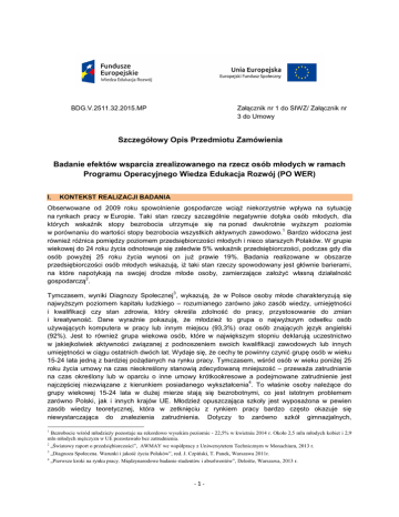 BDG.V.2511.32.2015.MP Załącznik nr 1 do SIWZ/ Załącznik nr 3 do Umowy Szczegółowy Opis Przedmiotu Zamówienia Badanie efektów wsparcia zrealizowanego na rzecz osób młodych w ramach Programu Operacyjnego Wiedza Edukacja Rozwój (PO WER) I. KONTEKST REALIZACJI BADANIA Obserwowane od 2009 roku spowolnienie gospodarcze wciąż niekorzystnie wpływa na sytuację na rynkach pracy w Europie. Taki stan rzeczy szczególnie negatywnie dotyka osób młodych, dla których wskaźnik stopy bezrobocia utrzymuje się na ponad dwukrotnie wyższym poziomie 1 w porównaniu do wartości stopy bezrobocia wszystkich aktywnych zawodowo. Bardzo widoczna jest również różnica pomiędzy poziomem przedsiębiorczości młodych i nieco starszych Polaków. W grupie wiekowej do 24 roku życia odnotowuje się zaledwie 5% wskaźnik przedsiębiorczości, podczas gdy dla osób powyżej 25 roku życia wynosi on już prawie 19%. Badania realizowane w obszarze przedsiębiorczości osób młodych wskazują, iż taki stan rzeczy spowodowany jest głównie barierami, na które napotykają na swojej drodze młode osoby, zamierzające założyć własną działalność 2 gospodarczą . 3 Tymczasem, wyniki Diagnozy Społecznej , wykazują, że w Polsce osoby młode charakteryzują się najwyższym poziomem kapitału ludzkiego – rozumianego zarówno jako zasób wiedzy, umiejętności i kwalifikacji czy stan zdrowia, który określa zdolność do pracy, przystosowanie do zmian i kreatywność. Dane wyraźnie pokazują, że młodzież to grupa o najwyższym odsetku osób używających komputera w pracy lub innym miejscu (93,3%) oraz osób znających język angielski (92%). Jest to również grupa wiekowa osób, które w największym stopniu deklarują uczestnictwo w jakiejkolwiek aktywności związanej z podnoszeniem swoich kwalifikacji zawodowych lub innych umiejętności w ciągu ostatnich dwóch lat. Wydaje się, że cechy te powinny czynić grupę osób w wieku 15-24 lata jedną z bardziej pożądanych na rynku pracy. Tymczasem, wśród osób w wieku poniżej 25 roku życia umowy na czas nieokreślony stanowią zdecydowaną mniejszość – przeważa zatrudnianie na czas określony lub w oparciu o inne umowy krótkookresowe a podejmowane zatrudnienie jest 4 najczęściej niezwiązane z kierunkiem posiadanego wykształcenia . To właśnie osoby należące do grupy wiekowej 15-24 lata w dużej mierze stają się bezrobotnymi, co jest istotnym problemem zarówno Polski, jak i innych krajów UE. Młodzież opuszczająca szkoły jest wyposażona w pewien zasób wiedzy teoretycznej, która w zetknięciu z rynkiem pracy bardzo często okazuje się niewystarczająca do znalezienia zatrudnienia. Dotyczy to zarówno szkół gimnazjalnych, 1 Bezrobocie wśród młodzieży pozostaje na rekordowo wysokim poziomie - 22,5% w kwietniu 2014 r. Około 2,5 mln młodych kobiet i 2,9 mln młodych mężczyzn w UE pozostawało bez zatrudnienia. 2 „Światowy raport o przedsiębiorczości”, AWMAY we współpracy z Uniwersytetem Technicznym w Monachium, 2013 r. 3 „Diagnoza Społeczna. Warunki i jakość życia Polaków”, red. J. Czpiński, T. Panek, Warszawa 2011r. 4 „Pierwsze kroki na rynku pracy. Międzynarodowe badanie studentów i absolwentów”, Deloitte, Warszawa, 2013 r. -1- ponadpodstawowych o profilu ogólnym czy zawodowym, ale również kształcenia na poziomie wyższym – według danych GUS na koniec 2013 r. blisko 259 tys. bezrobotnych to osoby z wyższym 5 wykształceniem, co stanowi 12% ogółu bezrobotnych (w 2012 r -11%). 6 Międzynarodowe badania studentów i absolwentów wskazują, że jedną z przyczyn wysokiego bezrobocia wśród osób młodych jest niedopasowanie ich kompetencji do potrzeb i oczekiwań pracodawców oraz brak doświadczenia zawodowego, co dotyczyć może zarówno niedopasowania wiedzy uzyskanej w procesie kształcenia, jak i umiejętności zdobytych na późniejszych etapach edukacji. W publikacji Głównego Urzędu Statystycznego „Wejście ludzi młodych na rynek pracy w Polsce w 2009 r.”, jako możliwe wyjaśnienia takiego stanu rzeczy wskazuje się brak doświadczenia zawodowego, uznawany za najczęstszą przyczynę trudności ludzi młodych na rynku pracy oraz wysokie wymagania, jakie mają ludzie młodzi w stosunku do pierwszej pracy. Analizując sytuację, warto także przyjrzeć się grupie osób, które nie kontynuują edukacji, nie uczestniczą w kształceniu oraz nie pracują (osoby z tzw. grupy NEET - Not in Education, Employment, or Training). Odsetek ludzi młodych, którzy nie są zatrudnieni i którzy nie uczestniczą w żadnej formie edukacji lub szkolenia jest w Polsce niższy w porównaniu do średniej UE-27, ale podobnie jak w innych państwach członkowskich, wzrasta od 2008 roku. Wg danych Eurostatu z lipca 2012 r. wskaźnik ten kształtuje się na poziomie 12,9% w całej Unii, podczas gdy w Polsce wynosi obecnie 11,6%. W odpowiedzi na coraz wyższy poziom bezrobocia ludzi młodych w Europie, Komisja Europejska podjęła działania mające na celu wsparcie młodych w podejmowaniu zatrudnienia. W grudniu 2012 r. na szczeblu UE opracowany został Pakiet na rzecz zatrudnienia młodzieży (Youth Employment Package). Częścią Pakietu jest projekt Gwarancji dla młodzieży (GdM) - czyli skierowany do państw członkowskich UE postulat zapewnienia młodym ludziom w wieku do 25 lat - którzy nie mają zatrudnienia, ani nie uczestniczą w kształceniu lub szkoleniu - dobrej jakości oferty zatrudnienia, dalszego kształcenia, przyuczenia do zawodu lub stażu w ciągu 4 miesięcy od zakończenia kształcenia formalnego lub utraty pracy. Propozycja dotycząca GdM została uzupełniona o Inicjatywę na rzecz zatrudnienia ludzi młodych (zwana dalej YEI lub Inicjatywa), która w Polsce w całości wdrażana będzie poprzez Program Operacyjny Wiedza Edukacja Rozwój. W celu praktycznej realizacji działań na rzecz jak najszybszego odwrócenia negatywnej tendencji w zatrudnieniu m