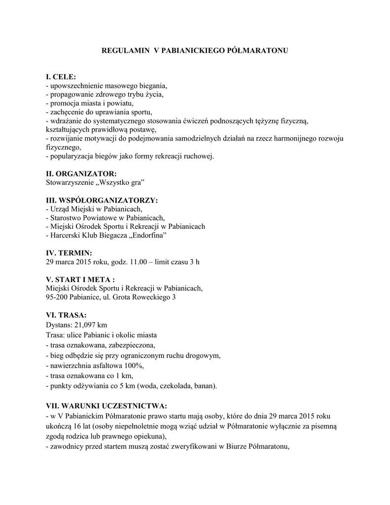 REGULAMIN V PABIANICKIEGO PÓŁMARATONU I. CELE