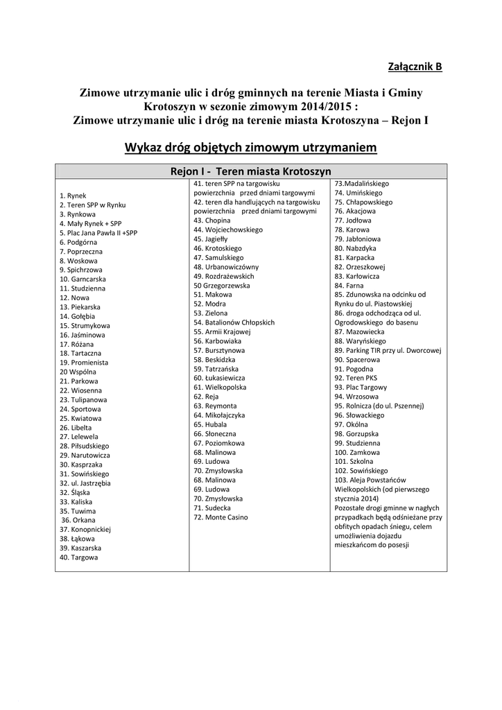 Załącznik B Zimowe utrzymanie ulic i dróg gminnych na terenie Miasta i Gminy Krotoszyn w sezonie zimowym 2014/2015 : Zimowe utrzymanie ulic i dróg na terenie miasta Krotoszyna – Rejon I Wykaz dróg objętych zimowym utrzymaniem Rejon I - Teren miasta Krotoszyn 1. Rynek 2. Teren SPP w Rynku 3. Rynkowa 4. Mały Rynek + SPP 5. Plac Jana Pawła II +SPP 6. Podgórna 7. Poprzeczna 8. Woskowa 9. Spichrzowa 10. Garncarska 11. Studzienna 12. Nowa 13. Piekarska 14. Gołębia 15. Strumykowa 16. Jaśminowa 17. Różana 18. Tartaczna 19. Promienista 20 Wspólna 21. Parkowa 22. Wiosenna 23. Tulipanowa 24. Sportowa 25. Kwiatowa 26. Libelta 27. Lelewela 28. Piłsudskiego 29. Narutowicza 30. Kasprzaka 31. Sowińskiego 32. ul. Jastrzębia 32. Śląska 33. Kaliska 35. Tuwima 36. Orkana 37. Konopnickiej 38. Łąkowa 39. Kaszarska 40. Targowa 41. teren SPP na targowisku powierzchnia przed dniami targowymi 42. teren dla handlujących na targowisku powierzchnia przed dniami targowymi 43. Chopina 44. Wojciechowskiego 45. Jagiełły 46. Krotoskiego 47. Samulskiego 48. Urbanowiczówny 49. Rozdrażewskich 50 Grzegorzewska 51. Makowa 52. Modra 53. Zielona 54. Batalionów Chłopskich 55. Armii Krajowej 56. Karbowiaka 57. Bursztynowa 58. Beskidzka 59. Tatrzańska 60. Łukasiewicza 61. Wielkopolska 62. Reja 63. Reymonta 64. Mikołajczyka 65. Hubala 66. Słoneczna 67. Poziomkowa 68. Malinowa 69. Ludowa 70. Zmysłowska 68. Malinowa 69. Ludowa 70. Zmysłowska 71. Sudecka 72. Monte Casino 73.Madalińskiego 74. Umińskiego 75. Chłapowskiego 76. Akacjowa 77. Jodłowa 78. Karowa 79. Jabłoniowa 80. Nabzdyka 81. Karpacka 82. Orzeszkowej 83. Karłowicza 84. Farna 85. Zdunowska na odcinku od Rynku do ul. Piastowskiej 86. droga odchodząca od ul. Ogrodowskiego do basenu 87. Mazowiecka 88. Waryńskiego 89. Parking TIR przy ul. Dworcowej 90. Spacerowa 91. Pogodna 92. Teren PKS 93. Plac Targowy 94. Wrzosowa 95. Rolnicza (do ul. Pszennej) 96. Słowackiego 97. Okólna 98. Gorzupska 99. Studzienna 100. Zamkowa 101. Szkolna 102. Sowińskiego 103. Aleja Powstańców Wielkopolskich (od pierwszego stycznia 2014) Pozostałe drogi gminne w nagłych przypadkach będą odśnieżane przy obfitych opadach śniegu, celem umożliwienia dojazdu mieszkańcom do posesji