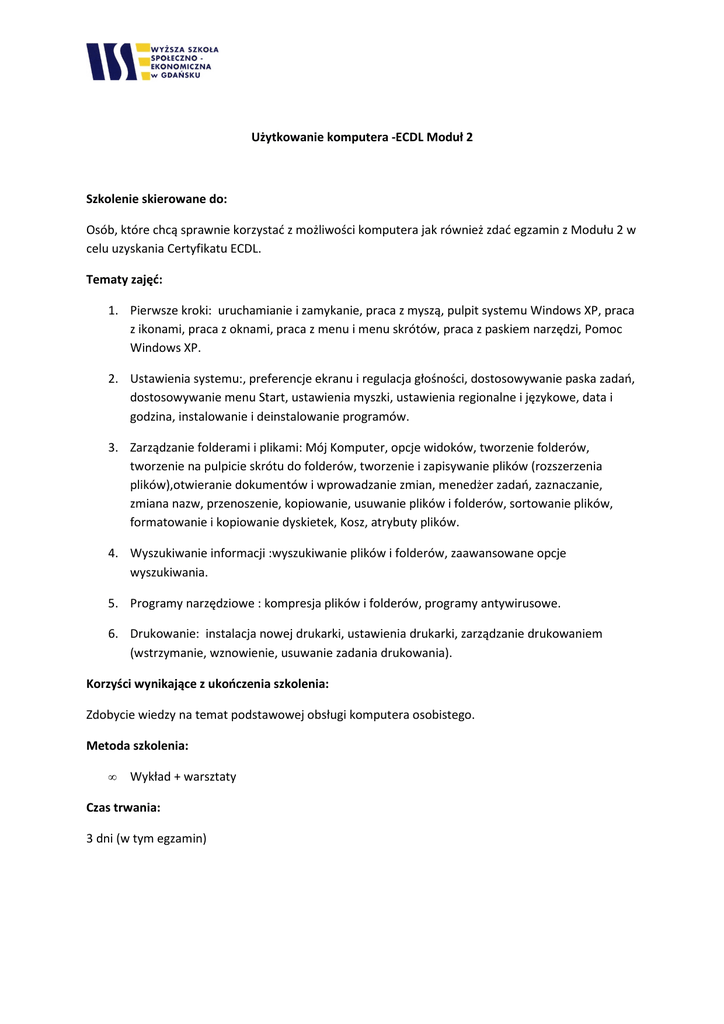 Użytkowanie komputera -ECDL Moduł 2 Szkolenie skierowane do: Osób, które chcą sprawnie korzystać z możliwości komputera jak również zdać egzamin z Modułu 2 w celu uzyskania Certyfikatu ECDL. Tematy zajęć: 1. Pierwsze kroki: uruchamianie i zamykanie, praca z myszą, pulpit systemu Windows XP, praca z ikonami, praca z oknami, praca z menu i menu skrótów, praca z paskiem narzędzi, Pomoc Windows XP. 2. Ustawienia systemu:, preferencje ekranu i regulacja głośności, dostosowywanie paska zadań, dostosowywanie menu Start, ustawienia myszki, ustawienia regionalne i językowe, data i godzina, instalowanie i deinstalowanie programów. 3. Zarządzanie folderami i plikami: Mój Komputer, opcje widoków, tworzenie folderów, tworzenie na pulpicie skrótu do folderów, tworzenie i zapisywanie plików (rozszerzenia plików),otwieranie dokumentów i wprowadzanie zmian, menedżer zadań, zaznaczanie, zmiana nazw, przenoszenie, kopiowanie, usuwanie plików i folderów, sortowanie plików, formatowanie i kopiowanie dyskietek, Kosz, atrybuty plików. 4. Wyszukiwanie informacji :wyszukiwanie plików i folderów, zaawansowane opcje wyszukiwania. 5. Programy narzędziowe : kompresja plików i folderów, programy antywirusowe. 6. Drukowanie: instalacja nowej drukarki, ustawienia drukarki, zarządzanie drukowaniem (wstrzymanie, wznowienie, usuwanie zadania drukowania). Korzyści wynikające z ukończenia szkolenia: Zdobycie wiedzy na temat podstawowej obsługi komputera osobistego. Metoda szkolenia: • Wykład + warsztaty Czas trwania: 3 dni (w tym egzamin)