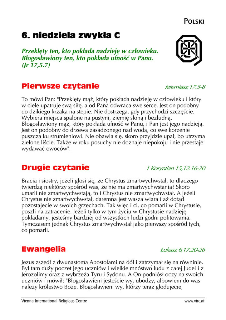 Polski Przeklęty ten, kto pokłada nadzieję w człowieku. Błogosławiony ten, kto pokłada ufność w Panu. (Jr 17,5.7) To mówi Pan: "Przeklęty mąż, który pokłada nadzieję w człowieku i który w ciele upatruje swą siłę, a od Pana odwraca swe serce. Jest on podobny do dzikiego krzaka na stepie. Nie dostrzega, gdy przychodzi szczęście. Wybiera miejsca spalone na pustyni, ziemię słoną i bezludną. Błogosławiony mąż, który pokłada ufność w Panu, i Pan jest jego nadzieją. Jest on podobny do drzewa zasadzonego nad wodą, co swe korzenie puszcza ku strumieniowi. Nie obawia się, skoro przyjdzie upał, bo utrzyma zielone liście. Także w roku posuchy nie doznaje niepokoju i nie przestaje wydawać owoców". Bracia i siostry, jeżeli głosi się, że Chrystus zmartwychwstał, to dlaczego twierdzą niektórzy spośród was, że nie ma zmartwychwstania? Skoro umarli nie zmartwychwstają, to i Chrystus nie zmartwychwstał. A jeżeli Chrystus nie zmartwychwstał, daremna jest wasza wiara i aż dotąd pozostajecie w swoich grzechach. Tak więc i ci, co pomarli w Chrystusie, poszli na zatracenie. Jeżeli tylko w tym życiu w Chrystusie nadzieję pokładamy, jesteśmy bardziej od wszystkich ludzi godni politowania. Tymczasem jednak Chrystus zmartwychwstał jako pierwszy spośród tych, co pomarli. Jezus zszedł z dwunastoma Apostołami na dół i zatrzymał się na równinie. Był tam duży poczet Jego uczniów i wielkie mnóstwo ludu z całej Judei i z Jerozolimy oraz z wybrzeża Tyru i Sydonu. A On podniósł oczy na swoich uczniów i mówił: "Błogosławieni jesteście wy, ubodzy, albowiem do was należy królestwo Boże. Błogosławieni wy, którzy teraz głodujecie, Vienna International Religious Centre www.virc.at albowiem będziecie nasyceni. Błogosławieni wy, którzy teraz płaczecie, albowiem śmiać się będziecie. Błogosławieni będziecie, gdy ludzie was znienawidzą i gdy was wyłączą spośród siebie, gdy zelżą was i z powodu Syna Człowieczego podadzą w pogardę wasze imię jako niecne: cieszcie się i radujcie w owym dniu, bo wielka jest wasza nagroda w niebie. Tak samo bowiem przodkowie ich czynili prorokom. Natomiast biada wam, bogaczom, bo odebraliście już pociechę waszą. Biada wam, którzy teraz jesteście syci, albowiem głód cierpieć będziecie. Biada wam, którzy się teraz śmiejecie, albowiem smucić się i płakać będziecie. Biada wam, gdy wszyscy ludzie chwalić was będą. Tak samo bowiem ojcowie ich czynili fałszywym prorokom". "Błogosławieni jesteście wy... ubodzy, głodni, prześladowani, bezsilni." Dzisiejsza Ewangelia jest niezwykle prowokująca. Błogosławieństwa, z którymi konfrontuje nas Jezus, stanowią – dzisiaj bardziej niż kiedykolwiek – absolutne przeciwieństwo tego, co proponuje dzisiejsze społeczeństwo jako zupełną szczęśliwość: bogactwa, władzy, sukcesu, uznania... Przy dokładniejszym przyglądaniu się tym wartościom i przy konfrontacji tychże z własnym życiem, powstaje, wcześniej lub później, w każdym człowieku pytanie o to, co nośne, trwałe, wykraczające poza ziemskie życie. Proste pytanie, zadawane sobie od czasu do czasu, pozwala na zrelatywizowanie naszego systemu wartości i prawdziwą ocenę przeszłości: gdy sobie wyobrażę, że doszedłem do kresu mojego życia, co chcę, aby z niego pozostało? O czym chcę z radością wspominać? Co wydaje się mi ważne, co chciałbym przekazać, jako dziedzictwo, następnym pokoleniom? Czy rzeczywiście zaśniedziałe bogactwo, posada w jakimś zarządzie lub władza jest tym, co skorzystałem ze spotkań z ludźmi? Czy też raczej nie uszczęśliwiało mnie to, co wyrastało z podjętego cierpienia, głębokich doświadczeń bycia przyjętym, wydarzeń, w których zdumiewała różnorodność stworzenia, chwil, w których sam mogłem być twórczy (= stwarzający)? "Błogosławieni jesteście..." – podarowana przez Jezusa korekta, którą możemy przykładać do naszego życia. "Błogosławieni jesteście..." zawiera w sobie również głębokie wyzwanie, które nie może być spłycane, wygładzane, neutralizowane. Bóg chce nie tylko naszego indywidualnego szczęścia, On chce szczęścia wszystkich ludzi. Nie chodzi Mu przy tym o trochę szczęścia, o trochę życia – Jemu chodzi o całą pełnię. Pełnia i doskonałość są ostatecznie łaską Boga, która jednak zaczyna się w naszym konkretnym życiu i do tego przy naszej pomocy. Bóg jest zdanym na to, że my, wedle naszych sił i możliwości, zaangażujemy się na rzecz godnego życia wszystkich ludzi. Stąd Kościół nie może nigdy solidaryzować się z tymi, którzy mają władzę, bogatymi, stanowiącymi na tej ziemi prawo! Jego miejsce jest zawsze po stronie ubogich i pozbawionych prawa, jakiekolwiek mieliby oni oblicze. Gdzie błogosławieństwa Jezusa są prawdziwie przyjmowane, z całą ich konsekwencją, tam lęk i bezsilność tracą swoją moc. Z Jezusem jako przewodnikiem możemy nieść Jego wyzwalającą nowinę spokojnie do wszystkich ubogich, nawet wówczas, gdy według ludzkich poglądów skazani będziemy na niepowodzenia. Jeśli Bóg jest po naszej stronie – cóż może się nam katastroficznego przydarzyć? Vienna International Religious Centre [email protected]