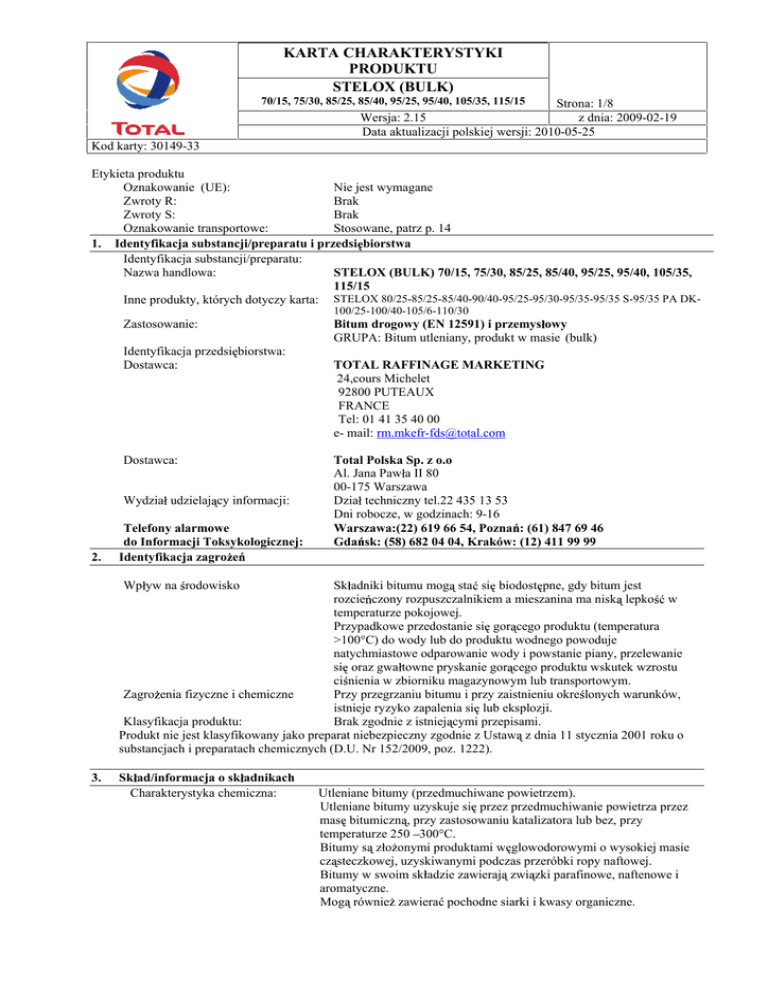 KARTA CHARAKTERYSTYKI PRODUKTU STELOX (BULK) 70/15, 75/30, 85/25, 85/40, 95/25, 95/40, 105/35, 115/15 Strona: 1/8 Wersja: 2.15 z dnia: 2009-02-19 Data aktualizacji polskiej wersji: 2010-05-25 Kod karty: 30149-33 Etykieta produktu Oznakowanie (UE): Nie jest wymagane Zwroty R: Brak Zwroty S: Brak Oznakowanie transportowe: Stosowane, patrz p. 14 1. Identyfikacja substancji/preparatu i przedsi biorstwa Identyfikacja substancji/preparatu: Nazwa handlowa: STELOX (BULK) 70/15, 75/30, 85/25, 85/40, 95/25, 95/40, 105/35, 115/15 Inne produkty, których dotyczy karta: STELOX 80/25-85/25-85/40-90/40-95/25-95/30-95/35-95/35 S-95/35 PA DK100/25-100/40-105/6-110/30 Zastosowanie: Identyfikacja przedsi biorstwa: Dostawca: Dostawca: Wydzia udzielaj cy informacji: 2. Telefony alarmowe do Informacji Toksykologicznej: Identyfikacja zagro e Bitum drogowy (EN 12591) i przemys owy GRUPA: Bitum utleniany, produkt w masie (bulk) TOTAL RAFFINAGE MARKETING 24,cours Michelet 92800 PUTEAUX FRANCE Tel: 01 41 35 40 00 e- mail: [email protected] Total Polska Sp. z o.o Al. Jana Paw a II 80 00-175 Warszawa Dzia techniczny tel.22 435 13 53 Dni robocze, w godzinach: 9-16 Warszawa:(22) 619 66 54, Pozna : (61) 847 69 46 Gda sk: (58) 682 04 04, Kraków: (12) 411 99 99 Wp yw na rodowisko Sk adniki bitumu mog sta si biodost pne, gdy bitum jest rozcie czony rozpuszczalnikiem a mieszanina ma nisk lepko w temperaturze pokojowej. Przypadkowe przedostanie si gor cego produktu (temperatura >100°C) do wody lub do produktu wodnego powoduje natychmiastowe odparowanie wody i powstanie piany, przelewanie si oraz gwa towne pryskanie gor cego produktu wskutek wzrostu ci nienia w zbiorniku magazynowym lub transportowym. Zagro enia fizyczne i chemiczne Przy przegrzaniu bitumu i przy zaistnieniu okre lonych warunków, istnieje ryzyko zapalenia si lub eksplozji. Klasyfikacja produktu: Brak zgodnie z istniej cymi przepisami. Produkt nie jest klasyfikowany jako preparat niebezpieczny zgodnie z Ustaw z dnia 11 stycznia 2001 roku o substancjach i preparatach chemicznych (D.U. Nr 152/2009, poz. 1222). 3. Sk ad/informacja o sk adnikach Charakterystyka chemiczna: Utleniane bitumy (przedmuchiwane powietrzem). Utleniane bitumy uzyskuje si przez przedmuchiwanie powietrza przez mas bitumiczn , przy zastosowaniu katalizatora lub bez, przy temperaturze 250 300°C. Bitumy s z o onymi produktami w glowodorowymi o wysokiej masie cz steczkowej, uzyskiwanymi podczas przeróbki ropy naftowej. Bitumy w swoim sk adzie zawieraj zwi zki parafinowe, naftenowe i aromatyczne. Mog równie zawiera pochodne siarki i kwasy organiczne. KARTA CHARAKTERYSTYKI PRODUKTU STELOX (BULK) 70/15, 75/30, 85/25, 85/40, 95/25, 95/40, 105/35, 115/15 Strona: 2/8 Wersja: 2.15 z dnia: 2009-02-19 Data aktualizacji polskiej wersji: 2010-05-25 Kod karty: 30149-33 Mog tak e zawiera policykliczne w glowodory aromatyczne w ilo ci kilku cz ci na milion (ppm). 64742-93-4 265-196-4 4. 5. Numer CAS: Numer EINECS (WE): Pierwsza pomoc PRZY WSZYSTKICH OPARZENIACH ORAZ PO WDYCHANIU PAR LUB DYMOW, WEZWA LEKARZA LUB POGOTOWIE RATUNKOWE I ZAPEWNI OCHRON DRU YNIE RATUNKOWEJ, patrz poni ej. DROGI NARA ENIA SI : WDYCHANIE W przypadku nara enia si na dzia anie wysokiego st enia par, dymów lub mg y, wynie poszkodowanego na wie e powietrze, okry i pozwoli odpocz . Je li s k opoty z oddychaniem, wezwa lekarza, zastosowa sztuczne oddychanie. Mo liwo podra nienia dróg oddechowych i b on luzowych. W wyj tkowych wypadkach istnieje ryzyko senno ci i/lub zatrucia siarkowodorem. SPO YCIE Zasi gn porady lekarza. KONTAKT ZE SKÓR W przypadku oparzenia: NATYCHMIAST OCH ODZI POLEWAJ C DU ILO CI WODY, CZEKAJ C NA PRZEWIEZIENIE DO SPECJALISTYCZNEGO O RODKA MEDYCZNEGO KONTYNUOWA POLEWANIE. Nie próbowa usuwa przyklejonej do skóry warstwy bitumu, zdj zabrudzone ubranie je li nie jest przyklejone do skóry. Podczas ch odzenia bitum mo e si kurczy i przez to blokowa kr enie krwi w r ce lub nodze, w takim przypadku nale y wyci cz blokuj cego produktu zachowuj c maksymaln ostro no . Nie próbowa usuwa zestalonego bitumu przyklejonego do skóry, mo na przy tym uszkodzi skór . Bitum zwykle z uszcza si automatycznie po kilku dniach. KONTAKT Z OCZAMI W przypadku kontaktu gor cego produktu z oczami OCH ODZI I DOK ADNIE P UKA DU ILO CI CH ODNEJ,CZYSTEJ, BIE CEJ WODY PRZEZ, CO NAJMNIEJ 10 MINUT, trzymaj c oko je li to mo liwe otwarte, szybko uda si do specjalistycznego o rodka medycznego. OCHRONA RATOWNIKÓW Podczas akcji w zamkni tych przestrzeniach musz by stosowane osobiste aparaty do oddychania. Post powanie w przypadku po aru TEMPERATURA ZAP ONU ODPOWIEDNIE RODKI GA NICZE NIEODPOWIEDNIE RODKI SPECYFICZNE ZAGRO ENIA: SPECJALNE WYPOSA ENIE OCHRONNE DLA STRA AKÓW: Patrz p.9. Ditlenek w gla, piana, proszek ga niczy, piasek i natrysk wodny. Nie u ywa strumieni wody. Niekompletne spalanie i piroliza prowadz do powstania gazów o ró nej toksyczno ci takich, jak CO, CO2 i sadzy. Produkty te przy wdychaniu mog by bardzo niebezpieczne. Wykipienie produktu ze zbiornika i gwa towne erupcje w obecno ci wody (spryskanie gor cego produktu). Problemy z oddychaniem lub md o ci mog by spowodowane przy nadmiernym nara eniu na gor ce bitumiczne dymy. W zamkni tych pomieszczeniach o du ym st eniu dymów i gazów nosi aparat izoluj cy drogi oddechowe. Stosowa odpowiednie ubranie ochronne, szczególnie r kawice. KARTA CHARAKTERYSTYKI PRODUKTU STELOX (BULK) 70/15, 75/30, 85/25, 85/40, 95/25, 95/40, 105/35, 115/15 Strona: 3/8 Wersja: 2.15 z dnia: 2009-02-19 Data aktualizacji polskiej wersji: 2010-05-25 Kod karty: 30149-33 6. Post powanie w przypadku niezamierzonego uwolnienia do rodowiska OCHRONA OSOBISTA: POST POWANIE PRZY ROZLANIU/PRZECIEKU -ODZYSK -UTYLIZACJA 7. Odpowiednio do ryzyka nara enia, nosi he m z os on twarzy i szyi, r kawice, ubranie ochronne i buty ochronne (nogawki spodni powinny by wypuszczone na buty). Ca e wyposa enie powinno by zrobione z nietopliwego odpornego na ogie materia u. Ograniczy rozlewanie si produktu tak, aby mo na by o go