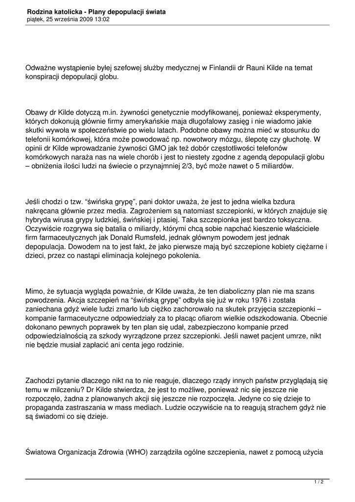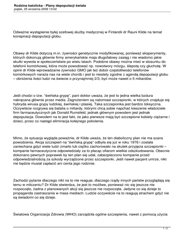 Rodzina katolicka - Plany depopulacji świata piątek, 25 września 2009 13:02 Odważne wystąpienie byłej szefowej służby medycznej w Finlandii dr Rauni Kilde na temat konspiracji depopulacji globu. Obawy dr Kilde dotyczą m.in. żywności genetycznie modyfikowanej, ponieważ eksperymenty, których dokonują głównie firmy amerykańskie maja długofalowy zasięg i nie wiadomo jakie skutki wywoła w społeczeństwie po wielu latach. Podobne obawy można mieć w stosunku do telefonii komórkowej, która może powodować np. nowotwory mózgu, ślepotę czy głuchotę. W opinii dr Kilde wprowadzanie żywności GMO jak też dobór częstotliwości telefonów komórkowych naraża nas na wiele chorób i jest to niestety zgodne z agendą depopulacji globu – obniżenia ilości ludzi na świecie o przynajmniej 2/3, być może nawet o 5 miliardów. Jeśli chodzi o tzw. “świńska grypę”, pani doktor uważa, że jest to jedna wielka bzdura nakręcana głównie przez media. Zagrożeniem są natomiast szczepionki, w których znajduje się hybryda wirusa grypy ludzkiej, świńskiej i ptasiej. Taka szczepionka jest bardzo toksyczna. Oczywiście rozgrywa się batalia o miliardy, którymi chcą sobie napchać kieszenie właściciele firm farmaceutycznych jak Donald Rumsfeld, jednak głównym powodem jest jednak depopulacja. Dowodem na to jest fakt, że jako pierwsze mają być szczepione kobiety ciężarne i dzieci, przez co nastąpi eliminacja kolejnego pokolenia. Mimo, że sytuacja wygląda poważnie, dr Kilde uważa, że ten diaboliczny plan nie ma szans powodzenia. Akcja szczepień na “świńską grypę” odbyła się już w roku 1976 i została zaniechana gdyż wiele ludzi zmarło lub ciężko zachorowało na skutek przyjęcia szczepionki – kompanie farmaceutyczne odpowiedziały za to płacąc ofiarom wielkie odszkodowania. Obecnie dokonano pewnych poprawek by ten plan się udał, zabezpieczono kompanie przed odpowiedzialnością za szkody wyrządzone przez szczepionki. Jeśli nawet pacjent umrze, nikt nie będzie musiał zapłacić ani centa jego rodzinie. Zachodzi pytanie dlaczego nikt na to nie reaguje, dlaczego rządy innych państw przyglądają się temu w milczeniu? Dr Kilde stwierdza, że jest to możliwe, ponieważ nic się jeszcze nie rozpoczęło, żadna z planowanych akcji się jeszcze nie rozpoczęła. Jedyne co się dzieje to propaganda zastraszania w mass mediach. Ludzie oczywiście na to reagują strachem gdyż nie są świadomi co się dzieje. Światowa Organizacja Zdrowia (WHO) zarządziła ogólne szczepienia, nawet z pomocą użycia 1/2 Rodzina katolicka - Plany depopulacji świata piątek, 25 września 2009 13:02 przymusu. W przeszłości nie było możliwe aby WHO miała uprawnienia do wydawania takich zarządzeń. Dopiero po podpisaniu porozumień międzynarodowych zaistniała taka możliwość – żeby WHO decydowała o tym co wszystkie kraje mają robić w przypadku pandemii. Na początku czerwca tego roku WHO ogłosiła najwyższy, 6 stopień pandemii, mimo że w żadnym kraju nie obserwujemy “pandemii” – dane dostarczane przez WHO są fałszywe. Taka decyzja miała na celu wykonanie masowych i przymusowych szczepień we wszystkich krajach. Dr Kilde jeszcze raz potwierdza swoją opinię, że realizacja tego planu się nie uda. Trzeba natomiast zwrócić uwagę na to, kto będzie miał korzyści – tzw. Big Pharma czyli kartele farmaceutyczne. Celem jest więc eliminacja jak największej ilości ludzi i jak największy zarobek. Kalkulacje mogą być jednak niewłaściwe, gdyż nawet podczas konferencji Bilderbergu w Grecjii w maju b.r. wystąpiła opozycja wobec szatańskich planów Kissingera. Finlandia już podjęła kroki w zapobieżeniu tragedii – pod koniec lipca uchwalono, że tzw. “świńska grypa” nie jest już na liście groźnych chorób, w związku z czym nie będzie można przymusić nikogo do przyjęcia szczepionki. Podobne kroki podjęto także w Norwegii. W szczególności szczepienia nie powinny dotyczyć dzieci i kobiet ciężarnych. Źródło: Grypa666's Blog Za: Puls pro-life 2/2