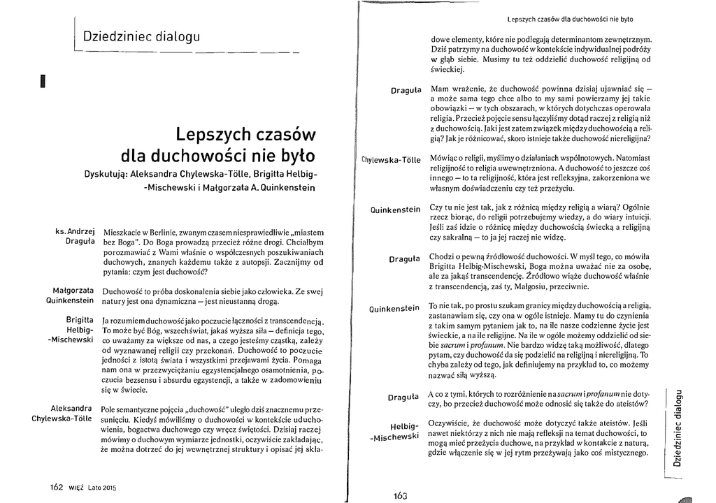 Lepszych czasów dla duchowości nie byto Dziedziniec dialogu d owe elementy, które nie podlegają determinantom zewnętrznym. Dziś patrzymy na duchowość w kontekście indywidualnej podróży w głąb siebie. Musimy tu też oddzielić duchowość religijną od świeckiej. l Drag u ta Mam wrażenie, że duchowość powinna dzisiaj ujawniać się a może sama tego chce albo to my sami powierzamy jej takie o bowiązki- w tych obszarach, w których dotychczas operowała religia. Przecież pojęcie sensu łączyliśmy dotąd raczej z religią niż Lepszych czasów dla duchowości nie było z duchowością. Jaki jest zatem związek między duchowością a reli gią? Jak je różnicować, skoro istnieje także duchowość niereligijna? Chy lewska-Ti:ille Dyskutują: Aleksandra Chylewska-Tolle, Brigitta Helbig innego-to ta religijność, która jest refleksyjna, zakorzeniona we -Mischewski i MaŁgorzata A. Quinkenstein własnym doświadczeniu czy też przeżyciu. Quinke nstein ks.Andrzej Dragula porozmawiać z Wami właśnie o współczesnych poszukiwaniach Quinkenstein Draguta Bri gitta Helbig -Mischewski Q uinkenstein Ale ksandra wienia, b ogactwa duchowego czy wręcz świętości. Dzisiaj raczej mówimy o duchowym wymiarze jednostki, oczywiście zakładając, że można dotrzeć do jej wewnętrznej struktury i opisać jej skła- 162 WIĘŹ Lato 2015 To nie tak, po prostu szukam granicy między duchowością a religią, zastanawiam się, czy ona w ogóle istnieje. Mamy tu do czynienia świeckie, a na ile religijne. Na ile w ogóle możemy oddzielić od sie co uważamy za większe od nas, a czego jesteśmy cząstką, zależy od wyznawanej religii czy przekonat1. Duchowość to poczucie Pole semantyczne pojęcia "duchowość" uległo dziś znacznemu prze sunięciu. Kiedyś mówiliśmy o duchowości w kontekście uducho osobę, z takim samym pytaniem jak to, na ile nasze c odzienne życie jest To może być Bóg, wszechświat, jakaś wyższa sila-definicja tego, bie sacrum i profanum. Nie bardzo widzę taką możliwość, dlatego pytam, czy duchowość da się podzielić na religijną i niereligijną. To jedności z istotą świata i wszystkimi przejawami życia. Pornaga nam ona w przezwyciężaniu egzystencjalnego osamotnienia, po Chylewska-Tolle _B oga można uważać nie za z transcendencją, zaś ty, Małgosiu, przeciwnie. Ja rozumiem duchowość jako poczucie łączności z transcende ncją . czucia bezsensu i absurdu egzystencji, a także w zadomowieniu się w świecie. Chodzi 0 pewną źródłowość duchowości. W myśl tego, co mówiła Brigitta Helbig-Mischewski, ale za jakąś transcendencję. Zródłowo wiąże duchowość właśnie Duchowość to próba doskonalenia siebie jako człowieka. Ze swej natury jest ona dynamiczna-jest nieustanną drogą. rzecz biorąc, d o religii potrzebujemy wiedzy, a do wiary intuicji. czy sakralną -to ja jej raczej nie widzę. pytania: czym jest duchowość? Małgorzata Czy tu nie jest tak, jak z różnicą między religią a wiarą'! Ogólnie Jeśli zaś idzie o różnicę między duchowością świecką a religijną Mieszkacie w Berlinie, zwanym czasem niesprawiedliwie "miastem bez Boga". Do Boga prowadzą przecież różne drogi. Chciałbym duchowych, znanych każdemu także z autopsji. Zacznijmy od Mówiąc o religii, myślimy o działaniach wspólnotowych. Natomiast religijność to religia uwewnętrzniona. A duchowość to jeszcze coś chyba zależy od tego, jak definiujemy na przykład to, c o możemy nazwać siłą wyższą. DraguŁa Helbig -Mischewski A co z tymi, których to rozróżnienie na sacrum i profanum nie doty czy, bo przecież duchowość może odnosić się także do ateistów? Oczywiście, że duchowość może dotyczyć także ateistów. Jeśli nawet niektórzy z nich nie mają refleksji na temat duchowości, to � mogą mieć przeżycia duchowe, na p �zykł�d w kont�kc e z naturą, . gdzie włączenie się w jej rytm przezywają Jako cos mtstycznego. :l C'l .3 .� "C u Q.J c N "O Q.J N CI DYSKUTUJĄ: A. CHYLEWSKA- TOLLE. B. HELBIG-MISCHEWSKII A. QUINKENSTEIN Chylewska-To Ile Lepszych czasów dla duchowości nie było Wydaje mi się, że granica pomiędzy duchowością a religijnością jest którzy uczestniczą w tym wielkim misterium sportowym. Nie słyszałam nigdy modlitw w intencji na przykład olimpijczyków płynna, być może punktem granicznym jest tu miejsce, w którym doświadczenie-a na nim przecież zasadza się duchowość- staje się pewną instancją, mającą wyższy autorytet niż autorytet wierzeń czy instytucji. To doświadczenie niejako góruje nad tym, co jest mi dane z zewnątrz. Dragula kiem między człowiekiem a transcendencją. A dziś? Ludzie chcą " wiary, ale natchnienia nie szukają już w jednym Kościele. Coraz wyraźniej rozgraniczają duchowość, religijność i kościelność" - Helbig DraguŁa stricte religijne, nadajemy religijne znaczenie. Zgodziłbym się kształtuje człowieka wewnętrznie. Chy lewska-To Ile Piłka nożna to forma religii zastępczej, która wielu może rozwijać duchowo i ubogacać wewnętrznie. Na przykład poprzez to, że tworzy poc�u�ie wspól�?ty zaró":no między kibicami, jak i z narodem. Dla mme Jednaktez Jest wątphwe, mówił Wiktor Osiatyński podczas warszawskiego "Dziedzińca dialogu". Helbig - Mische wski To słuszne rozróżnienie, ponieważ religia to raczej system wie rzeń i przekonań. Religia opiera się na jakiejś opowieści, narracji Chylewska-To Ile A może to jest przejaw świeckiej duchowości? Czy też wyraz przeno o strukturze mitycznej: tej o stworzeniu świata czy tych nadają cych sens naszemu życiu. Religia wpisuje je w jakiś większy plan, np. przezwyciężenia śmierci, zbawienia. Nie wiem, czy dziś te in stytucje są niezbędne. Tym bardziej że duchowość nie zawsze była Quinkenstein Być może. Ja jednak na chwilę chciałabym wrócić do kwestii instytu cji religijnej. Wydaje mi się, że �iększość z nas 