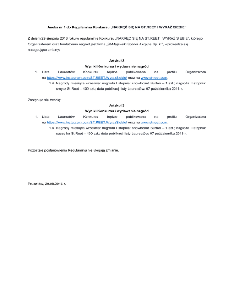 Aneks nr 1 do Regulaminu Konkursu „NAKRĘĆ SIĘ NA ST.REET I WYRAŹ SIEBIE” Z dniem 29 sierpnia 2016 roku w regulaminie Konkursu „NAKRĘĆ SIĘ NA ST.REET I WYRAŹ SIEBIE”, którego Organizatorem oraz fundatorem nagród jest firma „St-Majewski Spółka Akcyjna Sp. k.”, wprowadza się następujące zmiany: Artykuł 3 Wyniki Konkursu i wydawanie nagród 1. Lista Laureatów Konkursu będzie publikowana na profilu Organizatora na https://www.instagram.com/ST.REET.WyrazSiebie/ oraz na www.st-reet.com. 1.4 Nagrody miesiąca września: nagroda I stopnia: snowboard Burton – 1 szt.; nagroda II stopnia: smycz St.Reet – 400 szt.; data publikacji listy Laureatów: 07 października 2016 r. Zastępuje się treścią: Artykuł 3 Wyniki Konkursu i wydawanie nagród 1. Lista Laureatów Konkursu będzie publikowana na profilu Organizatora na https://www.instagram.com/ST.REET.WyrazSiebie/ oraz na www.st-reet.com. 1.4 Nagrody miesiąca września: nagroda I stopnia: snowboard Burton – 1 szt.; nagroda II stopnia: saszetka St.Reet – 400 szt.; data publikacji listy Laureatów: 07 października 2016 r. Pozostałe postanowienia Regulaminu nie ulegają zmianie. Pruszków, 29.08.2016 r.
