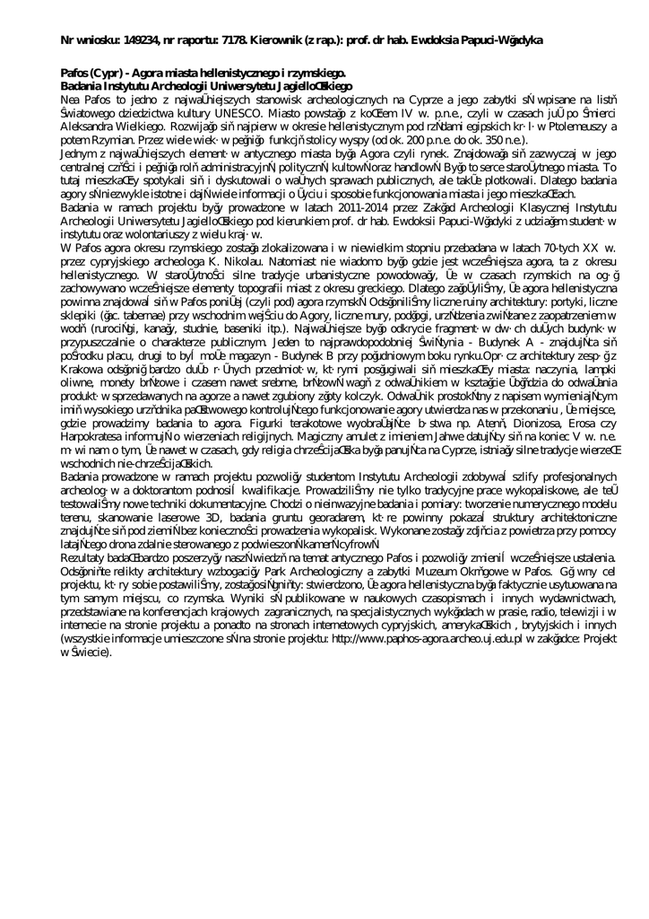 Nr wniosku: 149234, nr raportu: 7178. Kierownik (z rap.): prof. dr hab. Ewdoksia Papuci-Władyka Pafos (Cypr) - Agora miasta hellenistycznego i rzymskiego. Badania Instytutu Archeologii Uniwersytetu Jagiellońskiego Nea Pafos to jedno z najważniejszych stanowisk archeologicznych na Cyprze a jego zabytki są wpisane na listę światowego dziedzictwa kultury UNESCO. Miasto powstało z końcem IV w. p.n.e., czyli w czasach już po śmierci Aleksandra Wielkiego. Rozwijało się najpierw w okresie hellenistycznym pod rządami egipskich królów Ptolemeuszy a potem Rzymian. Przez wiele wieków pełniło funkcję stolicy wyspy (od ok. 200 p.n.e. do ok. 350 n.e.). Jednym z najważniejszych elementów antycznego miasta była Agora czyli rynek. Znajdowała się zazwyczaj w jego centralnej części i pełniła rolę administracyjną, polityczną, kultową oraz handlową. Było to serce starożytnego miasta. To tutaj mieszkańcy spotykali się i dyskutowali o ważnych sprawach publicznych, ale także plotkowali. Dlatego badania agory są niezwykle istotne i dają wiele informacji o życiu i sposobie funkcjonowania miasta i jego mieszkańcach. Badania w ramach projektu były prowadzone w latach 2011-2014 przez Zakład Archeologii Klasycznej Instytutu Archeologii Uniwersytetu Jagiellońskiego pod kierunkiem prof. dr hab. Ewdoksii Papuci-Władyki z udziałem studentów instytutu oraz wolontariuszy z wielu krajów. W Pafos agora okresu rzymskiego została zlokalizowana i w niewielkim stopniu przebadana w latach 70-tych XX w. przez cypryjskiego archeologa K. Nikolau. Natomiast nie wiadomo było gdzie jest wcześniejsza agora, ta z okresu hellenistycznego. W starożytności silne tradycje urbanistyczne powodowały, że w czasach rzymskich na ogół zachowywano wcześniejsze elementy topografii miast z okresu greckiego. Dlatego założyliśmy, że agora hellenistyczna powinna znajdować się w Pafos poniżej (czyli pod) agora rzymską. Odsłoniliśmy liczne ruiny architektury: portyki, liczne sklepiki (łac. tabernae) przy wschodnim wejściu do Agory, liczne mury, podłogi, urządzenia związane z zaopatrzeniem w wodę (rurociągi, kanały, studnie, baseniki itp.). Najważniejsze było odkrycie fragmentów dwóch dużych budynków przypuszczalnie o charakterze publicznym. Jeden to najprawdopodobniej świątynia - Budynek A - znajdująca się pośrodku placu, drugi to być może magazyn - Budynek B przy południowym boku rynku.Oprócz architektury zespół z Krakowa odsłonił bardzo dużo różnych przedmiotów, którymi posługiwali się mieszkańcy miasta: naczynia, lampki oliwne, monety brązowe i czasem nawet srebrne, brązową wagę z odważnikiem w kształcie żołędzia do odważania produktów sprzedawanych na agorze a nawet zgubiony złoty kolczyk. Odważnik prostokątny z napisem wymieniającym imię wysokiego urzędnika państwowego kontrolującego funkcjonowanie agory utwierdza nas w przekonaniu , że miejsce, gdzie prowadzimy badania to agora. Figurki terakotowe wyobrażające bóstwa np. Atenę, Dionizosa, Erosa czy Harpokratesa informują o wierzeniach religijnych. Magiczny amulet z imieniem Jahwe datujący się na koniec V w. n.e. mówi nam o tym, że nawet w czasach, gdy religia chrześcijańska była panująca na Cyprze, istniały silne tradycje wierzeń wschodnich nie-chrześcijańskich. Badania prowadzone w ramach projektu pozwoliły studentom Instytutu Archeologii zdobywać szlify profesjonalnych archeologów a doktorantom podnosić kwalifikacje. Prowadziliśmy nie tylko tradycyjne prace wykopaliskowe, ale też testowaliśmy nowe techniki dokumentacyjne. Chodzi o nieinwazyjne badania i pomiary: tworzenie numerycznego modelu terenu, skanowanie laserowe 3D, badania gruntu georadarem, które powinny pokazać struktury architektoniczne znajdujące się pod ziemią bez konieczności prowadzenia wykopalisk. Wykonane zostały zdjęcia z powietrza przy pomocy latającego drona zdalnie sterowanego z podwieszoną kamerą cyfrową. Rezultaty badań bardzo poszerzyły naszą wiedzę na temat antycznego Pafos i pozwoliły zmienić wcześniejsze ustalenia. Odsłonięte relikty architektury wzbogaciły Park Archeologiczny a zabytki Muzeum Okręgowe w Pafos. Główny cel projektu, który sobie postawiliśmy, został osiągnięty: stwierdzono, że agora hellenistyczna była faktycznie usytuowana na tym samym miejscu, co rzymska. Wyniki są publikowane w naukowych czasopismach i innych wydawnictwach, przedstawiane na konferencjach krajowych zagranicznych, na specjalistycznych wykładach w prasie, radio, telewizji i w internecie na stronie projektu a ponadto na stronach internetowych cypryjskich, amerykańskich , brytyjskich i innych (wszystkie informacje umieszczone są na stronie projektu: http://www.paphos-agora.archeo.uj.edu.pl w zakładce: Projekt w świecie).
