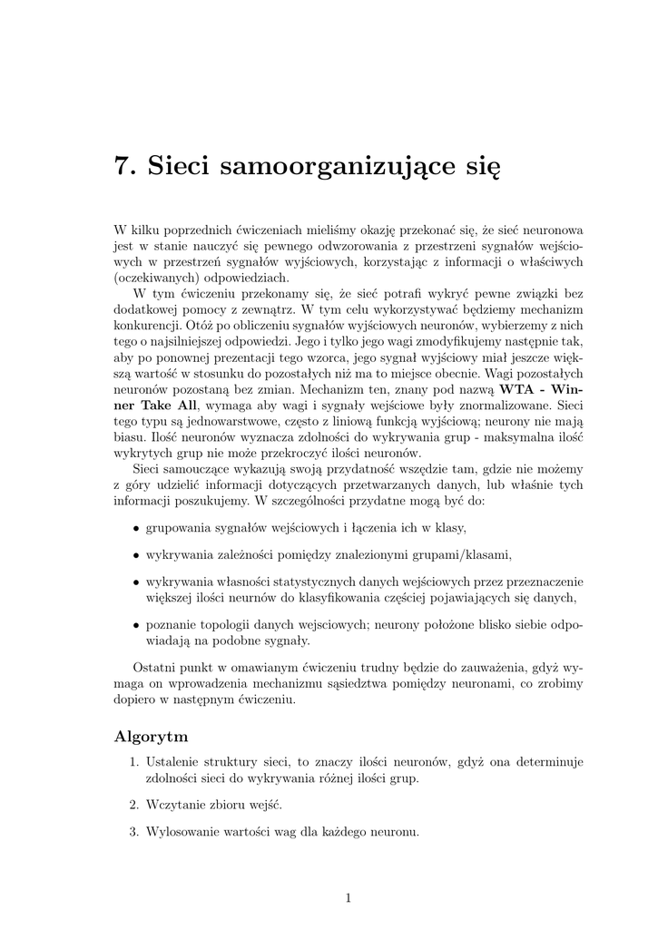 7. Sieci samoorganizujące się W kilku poprzednich ćwiczeniach mieliśmy okazję przekonać się, że sieć neuronowa jest w stanie nauczyć się pewnego odwzorowania z przestrzeni sygnałów wejściowych w przestrzeń sygnałów wyjściowych, korzystając z informacji o właściwych (oczekiwanych) odpowiedziach. W tym ćwiczeniu przekonamy się, że sieć potrafi wykryć pewne związki bez dodatkowej pomocy z zewnątrz. W tym celu wykorzystywać będziemy mechanizm konkurencji. Otóż po obliczeniu sygnałów wyjściowych neuronów, wybierzemy z nich tego o najsilniejszej odpowiedzi. Jego i tylko jego wagi zmodyfikujemy następnie tak, aby po ponownej prezentacji tego wzorca, jego sygnał wyjściowy miał jeszcze większą wartość w stosunku do pozostałych niż ma to miejsce obecnie. Wagi pozostałych neuronów pozostaną bez zmian. Mechanizm ten, znany pod nazwą WTA - Winner Take All, wymaga aby wagi i sygnały wejściowe były znormalizowane. Sieci tego typu są jednowarstwowe, często z liniową funkcją wyjściową; neurony nie mają biasu. Ilość neuronów wyznacza zdolności do wykrywania grup - maksymalna ilość wykrytych grup nie może przekroczyć ilości neuronów. Sieci samouczące wykazują swoją przydatność wszędzie tam, gdzie nie możemy z góry udzielić informacji dotyczących przetwarzanych danych, lub właśnie tych informacji poszukujemy. W szczególności przydatne mogą być do: • grupowania sygnałów wejściowych i łączenia ich w klasy, • wykrywania zależności pomiędzy znalezionymi grupami/klasami, • wykrywania własności statystycznych danych wejściowych przez przeznaczenie większej ilości neurnów do klasyfikowania częściej pojawiających się danych, • poznanie topologii danych wejsciowych; neurony położone blisko siebie odpowiadają na podobne sygnały. Ostatni punkt w omawianym ćwiczeniu trudny będzie do zauważenia, gdyż wymaga on wprowadzenia mechanizmu sąsiedztwa pomiędzy neuronami, co zrobimy dopiero w następnym ćwiczeniu. Algorytm 1. Ustalenie struktury sieci, to znaczy ilości neuronów, gdyż ona determinuje zdolności sieci do wykrywania różnej ilości grup. 2. Wczytanie zbioru wejść. 3. Wylosowanie wartości wag dla każdego neuronu. 1 4. Normalizacja wag i wczytanych sygnałów wejściowych według wzoru: xi xi = qP N i=1 x2i gdzie N jest ilością wejść. 5. Powtarzaj założoną ilość kroków: (a) Wybierz wzorzec p. (b) Oblicz sygnały wyjściowe dla wzorca p. (c) Znajdź neuron o największej wartości sygnału na wyjściu. Oznacz go jako winner. (d) Zmień wagi winner’a tak aby były bliższe wzorcowi p według wzoru: wi = wi + η[xi − wi ] gdzie i = 1...N , N jest ilością wejść, η jest współczynnikiem uczenia. Współczynnik uczenia należy zmniejszać. Na początku może buć większy, na przykład 0.2, a następnie powinien dążyć do zera. 6. Na zakończenie sprawdzamy do jakich grup należą rozważane punkty. Każdemu punktowi przypisujemy numer neuronu, który zareagował najsilniej. Zadanie Zadanie będzie polegało na klasyfikowaniu punktów płaszczyzny. Będziemy to robić podobnie jak w ćwiczeniu 2, tylko wykorzystując sieć samoorganizującą się. Przyjmijmy kwadrat [−2, 2] × [−2, 2]. Wektor współrzędnych każdego punktu tego kwadratu będzie wejściem do sieci. Ponieważ rozważamy punkty płaszczyzny sieć bedzie miała dwa wejścia i jedną wartwę M neuronów z liniową funkcją aktywacji. Zakładając ustaloną liczbę kroków będziemy podawać losowo wejścia realizując przedstawiony algorytm. Każdemu neuronowi przypiszemy określoną barwę. Podany piksel - przeskalowany na odpowiadającą mu wartość z zakresu [−2, 2] × [−2, 2] będziemy zaznaczać kolorem przypisanym neuronowi winner’owi. Jeżeli otrzymamy kilka neuronów, dla których wartość wyjściowa jest ta sama, największa wybieramy jeden z nich w sposób losowy i uważamy go jako winner’a. 2