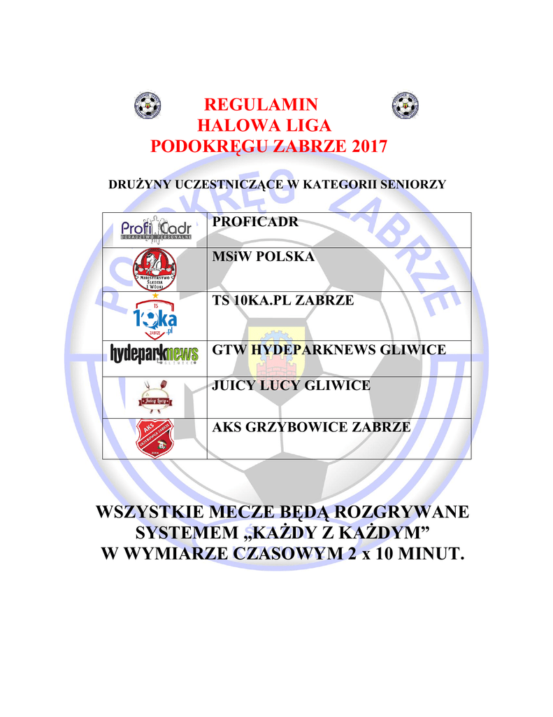 REGULAMIN HALOWA LIGA PODOKRĘGU ZABRZE 2017 DRUŻYNY UCZESTNICZĄCE W KATEGORII SENIORZY PROFICADR MSiW POLSKA TS 10KA.PL ZABRZE GTW HYDEPARKNEWS GLIWICE JUICY LUCY GLIWICE AKS GRZYBOWICE ZABRZE WSZYSTKIE MECZE BĘDĄ ROZGRYWANE SYSTEMEM „KAŻDY Z KAŻDYM” W WYMIARZE CZASOWYM 2 x 10 MINUT. REGULAMIN HALOWA LIGA PODOKRĘGU ZABRZE 2017 1. Cel zawodów popularyzacja zdrowego trybu życia oraz gry w piłkę nożną na hali - futsal wyłonienie najlepszych drużyn seniorskich w „HLPZ Śl. ZPN Podokręg Zabrze 2017” 2. Terminy zawodów i miejsce Halowa Liga w dniach: - 04.02.2017 r. w godzinach 15:00-21:00 hala sportowa przy ulicy Sikorskiego 130 w Gliwicach-Sośnica Osoba kontaktowa Barbara Knebel – Tel. 501-857-917 3. Uczestnictwo a/ zasady udziału w rozgrywkach turniej organizowany jest dla drużyn piłkarskich występujących w różnych klasach rozgrywkowych drużyny mogą również składać się z dowolnie dobranych zawodników którzy wystąpią pod jedną wspólną nazwą b/ warunkiem uczestnictwa jest zgłoszenie zespołu maksymalnie 12 osobowego plus trener-opiekun (lista zgłoszeniowa drużyny jest taka sama podczas rozgrywek grupowych jak i podczas Wielkiego Finału) dokonanie opłaty startowej bezzwrotnej posiadanie przez cały czas trwania dowodu tożsamości posiadanie przez zawodników aktualnych badań lekarskich (odpowiedzialność spada na opiekuna drużyny) c/ przystąpienie drużyny do rozgrywek jest jednoznaczne z akceptacją niniejszego regulaminu REGULAMIN HALOWA LIGA PODOKRĘGU ZABRZE 2017 4. Sposób punktowania zwycięstwo – 3 pkt remis – 1 pkt porażka – 0 pkt 5. Dyskwalifikacje podejmuje organizator oraz sędzia prowadzący zawody na pisemny wniosek opiekuna drużyny biorącej udział w turnieju protesty przyjmowane są przez organizatora tylko podczas trwania turnieju w danym dniu przy składaniu wniosku wnioskodawca jest zobowiązany podać dane dotyczące zawodnika, co do którego wnosi się protest tj. imię , nazwisko, drużynę w której występował po zakończeniu turnieju wyniki nie podlegają weryfikacji 6. Nagrody i wyróżnienia Drużynowe – trzy najlepsze drużyny w turniej Nagrody indywidualne (najlepszy strzelec, najlepszy bramkarz i najlepszy zawodnik) 7. Postanowienia końcowe obowiązuje obuwie sportowe parking znajduje się przy hali i jest niestrzeżony wszyscy uczestnicy ubezpieczają się od następstw nieszczęśliwych wypadków we własnym zakresie; na żądanie organizatora należy je przedstawić pod rygorem nie dopuszczenia do gry organizator nie odpowiada za rzeczy osobiste i inne pozostawione na obiekcie sportowym rozstrzyganie spraw spornych oraz interpretacja niniejszego regulaminu należy do organizatora Skrócone przepisy gry 1. Zasady ogólne czas gry wynosi dwa razy po 10min., z minutową przerwą , czas odmierza zegar boiskowy lub osoba prowadząca zawody, który kończy grę syreną bądź sędzia gwizdkiem mierzący czas zatrzymuje zegar w trakcje meczu na wyraźne wskazanie przez sędziego głównego gra odbywa się na boisku o wymiarach 20 x 40 m bramka ma wymiary 3 x 2 m pole bramkowe wyznacza linia 6 m od piłki ręcznej REGULAMIN HALOWA LIGA PODOKRĘGU ZABRZE 2017 2. Zawodnicy: drużyna liczy z rezerwowymi max 12 zawodników w turnieju (w przypadku gdy klub-stowarzyszenie zgłosi więcej niż jedną drużynę rozgrywkach danej kategorii wiekowej lub w całych rozgrywkach HLPZ zawodnicy mogą być wpisani tylko do jednej drużyny) w grze bezpośrednio bierze udział 5 zawodników w tym bramkarz, ilość zmian w trakcie meczu dowolna, zmiany tzw. hokejowe w wyznaczonej od strony trybun od strony własnej ławki rezerwowych a. Rzuty: bramka jest uznana gdy piłka całym obwodem przejdzie za linię bramkową, rzut karny wykonuje się z linii 7 m., auty boczne wykonuje się nogą z linii boiska, aut bramkowy bramkarz wybija nogą lub ręką w obrębie całego boiska, za dotknięcie piłką konstrukcji dachu przyznaje się rzut autowy z boku bramkę można zdobyć bezpośrednio z rzutu wolnego bezpośredniego, rozpoczęcia gry, rzutu rożnego lub dowolnego strzału samobójczego, nie uznaje się bramki zdobytej bezpośrednio z autu bocznego i bramkowego oraz rzutu pośredniego sygnalizowanego przez sędziego przez podniesienie ręki, na wykonanie wszystkich tzw. stałych fragmentów gry drużyna ma 4 sekundy przy prawidłowym ustawieniu rywali. Po przekroczeniu czasu piłkę przejmuje drużyna przeciwna, odległość obrońcy od piłki podczas wykonywania rzutów i autów wynosi minimum 3 m (kara ostrzeżenia, a następnie żółta kartka) b. Gra niedozwolona: jak w przepisach Futsalu PZPN c. Kary: za niesportowe zachowanie lub przewinienie sędzia każe zawodników dwu minutową karą przy ukaraniu drużyny karą 2 minut, po stracie bramki w tym czasie przez tą drużynę, zawodnik wykluczony wraca do gry, wyjątek - nie liczy się jako bramka zdobyta sytuacji gdy faul ukarany jest rzutem karnym, dopiero następna bramka upoważnia do powrotu na boisko za zachowania brutalne i obraźliwe następuje dyskwalifikacja zawodnika i po upływie 2 minut w miejsce ukaranego może wejść rezerwowy zawodnik (nie po stracie bramki). ukarany zawodnik dyskwalifikacją nie ma prawa brać udziału w meczach już do końca danego turnieju, oraz zasiadać na ławce rezerwowych. REGULAMIN HALOWA LIGA PODOKRĘGU ZABRZE 2017 d. Rozstrzygnięcia końcowe: przy rozgrywkach grupowych mecz może kończyć się remisem i drużyny otrzymują po 1 punkcie, przy systemie pucharowym przy remisie wykonuje się 3 rzuty karne a następnie po 1 strzale do wyłonienia zwycięzcy, przy wygranym meczu drużyna otrzymuje 3 pkt., a przy przegranym 0 pkt., - przy walkowerze przyznaje się wynik 3:0 dla drużyny, która stawiła się na mecz, w rozgrywkach grupowych przy równej ilości punktów zdobytej przez dwie lub więcej drużyn bierze się pod uwagę: a. b. c. bezpośredni pojedynek, różnice bramek ilość bramek zdobytych Przy ilości dr