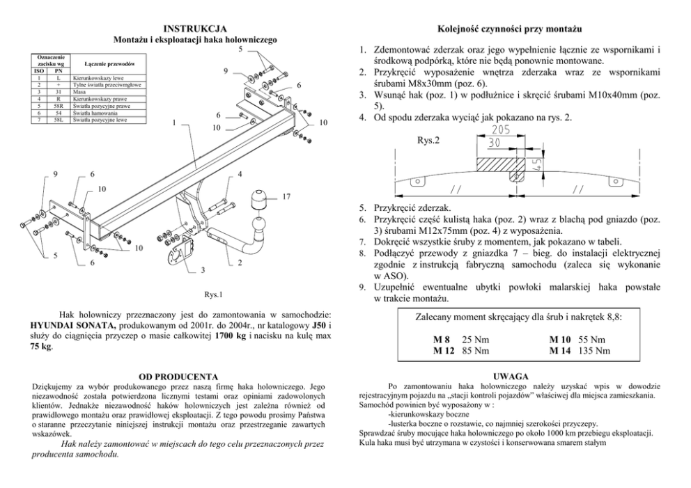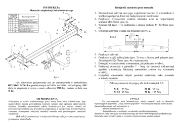INSTRUKCJA Kolejność czynności przy montaŜu MontaŜu i eksploatacji haka holowniczego 5 Oznaczenie zacisku wg ISO PN 1 L 2 + 3 31 4 R 5 58R 6 54 7 58L Łączenie przewodów 9 Kierunkowskazy lewe Tylne światła przeciwmgłowe Masa Kierunkowskazy prawe Światła pozycyjne prawe Światła hamowania Światła pozycyjne lewe 6 6 1 10 10 1. Zdemontować zderzak oraz jego wypełnienie łącznie ze wspornikami i środkową podpórką, które nie będą ponownie montowane. 2. Przykręcić wyposaŜenie wnętrza zderzaka wraz ze wspornikami śrubami M8x30mm (poz. 6). 3. Wsunąć hak (poz. 1) w podłuŜnice i skręcić śrubami M10x40mm (poz. 5). 4. Od spodu zderzaka wyciąć jak pokazano na rys. 2. Rys.2 9 6 4 10 17 10 5 6 2 3 Rys.1 Hak holowniczy przeznaczony jest do zamontowania w samochodzie: HYUNDAI SONATA, produkowanym od 2001r. do 2004r., nr katalogowy J50 i słuŜy do ciągnięcia przyczep o masie całkowitej 1700 kg i nacisku na kulę max 75 kg. 5. Przykręcić zderzak. 6. Przykręcić część kulistą haka (poz. 2) wraz z blachą pod gniazdo (poz. 3) śrubami M12x75mm (poz. 4) z wyposaŜenia. 7. Dokręcić wszystkie śruby z momentem, jak pokazano w tabeli. 8. Podłączyć przewody z gniazdka 7 – bieg. do instalacji elektrycznej zgodnie z instrukcją fabryczną samochodu (zaleca się wykonanie w ASO). 9. Uzupełnić ewentualne ubytki powłoki malarskiej haka powstałe w trakcie montaŜu. Zalecany moment skręcający dla śrub i nakrętek 8,8: M 8 25 Nm M 12 85 Nm M 10 55 Nm M 14 135 Nm OD PRODUCENTA UWAGA Dziękujemy za wybór produkowanego przez naszą firmę haka holowniczego. Jego niezawodność została potwierdzona licznymi testami oraz opiniami zadowolonych klientów. JednakŜe niezawodność haków holowniczych jest zaleŜna równieŜ od prawidłowego montaŜu oraz prawidłowej eksploatacji. Z tego powodu prosimy Państwa o staranne przeczytanie niniejszej instrukcji montaŜu oraz przestrzeganie zawartych wskazówek. Po zamontowaniu haka holowniczego naleŜy uzyskać wpis w dowodzie rejestracyjnym pojazdu na „stacji kontroli pojazdów” właściwej dla miejsca zamieszkania. Samochód powinien być wyposaŜony w : -kierunkowskazy boczne -lusterka boczne o rozstawie, co najmniej szerokości przyczepy. Sprawdzać śruby mocujące haka holowniczego po około 1000 km przebiegu eksploatacji. Kula haka musi być utrzymana w czystości i konserwowana smarem stałym Hak naleŜy zamontować w miejscach do tego celu przeznaczonych przez producenta samochodu. PPUH AUTO-HAK S. J. WyposaŜenie haka: Produkcja Haków Holowniczych Henryk & Zbigniew Nejman 76-200 SŁUPSK ul. Słoneczna 16K tel/fax (059) 8-414-414; 8-414-413 E-mail: [email protected] www.autohak.com.pl Hak holowniczy bez wyposaŜenia elektrycznego Klasa: A50-X Nr kat. J50 Przeznaczony do zamontowania w samochodzie: Producent: HYUNDAI Model: SONATA produkowanego od 2001r. do 2004r. Dane techniczne: Wartość siły D : 9,07 kN maksymalna masa przyczepy: 1700 kg maksymalny nacisk na kulę: 75 kg Numer homologacji zgodnie z wytycznymi regulaminu EKG/ONZ 55.01: E20-55R-01 1770 KARTA GWARANCYJNA Producent udziela gwarancji niniejszą kartą gwarancyjną na okres 24 miesięcy licząc od dnia zakupu haka holowniczego do samochodu: HYUNDAI SONATA produkowanego od 2001r. do 2004r. Data produkcji .............................. Data zakupu...................................... Zakres gwarancji obejmuje wyłącznie wady jakościowe wynikające z winy producenta. Gwarancja nie obejmuje natomiast uszkodzeń zawinionych przez nabywcę, wynikających z niewłaściwego montaŜu, uŜytkowania lub konserwacji, uszkodzeń mechanicznych, normalnego zuŜycia podczas eksploatacji itp. Gwarancja udzielona na zakupiony towar nie wyłącza, nie ogranicza ani nie zawiesza uprawnień kupującego wynikających z niezgodności towaru z umową. Reklamacje naleŜy zgłaszać w punkcie sprzedaŜy, składając jednocześnie kartę gwarancyjną. Usunięcie "wady" następuje po stwierdzeniu przez punkt sprzedaŜy wspólnie z producentem słuszności złoŜonej reklamacji. Reklamacja powinna być załatwiona w ciągu czternastu dni od dnia uznania reklamacji. Karta gwarancyjna jest niewaŜna jeŜeli nie jest wypełniona i podpisana. Data zgłoszenia reklamacji: ................................................................... INFORMACJA WSTĘPNA Hak holowniczy jest skonstruowany zgodnie z zasadami bezpieczeństwa ruchu drogowego. Hak holowniczy jest elementem wpływającym na bezpieczeństwo jazdy i moŜe zostać zainstalowany wyłącznie przez personel wyspecjalizowany. Niedopuszczalne jest dokonywanie jakichkolwiek zmian w konstrukcji haka. Powoduje to wygaśniecie dopuszczenia do stosowania. W przypadku obecności masy izolacyjnej lub osłony podwozia w miejscu przylegania haka, naleŜy ją usunąć. Nieosłonięte miejsca karoserii oraz wywiercone otwory naleŜy pomalować farbą antykorozyjną. Informacjami wiąŜącymi odnośnie wartości obciąŜeń są dane podawane przez producenta samochodu, względnie wartości maksymalnej masy przyczepy oraz maksymalnego nacisku na kulę, przy czym wartości parametrów haka holowniczego nie mogą być przekroczone. Wzór do obliczania wartości siły D: Maks. masa przyczepy [kg] x Masa całkowita samochodu [kg] 9,81 = X + 1000 Maks. masa przyczepy [kg] + Masa całkowita samochodu [kg] + D [kN]