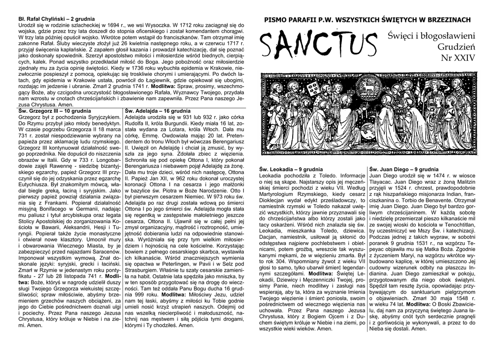 Bł. Rafał Chyliński – 2 grudnia Urodził się w rodzinie szlacheckiej w 1694 r., we wsi Wysoczka. W 1712 roku zaciągnął się do wojska, gdzie przez trzy lata doszedł do stopnia oficerskiego i został komendantem chorągwi. W trzy lata później opuścił wojsko. Wkrótce potem wstąpił do franciszkanów. Tam otrzymał imię zakonne Rafał. Śluby wieczyste złożył już 26 kwietnia następnego roku, a w czerwcu 1717 r. przyjął święcenia kapłańskie. Z zapałem głosił kazania i prowadził katechizację, dał się poznać jako doskonały spowiednik. Szerzył apostolstwo miłości i miłosierdzie wśród biednych, cierpiących, kalek. Ponad wszystko przedkładał miłość do Boga. Jego pobożność oraz miłosierdzie zjednały mu za życia opinię świętości. Kiedy w 1736 roku wybuchła epidemia w Krakowie, niezwłocznie pospieszył z pomocą, opiekując się troskliwie chorymi i umierającymi. Po dwóch latach, gdy epidemia w Krakowie ustała, powrócił do Łagiewnik, gdzie opiekował się ubogimi, rozdając im jedzenie i ubranie. Zmarł 2 grudnia 1741 r. Modlitwa: Spraw, prosimy, wszechmogący Boże, aby czcigodna uroczystość błogosławionego Rafała, Wyznawcy Twojego, przydała nam wzrostu w cnotach chrześcijańskich i zbawienie nam zapewniła. Przez Pana naszego Jezusa Chrystusa. Amen. Św. Adelajda – 16 grudnia Św. Grzegorz III – 10 grudnia Grzegorz był z pochodzenia Syryjczykiem. Adelajda urodziła się w 931 lub 932 r. jako córka Do Rzymu przybył jako młody benedyktyn. Rudolfa II, króla Burgundii. Kiedy miała 16 lat, zoW czasie pogrzebu Grzegorza II 18 marca stała wydana za Lotara, króla Włoch. Dała mu 731 r. został niespodziewanie wybrany na córkę, Emmę. Owdowiała mając 20 lat. Pretenpapieża przez aklamację ludu rzymskiego. dentem do tronu Włoch był wówczas Berengariusz Grzegorz III kontynuował działalność swe- II. Uwięził on Adelajdę i chciał ją zmusić, by wygo poprzednika. Nie dopuścił do niszczenia szła za jego syna. Zdołała zbiec z więzienia. obrazów w Italii. Gdy w 733 r. Longobar- Schroniła się pod opiekę Ottona I, który pokonał dowie zajęli Rawennę - siedzibę bizantyj- Berengariusza i niebawem pojął Adelajdę za żonę. skiego egzarchy, papież Grzegorz III przy- Dała mu troje dzieci, wśród nich następcę, Ottona czynił się do jej odzyskania przez egzarchę II. Papież Jan XII, w 962 roku dokonał uroczystej Eutychiusza. Był znakomitym mówcą, wła- koronacji Ottona I na cesarza i jego małżonki dał biegle greką, łaciną i syryjskim. Jako w bazylice św. Piotra w Boże Narodzenie. Otto I pierwszy papież powziął działania związa- był pierwszym cesarzem Niemiec. W 973 roku św. nia się z Frankami. Popierał działalność Adelajda po raz drugi została wdową po śmierci misyjną Bonifacego w Germanii, nadając Ottona I po jego śmierci św. Adelajda mogła stała mu paliusz i tytuł arcybiskupa oraz legata się regentką w zastępstwie małoletniego jeszcze Stolicy Apostolskiej do zorganizowania Ko- cesarza, Ottona II. Ujawnił się w całej pełni jej ścioła w Bawarii, Aleksandrii, Hesji i Tu- zmysł organizacyjny, mądrość i roztropność, umieryngii. Popierał także życie monastyczne jętność dobierania ludzi na odpowiednie stanowii otwierał nowe klasztory. Umocnił mury ska. Wyróżniała się przy tym wielkim miłosieri obwarowania Wiecznego Miasta, by je dziem i hojnością na cele kościelne. Korzystając zabezpieczyć przed najazdami Saracenów. bowiem z pełnego cesarskiego skarbca, wystawiła Imponował wszystkim wymową. Znał do- ich kilkanaście. Wśród znaczniejszych wymienia skonale języki: syryjski, grecki i łaciński. się opactwa w Peterlingen, w Pavii i w Selz pod Zmarł w Rzymie w jedenastym roku ponty- Strasburgiem. Właśnie tu szaty cesarskie zamienifikatu - 27 lub 28 listopada 741 r. Modli- ła na habit. Ostatnie lata spędziła jako mniszka, by twa: Boże, któryś w nagrodę udzielił duszy w ten sposób przygotować się na drogę do wieczsługi Twojego Grzegorza wiekuistej szczę- ności. Tam też oddała Panu Bogu ducha 16 grudśliwości; spraw miłościwie, abyśmy brze- nia 999 roku. Modlitwa: Miłościwy Jezu, udziel mieniem grzechów naszych obciążeni, za nam tej łaski, abyśmy z miłości ku Tobie godnie jego do Ciebie pośrednictwem doznali ulgi umieli nosić krzyż utrapień naszych. Odejmij od i pociechy. Przez Pana naszego Jezusa nas wszelką niecierpliwość i małoduszność, naChrystusa, który króluje w Niebie i na zie- tchnij nas męstwem i siłą pójścia tymi drogami, mi. Amen. którymi i Ty chodziłeś. Amen. PISMO PARAFII P.W. WSZYSTKICH ŚWIĘTYCH W BRZEZINACH SANC SANCTUS Św. Leokadia – 9 grudnia Leokadia pochodziła z Toledo. Informacje o niej są skąpe. Najstarszy opis jej męczeńskiej śmierci pochodzi z wieku VII. Według Martyrologium Rzymskiego, kiedy cesarz Dioklecjan wydał edykt prześladowczy, to namiestnik rzymski w Toledo nakazał uwięzić wszystkich, którzy jawnie przyznawali się do chrześcijaństwa albo którzy zostali jako tacy oskarżeni. Wśród nich znalazła się św. Leokadia, mieszkanka Toledo, dziewica. Dacjan, namiestnik, usiłował ją skłonić do odstępstwa najpierw pochlebstwem i obietnicami, potem groźbą, wreszcie tak wyszukanymi mękami, że w więzieniu zmarła. Był to rok 304. Wspomniany żywot z wieku VII głosi to samo, tylko ubarwił śmierć legendarnymi szczegółami. Modlitwa: Świętej Leokadii, Dziewicy i Męczenniczki Twojej, prosimy Panie, niech modlitwy i zasługi nas wspierają, aby ta, która za wyznanie Imienia Twojego więzienie i śmierć poniosła, swoim pośrednictwem od wiecznego więzienia nas uchowała. Przez Pana naszego Jezusa Chrystusa, który z Bogiem Ojcem i z Duchem świętym króluje w Niebie i na ziemi, po wszystkie wieki wieków. Amen. Święci i błogosławieni Grudzień Nr XXIV Św. Juan Diego – 9 grudnia Juan Diego urodził się w 1474 r.