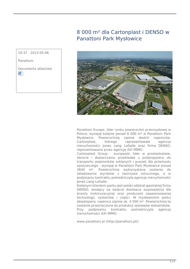 8 000 m² dla Cartonplast i DENSO w Panattoni Park Mysłowice 10:37 2013-05-06 Panattoni Documents attached: Panattoni Europe, lider rynku powierzchni przemysłowej w Polsce, wynajął kolejne ponad 8 000 m² w Panattoni Park Mysłowice. Powierzchnię zajmie dwóch najemców: Cartonplast, którego reprezentowała agencja nieruchomości Jones Lang LaSalle oraz firma DENSO, reprezentowana przez agencję AXI IMMO. Cartonplast Group - europejski lider w przetwórstwie, obrocie i dostarczaniu przekładek z polipropylenu do transportu pojemników szklanych i puszek dla przemysłu spożywczego - wynajął w Panattoni Park Mysłowice ponad 3640 m². Powierzchnia wykorzystana zostanie do składowania wyrobów z tworzywa sztucznego, a w podpisaniu kontraktu pośredniczyła agencja nieruchomości Jones Lang LaSalle. Kolejnym klientem parku jest polski oddział japońskiej firmy DENSO, wiodący na świecie dostawca wyposażenia dla branży motoryzacyjnej oraz producent zaawansowanej technologii, systemów i części. W mysłowickim parku dewelopera, najemca zajmie ok. 4 500 m². Powierzchnia ta zostanie przeznaczona do produkcji zestawów wskaźników. Przy podpisaniu kontraktu pośredniczyła agencja nieruchomości AXI IMMO. www.panattoni.pl (http://panattoni.pl/) 1/1