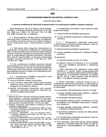 Oziennik Ustaw Nr 63 - 3731 Poz. 589 589 ROZPORZJ\DZENIE MINISTRA ROLNICTWA I ROZWOJU WSP) z dnia 25 marca 2004 r. w sprawie dodatkowych informacji umieszczanych na oznakowaniu srodk6w zywienia zwierzilt 2 ) Na podstawie art. 38 ust. 6 ustawy z dnia 23 sierpnia 2001 r. 0 srodkach iywienia zwierzat (Oz. U. Nr 123, poz. 1350 oraz z 2003 r. Nr 122, poz. 1144 i Nr 208, poz. 2020) zarzadza sie, co nastepuje: § 1. Rozporzqdzenie okresla zakres dodatkowych informacji, ktore rnoqa bye umieszczane na opakowaniu srodkow iywienia zwierzat lub etykiecie dotaczonej do opakowania albo w dokumentach przewozowych. § 2. Informacje, ktore rnoqa bye umieszczane na opakowaniu lub etykiecie dotaczone] do opakowania albo w dokumentach przewozowych srodka iywienia zwlerzat, wvraznie oddziela si~ od informacji okreslonych w rozporzadzeniu Ministra Rolnictwa i Rozwoju Wsi z dnia 27 sierpnia 2003 r. w sprawie oznakowania srodkow iywienia zwierzat (Oz. U. Nr 168, poz. 1642 i Nr 205, poz. 1990). § 3. Na oznakowaniu srodkow iywienia zwierzat wprowadzanych do obrotu.oprocz informacji okreslonych w rozporzadzeniu moina urnieszczac dodatkowe informacje, jeieli stanowia ich uszczeqotowienie i nie wprowadzajq nabywcy w blad co do tozsarnosci srodkow iywienia zwierzat. § 4. 1. Oznakowanie dodatkow paszowych moie zawierac nastepujace informacje: 1) nazwe handlowq dodatku paszowego; 2) imie, nazwisko i ad res albo nazwe i adres siedziby wytworcy, jeieli nie jest on podmiotem wprowadzajqcym ten dodatek do obrotu; 3) sposob bezpiecznego stosowania oraz przeciwwskazania i specjalne wymagania dotvczace stosowania dodatku paszowego. 1) 2) Minister Rolnictwa i Rozwoju Wsi kieruje dziatem administracji rzqdowej - rolnictwo, na podstawie § 1 ust. 2 pkt 1 rozporzqdzenia Prezesa Rady Ministr6w z dnia 29 marca 2002 r. w sprawie szczeg6towego zakresu dziatania Ministra Rolnictwa i Rozwoju Wsi (Oz. U. Nr 32, poz. 305). Przepisy niniejszego rozporzqdzenia wdraiajq do prawa polski ego postanowienia: 1) dyrektywy 96/25/EWG z dnia 29 kwietnia 1996 r. w sprawie obrotu materiatami paszowymi (Oz. Urz. WE L 125 z 23.05.1996, str. 35 in.); 2) dyrektywy 70/524/EWG z dnia 23 listopada 1970 r. w sprawie dodatk6w paszowych (Oz. Urz. WE L 270 z 14.12.1970, str.1 in.); 3) dyrektywy 79/373/EWG z dnia 2 kwietnia 1979 r. w sprawie obrotu mieszankami paszowymi (Oz. Urz. WE L 86 z 6.04.1979, str. 30 in.); 4) dyrektywy 86/174/EWG z dnia 9 kwietnia 1986 r. w spra wie metod obliczania wartosci energetycznej mieszanek paszowych dla drobiu (Oz. Urz. WE L 130 z 16.05.1986, str. 53 i n.). 2. Oznakowanie prerniksow moie zawierac pujace informacje: nast~ 1) nazwe handlowq dodatkow paszowych; 2) numery dodatkow paszowych w Rejestrze Wspolnotowym. § 5. 1. Oznakowanie mieszanek paszowych, w sktad ktorvch wchodzq dodatki paszowe, moie zawierac nastepujace informacje: 1) nazwe handlowq dodatkow paszowych; 2) numery dodatkow paszowych w Rejestrze Wspolnotowym; 3) zawartosc: a) rnikroelernentow innych niz miedz, b) witamin innych niz witaminy A, 0 i E, prowitamin oraz dodatkow paszowych 0 podobnym dziataniu - jeieli zawartosc tych substancji moie zostac okreslona w wyniku badari przeprowadzonych przy uiyciu metodyk postepowanla analitycznego, okreslonvch w przepisach wydanych na podstawie art. 44 ust. 7 pkt 2 ustawy z dnia 23 sierpnia 2001 r. 0 srodkach iywienia zwierzqt. 2. Oprocz informacji, 0 ktorvch mowa w ust. 1, oznakowanie mieszanek paszowych, w sktad ktorvch wchodzq dodatki paszowe, moie zawierac nastepujace informacje: 1) w przypadku rnikroelernentow innych nii rniedz: a) nazwe dodatku paszowego zgodnie z wpisem w Rejestrze Wspolnotowym, b) zawartosc rnikroelernentow: 2) w przypadku witamin innych nii witaminy A, 0 i E, prowitamin oraz dodatkow paszowych 0 podobnym dziataniu: a) nazwe dodatku paszowego zgodnie z wpisem w Rejestrze Wspolnotowym, b) zawartosc substancji czynnej oraz date uptywu okresu trwatosci, § 6. Oznakowanie mieszanek paszowych moie zawierac nastepujace informacje: 1) imie, nazwisko i adres albo nazwe i adres siedziby wytworcy mieszanki paszowej, jeieli nie jest on podmiotem wprowadzajqcym te rnieszanke do obrotu: Dziennik Ustaw Nr 63 - 3732- 2) nazwe panstwa, w kt6rym wytworzono mieszanke paszowq; 3) cene mieszanki paszowej; Poz. 589 § 8. Dodatkowe informacje, kt6re mogq bye umieszczane na opakowaniu lub etykiecie dotqczonej do opakowania albo w dokumentach przewozowych mieszanek paszowych, sa okreslone w zataczniku nr 2 do rozporzadzenla. 4) opis lub nazwe handlowq mieszanki paszowej; 5) okreslenie stanu fizycznego mieszanki lub zastosowanego procesu technologicznego; 6) zawartosc wody i zanieczvszczen mineralnych w przypadku niiszych ich zawartosci, niz okreslone w § 13 ust. 1 pkt 5 i 6 rozporzadzenla, 0 kt6rym mowa w § 2; § 9. W przypadku mieszanek paszowych przeznaczonych dla zwierzqt domowych, oznakowanie rnoze zawierac nastepujace informacje: 1) deklaracje wskazujaca obecnosc lub poziom jednego lub kilku materiat6w paszowych istotnych dla okreslenia wtasclwosci tej mieszanki; 2) 7) date wytworzenia mieszanki paszowej, podajac dzien, rniesiac i rok - w przypadku gdy jest wymag any minimalny okres przechowywania. a) obok deklaracji, 0 kt6rej mowa w pkt 1; b) w wykazie materiat6w paszowych wchodzacych w sktad mieszanki paszowej, obok odpowiedniej kategorii materiat6w paszowych. § 7. Oznakowanie mieszanek paszowych petnopor- cjowych lub mieszanek uzupetniajqcych innych niz mineralne i melasowane, przeznaczonych dla drobiu, swin i przeiuwaczy rnoze zawierac informacje 0 wartosci energetycznej tych mieszanek, jeieli wartosc ta jest obliczana zgodnie z metodami okreslonvmi w zatqczniku nr 1 do rozporzadzenla. zawartosc minimalnq lub maksymalnq materiatu paszowego wvrazona w procentach, kt6ra jest umieszczona: § 10. Rozporzqdzenie wchodzi w iycie po uptywie 30 dni od dnia ogtoszenia. Minister Rolnictwa i Rozwoju Wsi: W. Olejniczak Zatqczniki do rozporzqdzenia Ministra Rolnictwa i Rozwoju Wsi z dnia 25 marca 2004 r. (poz. 589) Zatllc