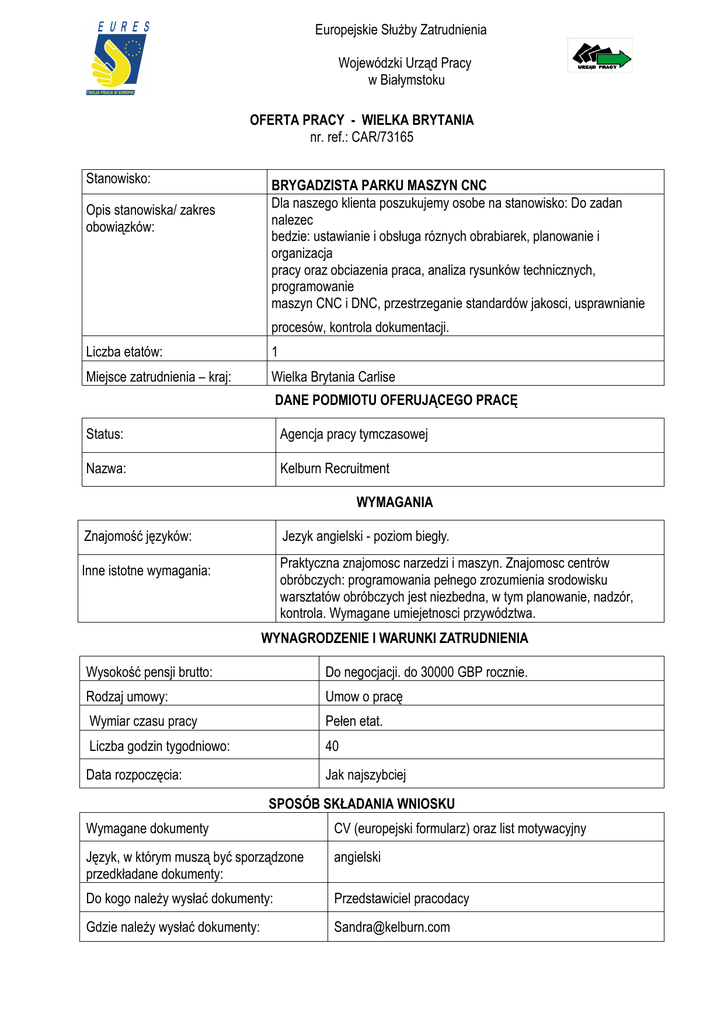 OFERTA PRACY - WIELKA BRYTANIA nr. ref.: CAR/73165