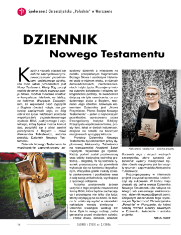 Społeczność Chrześcijańska „Południe” w Warszawie Dziennik K fot. dzienniknowego.pl ażdy z nas lubi otaczać się dobrze zaprojektowanymi, nowoczesnymi przedmiotami codziennego użytku. Dla mnie takim przedmiotem jest Nowy Testament. Kiedy Bóg zaczął realnie do mnie mówić poprzez swoje Słowo, robiłam mnóstwo notatek: w komputerze, telefonie, na tablicy, na lodówce. Wszędzie. Zauważy łam, że większość osób żyjących z Bogiem również notuje, ma potrzebę zapisywania tego, co Bóg robi w ich życiu. Widziałam potrzebę współcześnie zaprojektowanego wydania Biblii, praktycznego i czytelnego, którą będzie można komuś dać, podzielić się z kimś swoimi przeżyciami z Bogiem – mówi Aleksandra Tubielewicz, autorka projektu Dziennik Nowego Tes tamentu. Dziennik Nowego Testamentu to współcześnie zaprojektowany ze 14 szytowy dziennik z miejscem na notatki, przeplatanym fragmentami Bożego Słowa i osobistymi historia mi osób w różnym wieku, o różnych doświadczeniach, zainteresowa niach i stylu życia. Poznajemy imio na autorów świadectw i widzimy ich litograficzne portrety. Te świadectwa dotyczą nie tyle nawrócenia, co co dziennego życia z Bogiem, real ności Jego obietnic. Głównym ele mentem Dziennika jest „Nowe Przymierze. Pismo Święte Nowego Testamentu” – jeden z najnowszych przekładów, opracowany przez Ewangeliczny Instytut Biblijny. Przejrzysta współczesna forma, pro sty font, tekst w dwóch kolumnach, miejsce na notatki na bocznych marginesach sprzyjają lekturze. Prototyp Dziennika Nowego Testamentu był elementem pracy dy plomowej Aleksandry Tubielewicz na warszawskiej Akademii Sztuk Pięknych. Wykonała go ręcznie. Każdy portret został przetworzony oraz odbity tradycyjną techniką gra ficzną – litografią. W tej technice ry sunek przeznaczony do powielania wykonuje się na kamieniu litograficz nym. Wszystkie grafiki i teksty zosta ły zeskanowane i poukładane wraz z całą swoją unikalnością, wynikającą z ręcznego odbijania. Autorka postanowiła jednak uczynić z tego projektu nowoczesną formę Biblii, która będzie zachęcają ca i przystępna nie tylko dla ludzi, którzy czytają ją na co dzień. W mar cu br. udało się wydać w niewielkim nakładzie wersję skróconą – Dziennik Ewangelii według św. Jana. Była to swego rodzaju próba generalna przed wydaniem całości. – Próba druku, łamania, okładek, SŁOWO i ŻYC IE n r 2/2016 fot. dzienniknowego.pl Nowego Testamentu Aleksandra Tubielewicz – autorka projektu tłoczenia loga i innych ważnych szczegółów, które sprawią że Dziennik wydany maszynowo będzie równie oryginalny jak ten uszyty ręcznie – zapowiadała Aleksandra Tubielewicz. Rozpropagowany w internecie projekt pozyskał sponsorów i zakoń czył się sukcesem. W końcu maju ukazała się pełna wersja Dziennika Nowego Testamentu (do nabycia na Allegro lub zamawiając elektronicz nie: [email protected]). Oficjalnym mecenasem tego wyda nia jest Społeczność Chrześcijańska „Południe” w Warszawie, do której należą również autorzy zawartych w Dzienniku świadectw i autorka projektu. NINA HURY