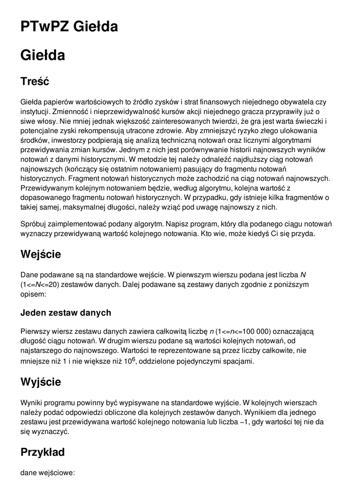 PTwPZ Giełda Giełda Treść Giełda papierów wartościowych to źródło zysków i strat finansowych niejednego obywatela czy instytucji. Zmienność i nieprzewidywalność kursów akcji niejednego gracza przyprawiły już o siwe włosy. Nie mniej jednak większość zainteresowanych twierdzi, że gra jest warta świeczki i potencjalne zyski rekompensują utracone zdrowie. Aby zmniejszyć ryzyko złego ulokowania środków, inwestorzy podpierają się analizą techniczną notowań oraz licznymi algorytmami przewidywania zmian kursów. Jednym z nich jest porównywanie historii najnowszych wyników notowań z danymi historycznymi. W metodzie tej należy odnaleźć najdłuższy ciąg notowań najnowszych (kończący się ostatnim notowaniem) pasujący do fragmentu notowań historycznych. Fragment notowań historycznych może zachodzić na ciąg notowań najnowszych. Przewidywanym kolejnym notowaniem będzie, według algorytmu, kolejna wartość z dopasowanego fragmentu notowań historycznych. W przypadku, gdy istnieje kilka fragmentów o takiej samej, maksymalnej długości, należy wziąć pod uwagę najnowszy z nich. Spróbuj zaimplementować podany algorytm. Napisz program, który dla podanego ciągu notowań wyznaczy przewidywaną wartość kolejnego notowania. Kto wie, może kiedyś Ci się przyda. Wejście Dane podawane są na standardowe wejście. W pierwszym wierszu podana jest liczba N (1<=N<=20) zestawów danych. Dalej podawane są zestawy danych zgodnie z poniższym opisem: Jeden zestaw danych Pierwszy wiersz zestawu danych zawiera całkowitą liczbę n (1<=n<=100 000) oznaczającą długość ciągu notowań. W drugim wierszu podane są wartości kolejnych notowań, od najstarszego do najnowszego. Wartości te reprezentowane są przez liczby całkowite, nie mniejsze niż 1 i nie większe niż 106, oddzielone pojedynczymi spacjami. Wyjście Wyniki programu powinny być wypisywane na standardowe wyjście. W kolejnych wierszach należy podać odpowiedzi obliczone dla kolejnych zestawów danych. Wynikiem dla jednego zestawu jest przewidywana wartość kolejnego notowania lub liczba −1, gdy wartości tej nie da się wyznaczyć. Przykład dane wejściowe: 4 4 1224 6 111211 6 132323 4 1212 wynik: -1 2 2 1